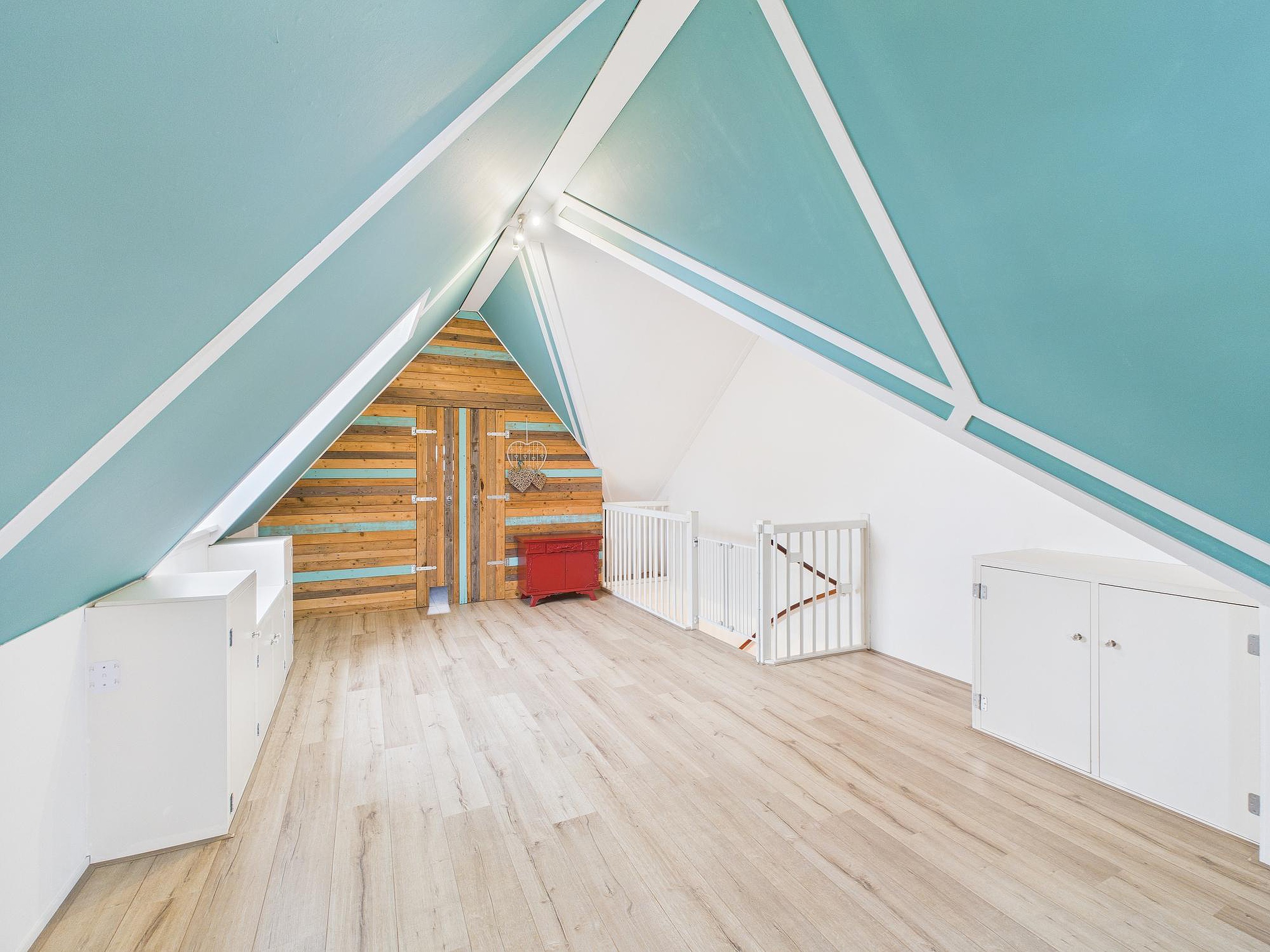 Tweede verdieping De tweede verdieping is bereikbaar middels een vast trap. Door middel van twee mooie houten klapdeuren is de ruimte gescheiden in twee delen. Het voorste gedeelte kan gebruikt worden als slaapkamer of hobbyruimte. Door de dakkapel is de zolder extra licht en ruim en geeft zelfs de mogelijkheid om deze nog op te delen in twee slaapkamers. Achter de houten deuren bevindt zich de technische ruimte met de warmtepomp en de aansluiting voor de wasmachine.