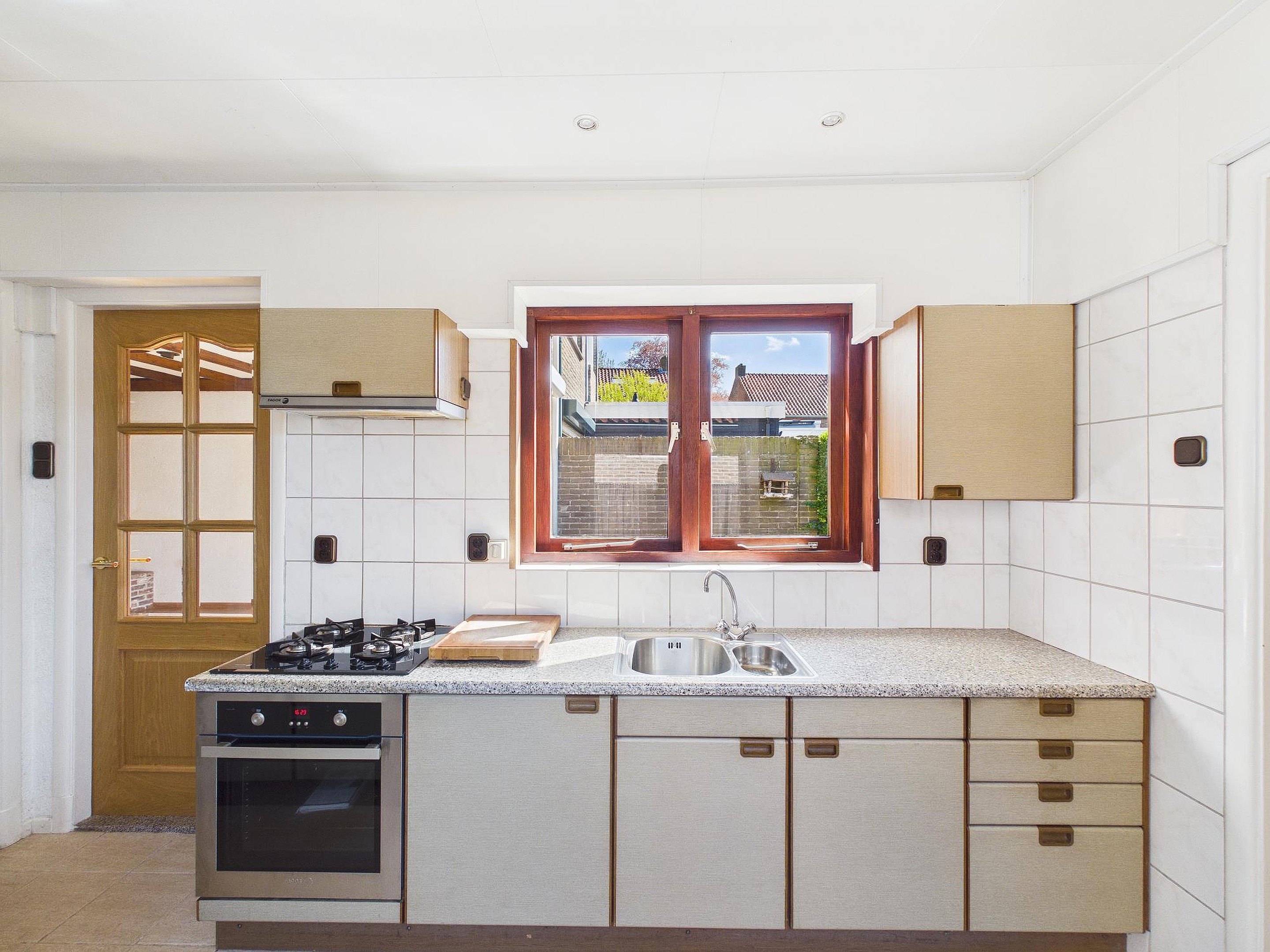 Vanuit de gang en de woonkamer is de keuken bereikbaar. Deze is voorzien van een gasfornuis, afzuigkap en een oven. De keuken geeft toegang tot de bijkeuken die extra praktische ruimte biedt en toegang geeft tot het toilet en de garage. Tevens is hier een achterdeur aanwezig richting de tuin. De garage beschikt over een elektrische deur naar de oprit.