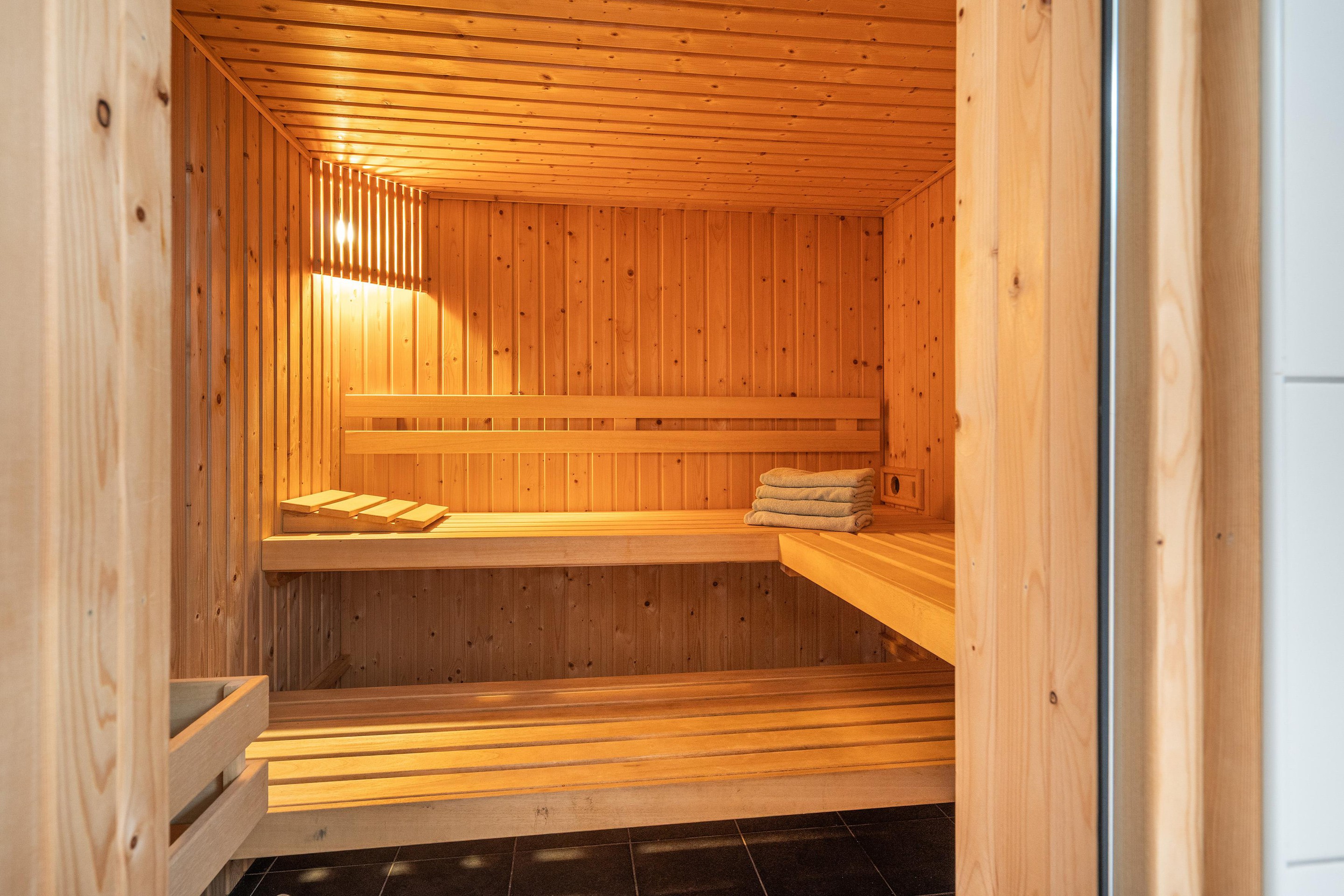 Het souterrain beschikt over drie slaapkamers, een sauna en een moderne badkamer – een luxe die het recreatieve verblijf naar een hoger niveau tilt. Daarnaast is ook deze woonlaag prettig licht en ruim opgezet.