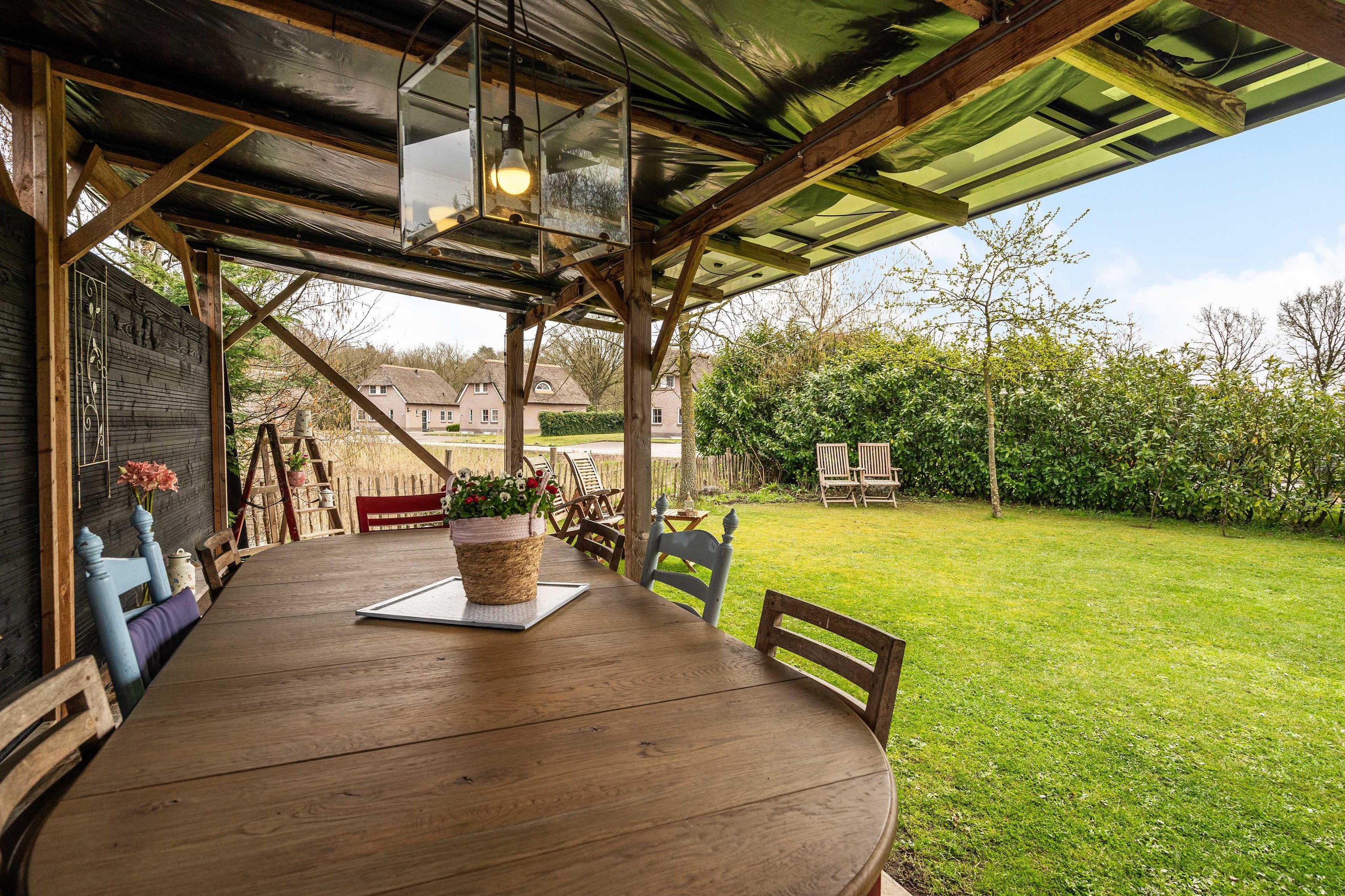 De tuin rondom de woning is verzorgd aangelegd en biedt meerdere terrassen. Hierdoor is er altijd een fijne plek in de zon of juist in de schaduw te vinden. De groene omgeving zorgt voor rust, privacy en een echt vakantiegevoel.
