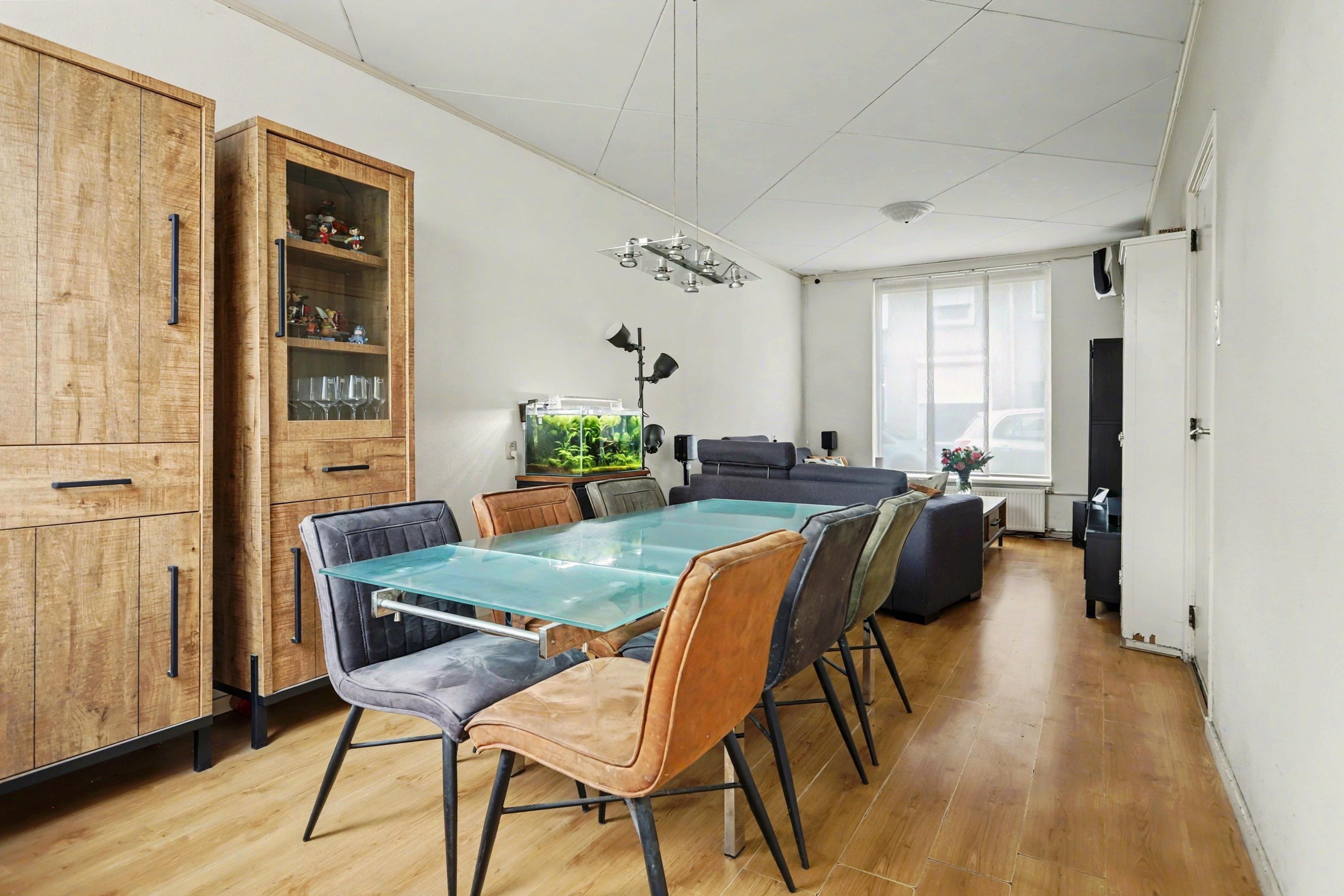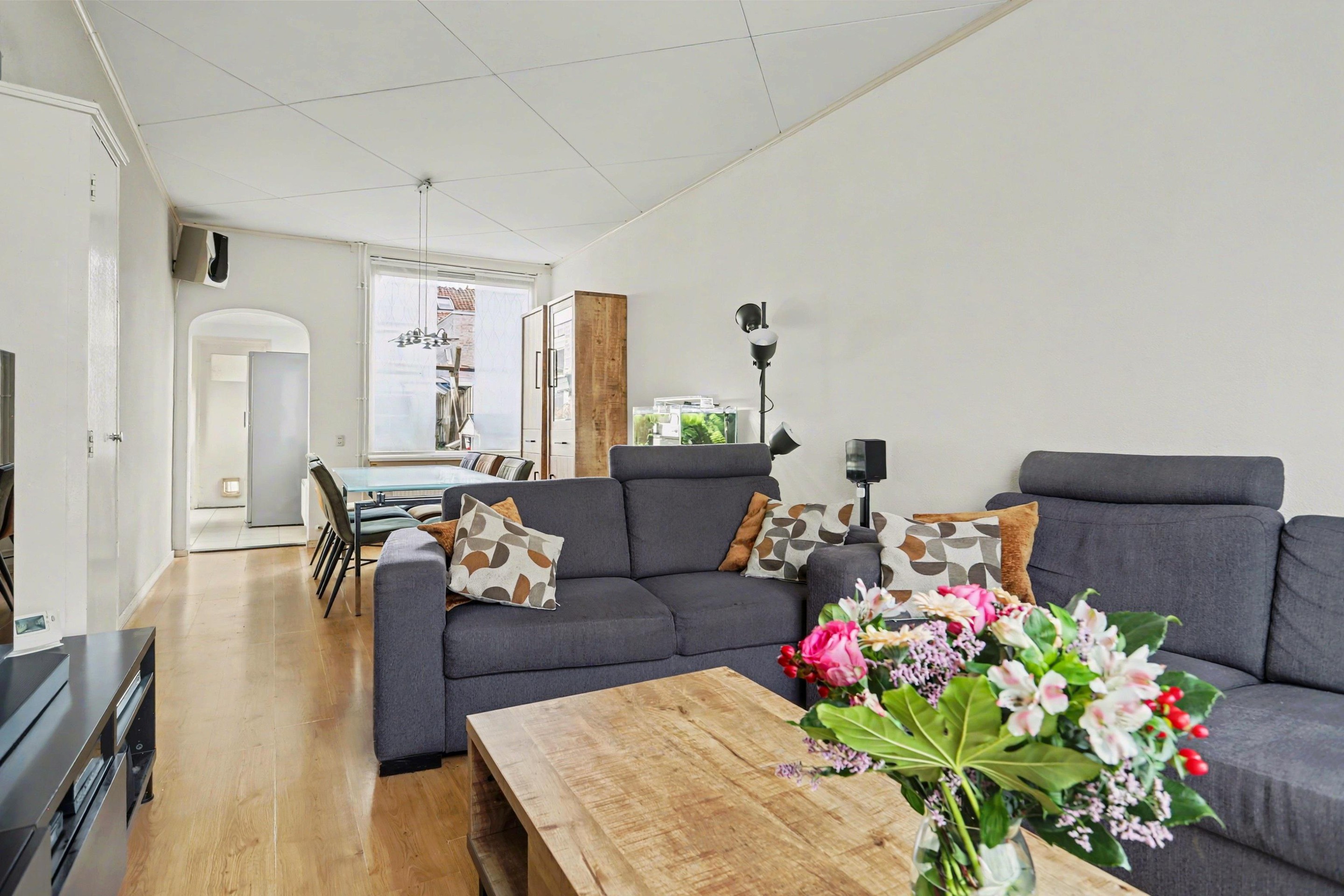De woonkamer is uitgevoerd als doorzonwoonkamer, waardoor er de hele dag door prettig daglicht binnenvalt en een lichte, ruimtelijke sfeer ontstaat. De ruimte is praktisch ingedeeld met een zitgedeelte aan de voorzijde en een eetgedeelte aan de achterzijde. De kunststof kozijnen zijn voorzien van HR++ glas voor extra comfort en goede isolatie. Aan de voorzijde is een rolluik geplaatst en de woonkamer is afgewerkt met een nette laminaatvloer.