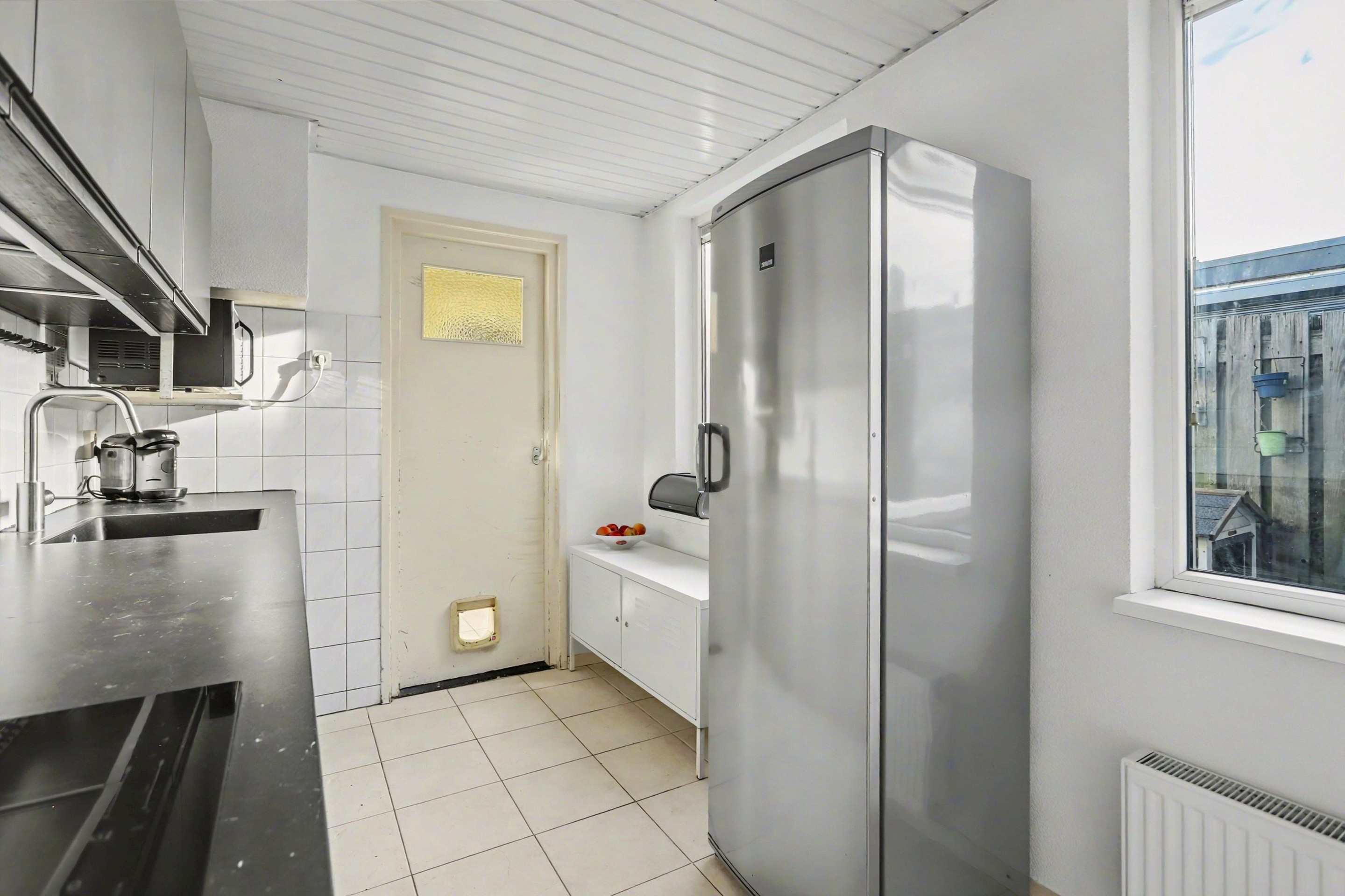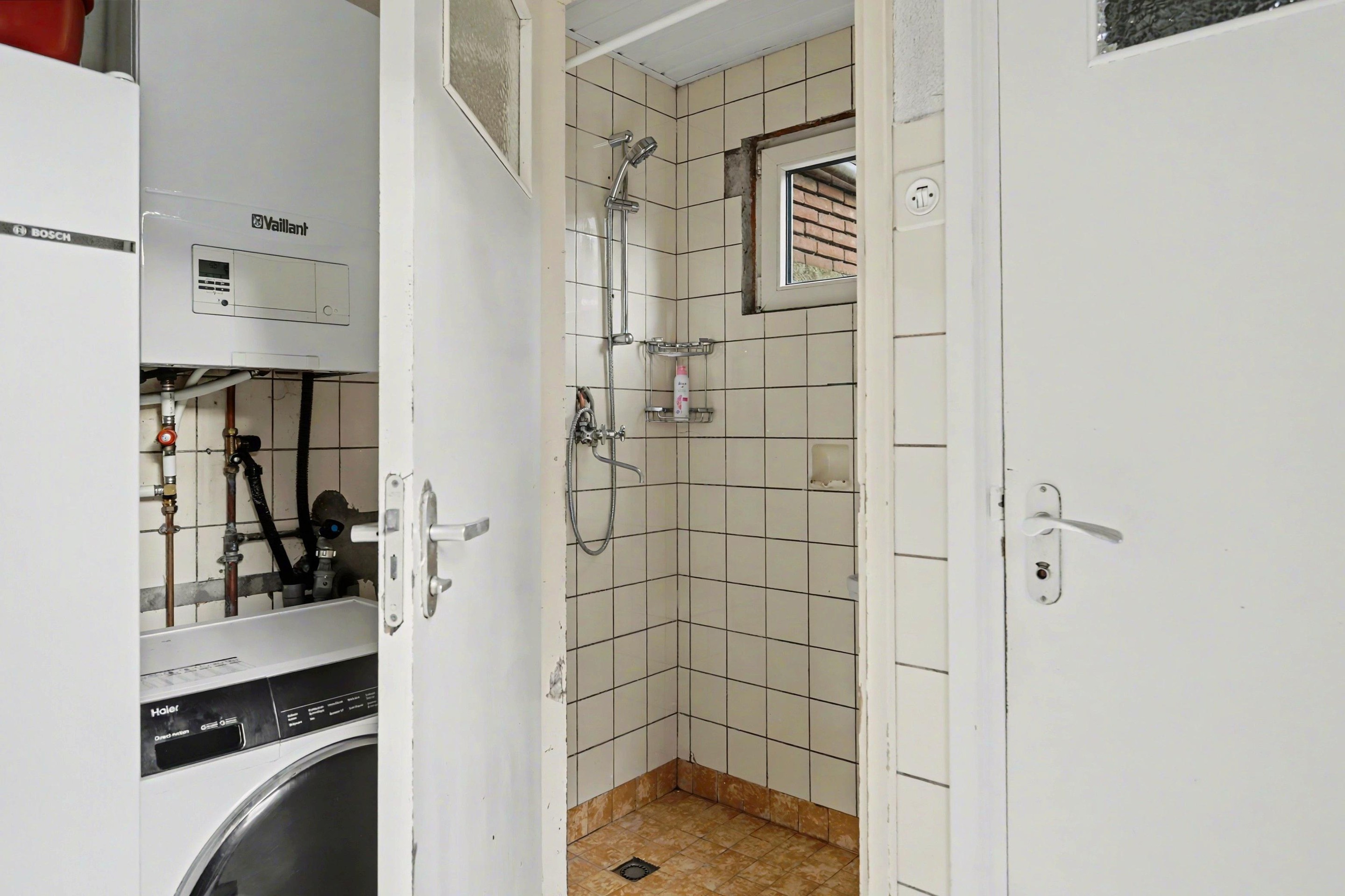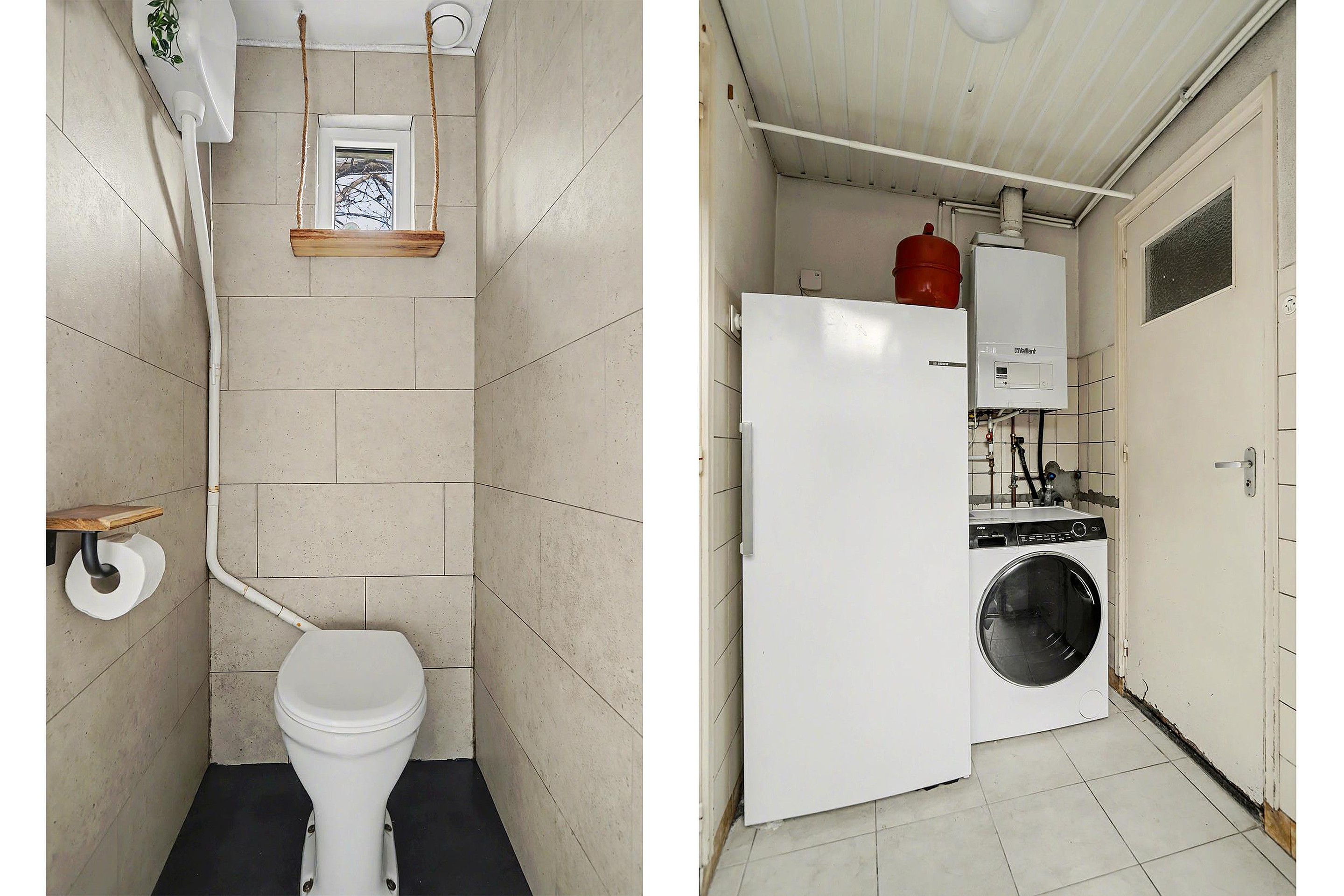 Vanuit de keuken bereik je de bijkeuken, waar zowel de aansluitingen voor de wasmachine als de cv-opstelling zijn geplaatst. Deze ruimte biedt toegang tot het separate toilet en de badkamer. Zowel de keuken als de bijkeuken zijn, net als het toilet en de badkamer, afgewerkt met een tegelvloer. Vanuit de bijkeuken is er bovendien een deur naar de tuin.