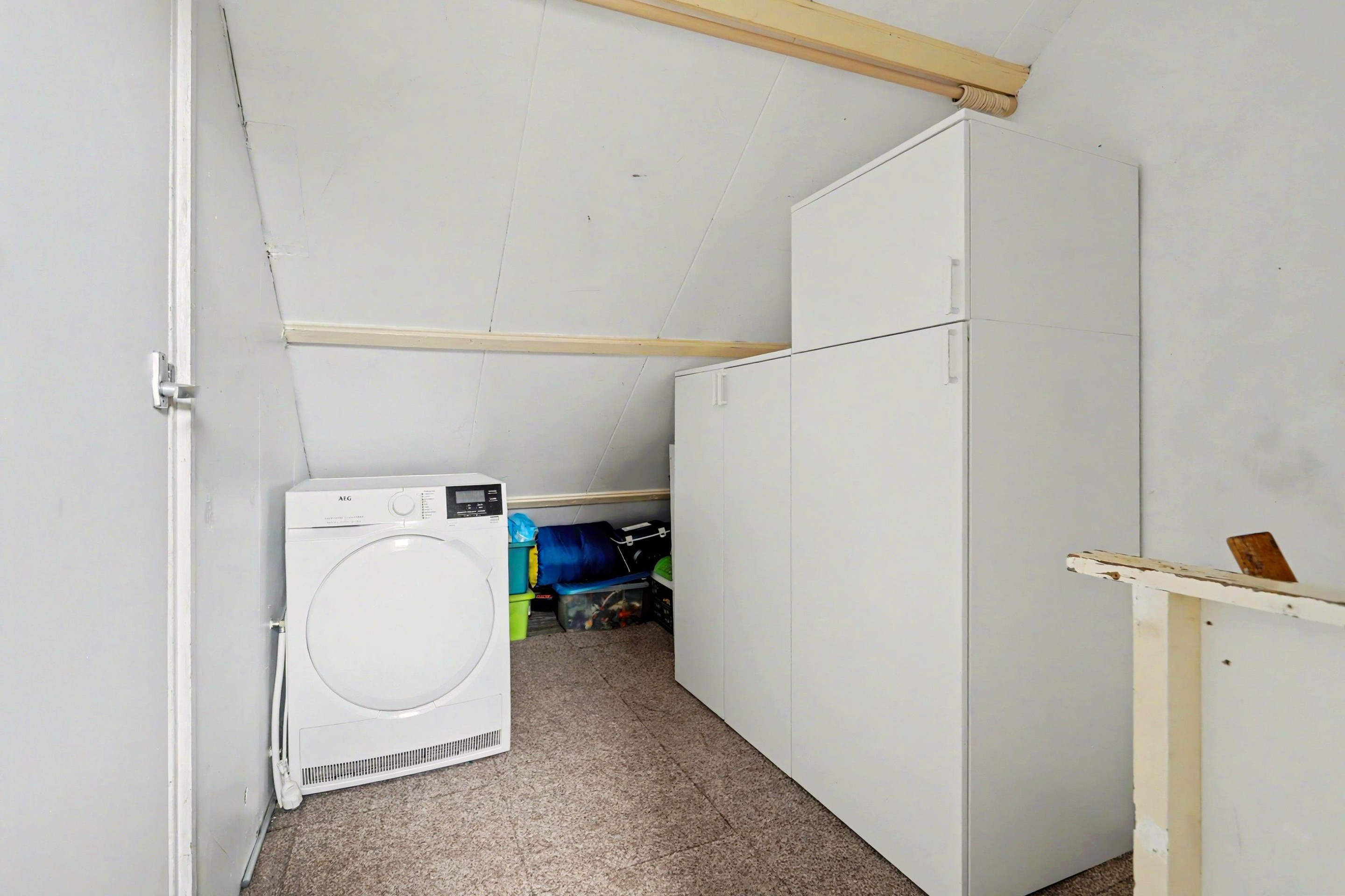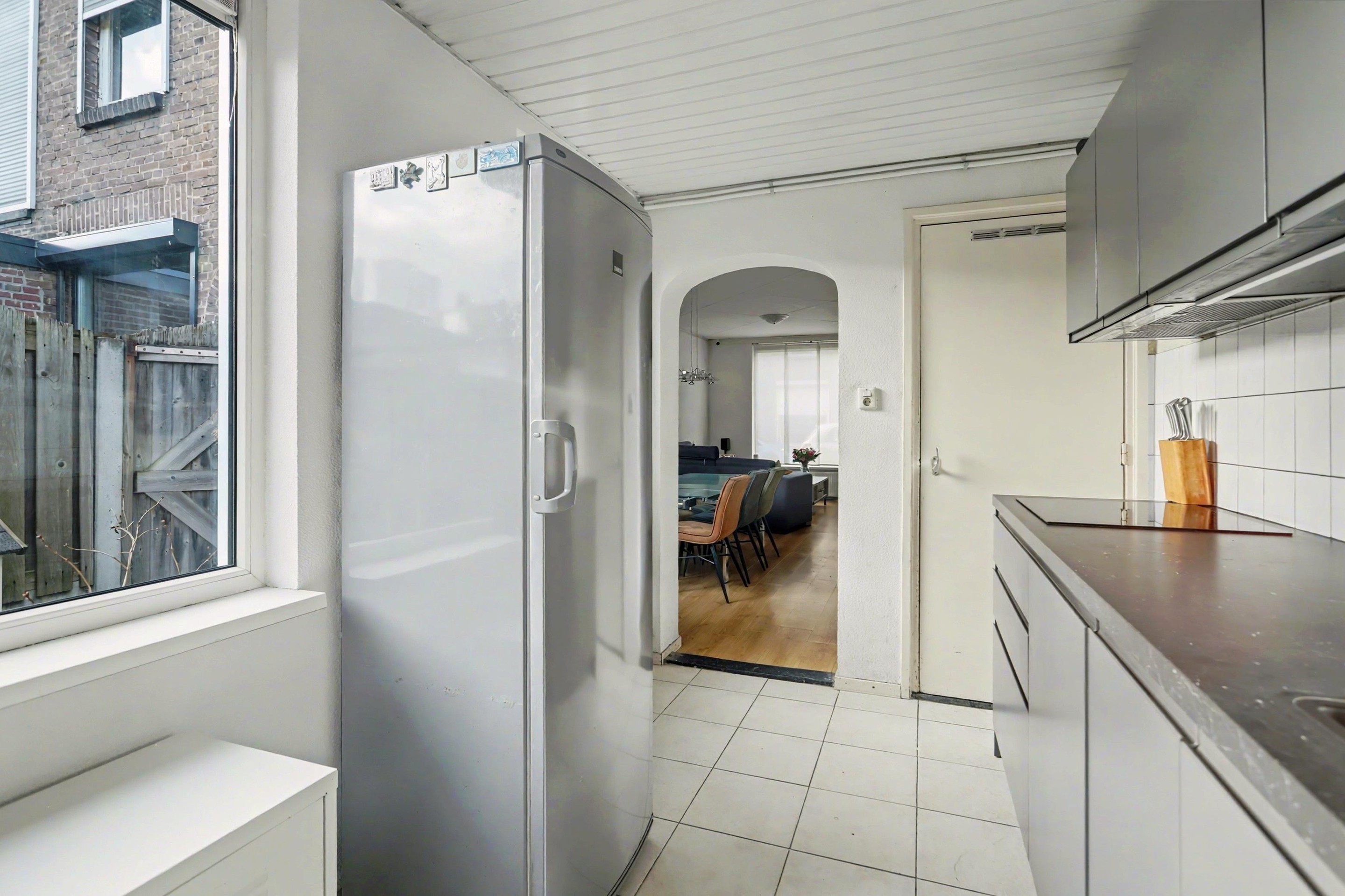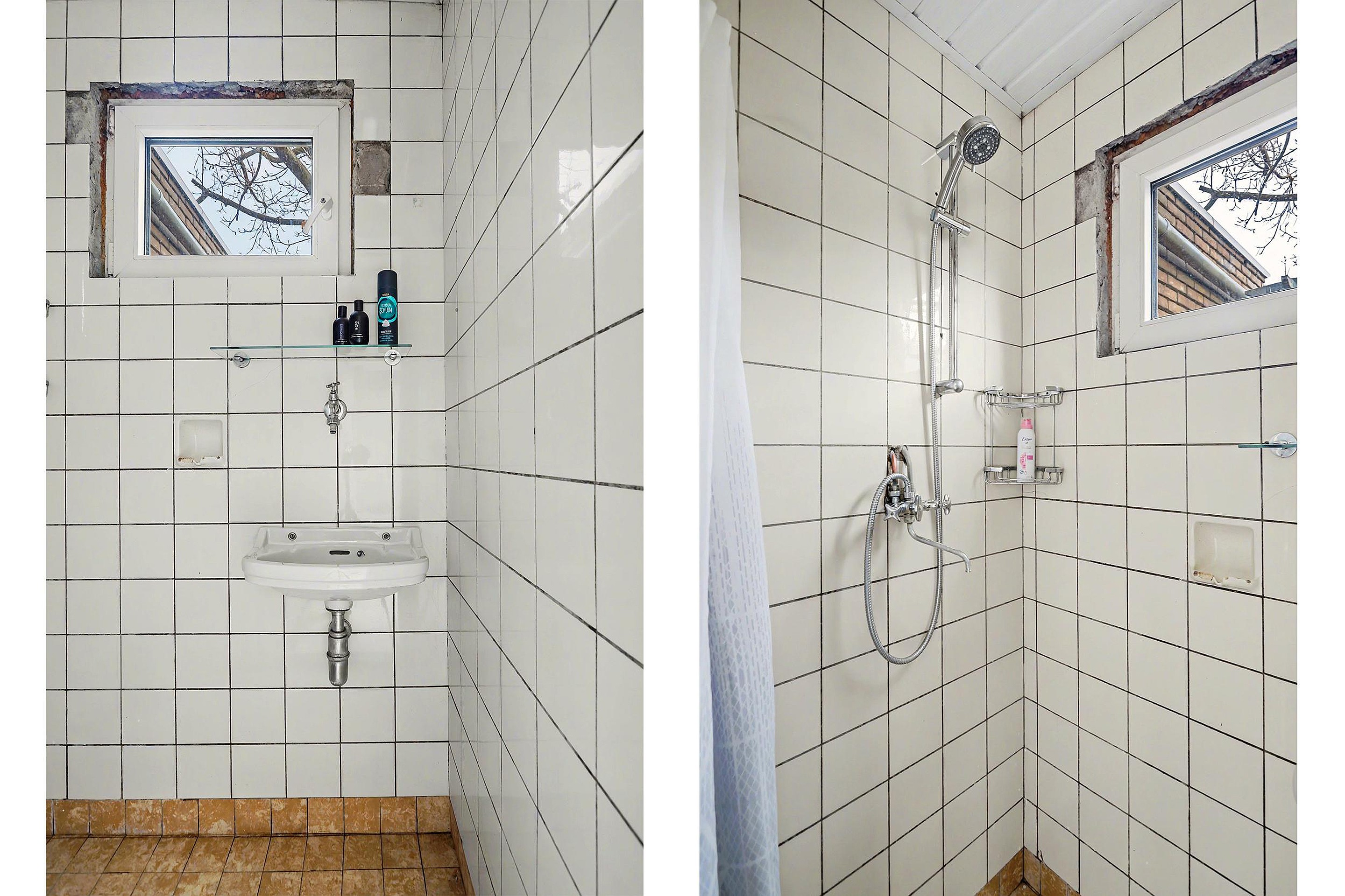 Vanuit de keuken bereik je de bijkeuken, waar zowel de aansluitingen voor de wasmachine als de cv-opstelling zijn geplaatst. Deze ruimte biedt toegang tot het separate toilet en de badkamer. Zowel de keuken als de bijkeuken zijn, net als het toilet en de badkamer, afgewerkt met een tegelvloer. Vanuit de bijkeuken is er bovendien een deur naar de tuin.
