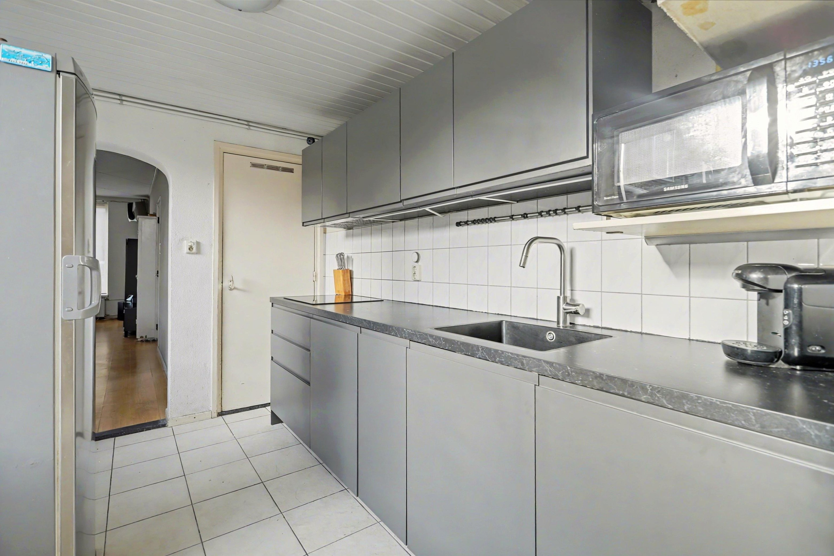 De moderne keuken staat in halfopen verbinding met de woonkamer en is uitgerust met diverse inbouwapparatuur, waaronder een vaatwasser, inductiekookplaat en afzuigkap, aangevuld met praktische bovenkasten. Vanuit de keuken is er toegang tot de trapkast, die zorgt voor extra en handige bergruimte.