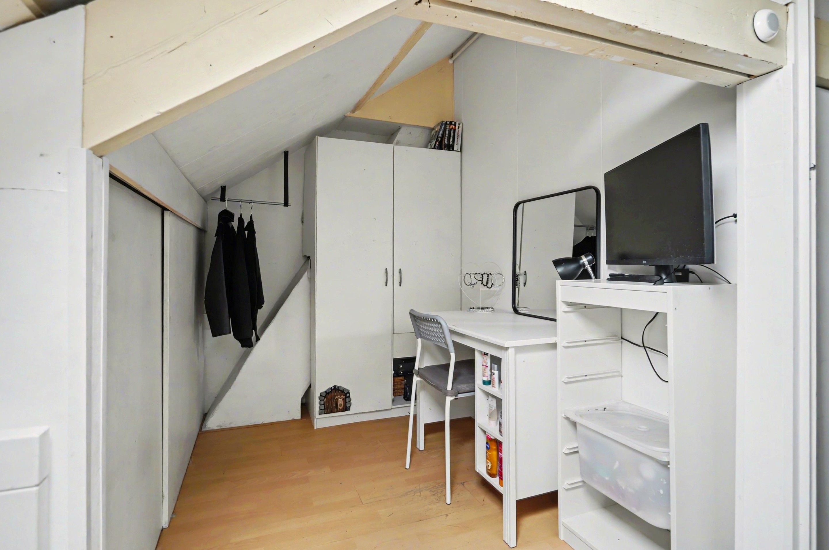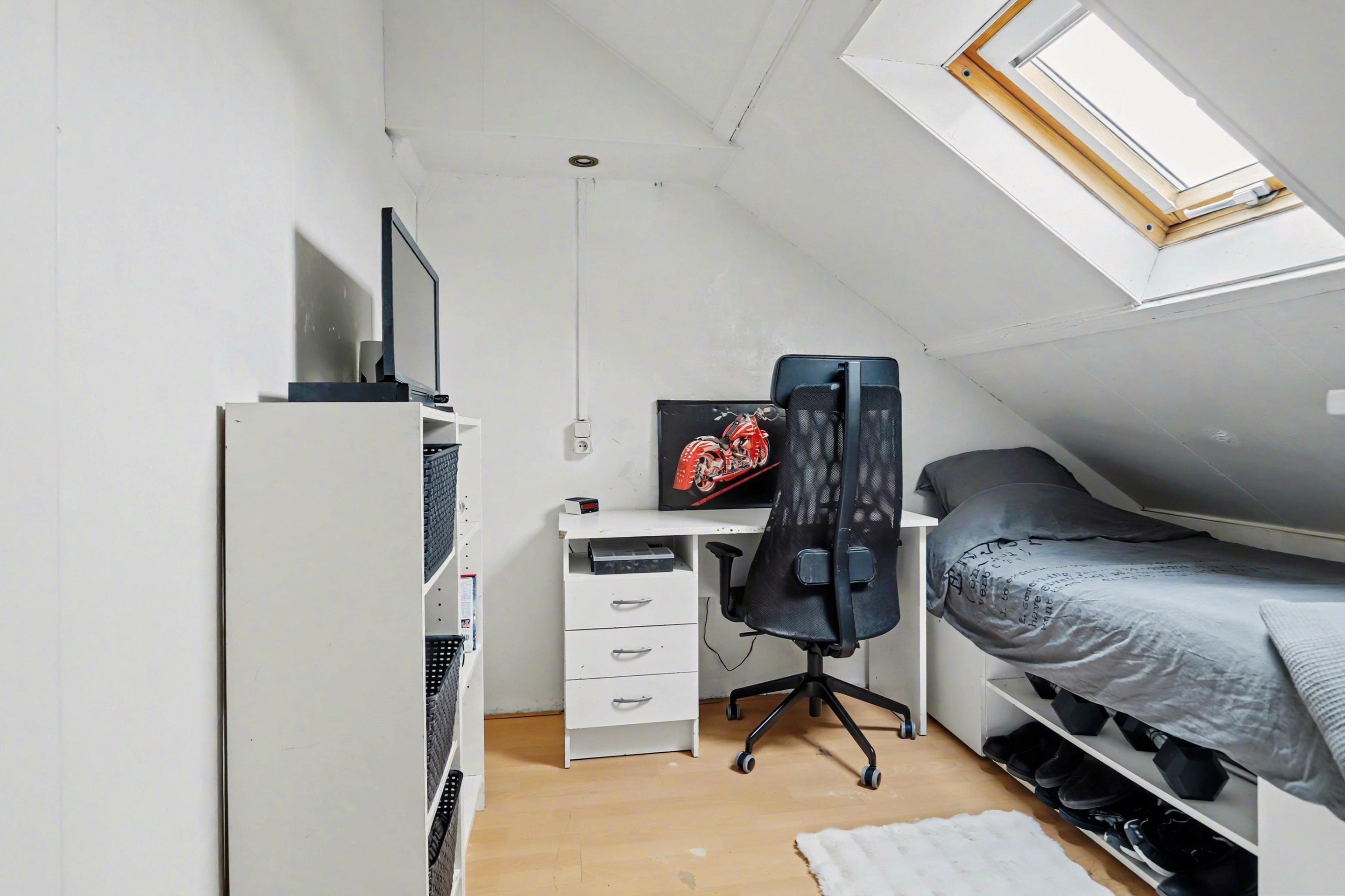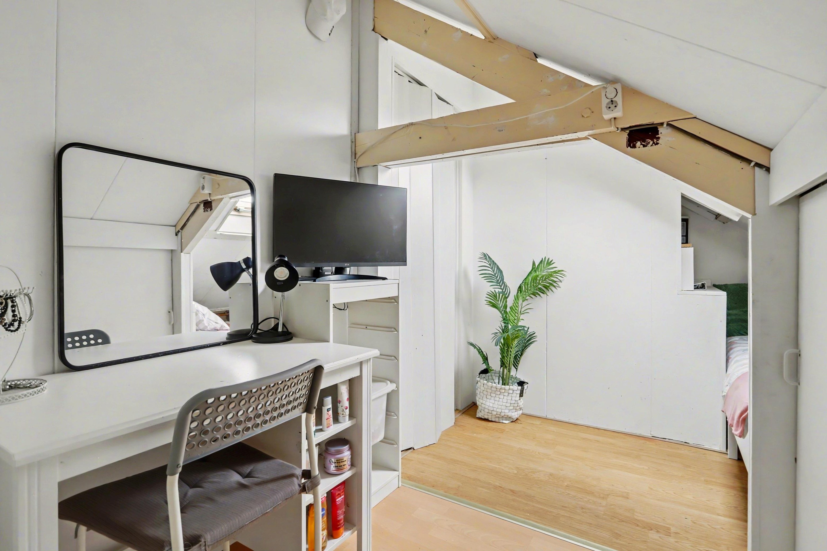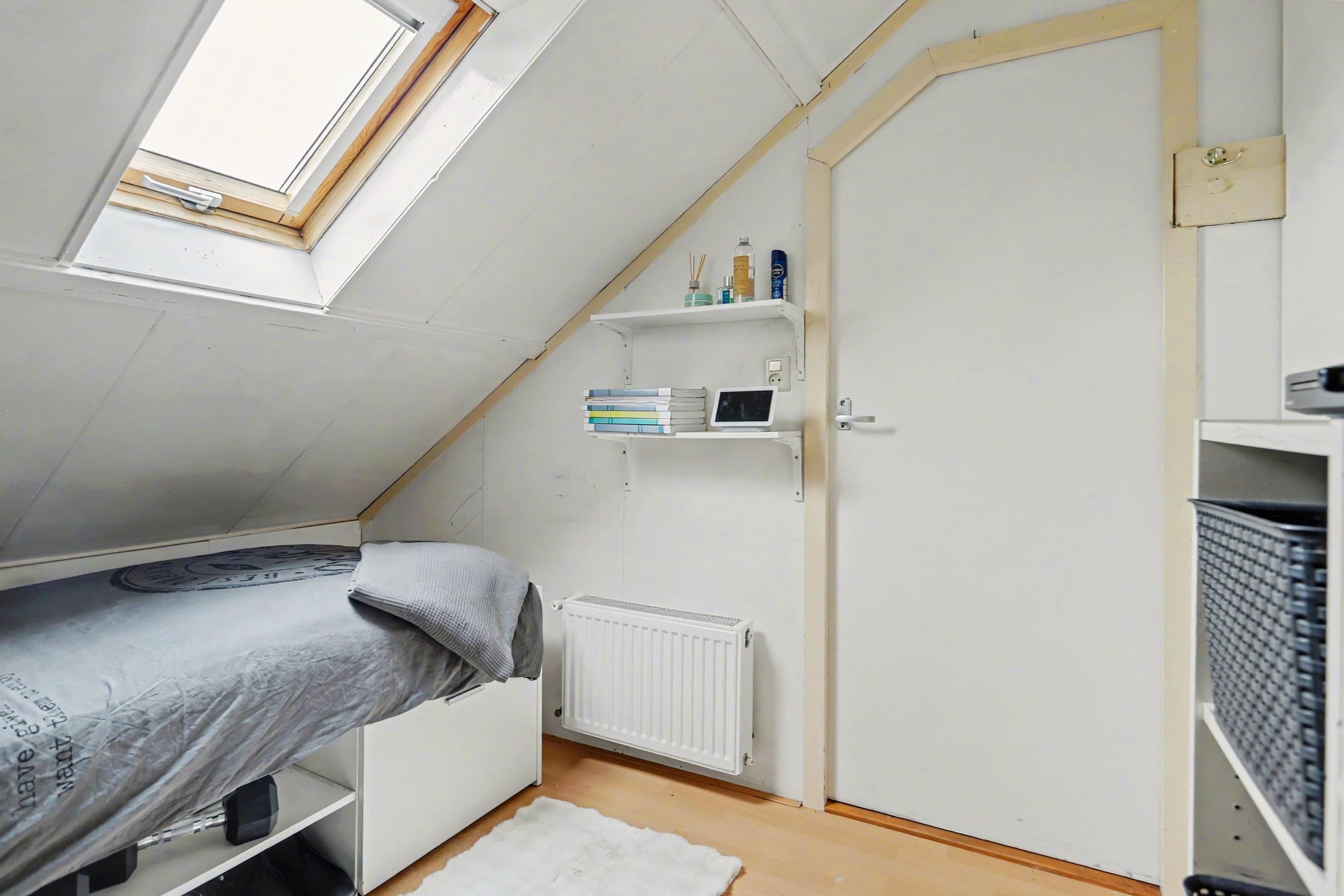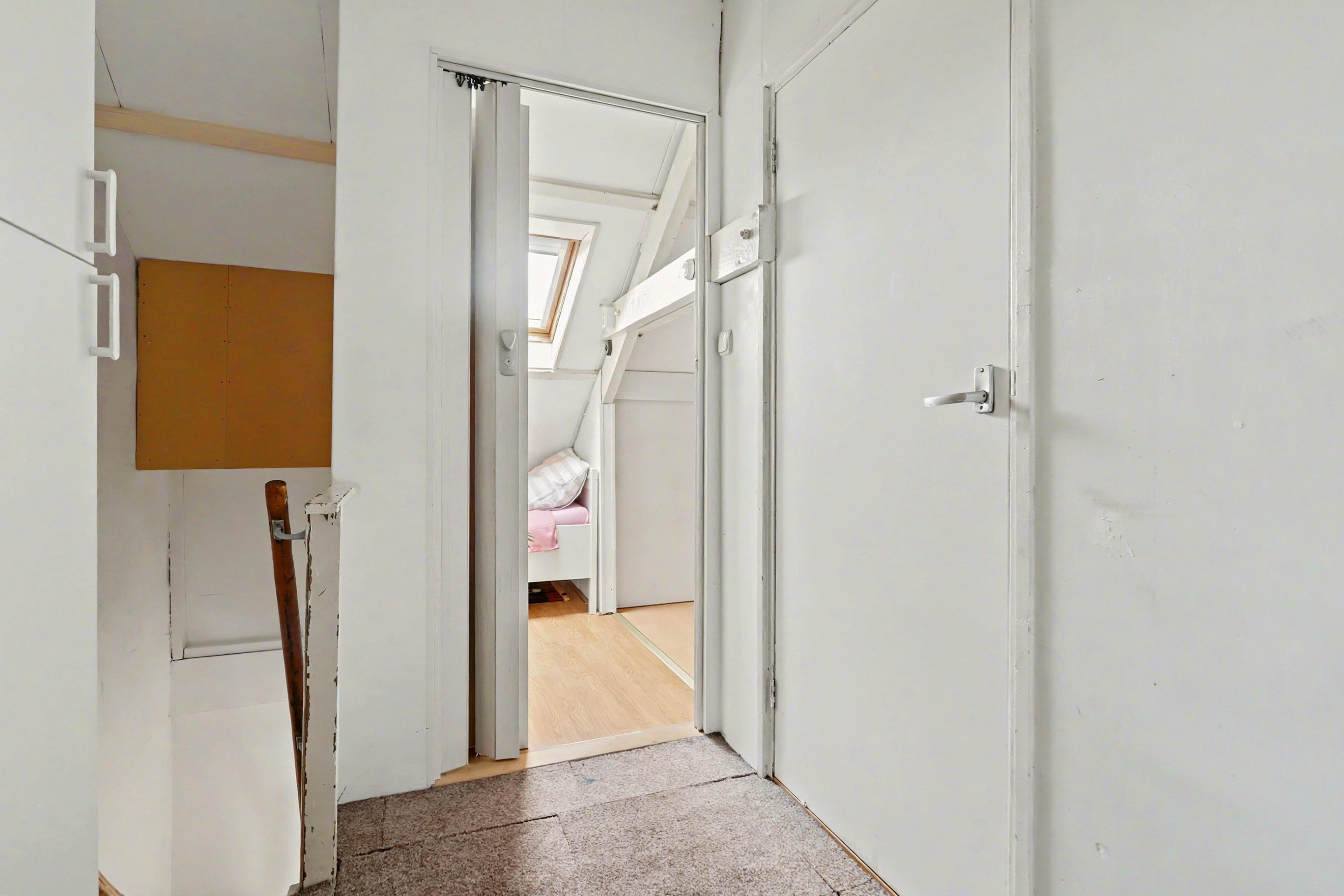 Vanaf de overloop bereik je via een vaste trap de zolderverdieping. Hier bevinden zich nog twee slaapkamers, één aan de voorzijde en één aan de achterzijde. Beide kamers zijn voorzien van een dakraam en afgewerkt met een laminaatvloer.