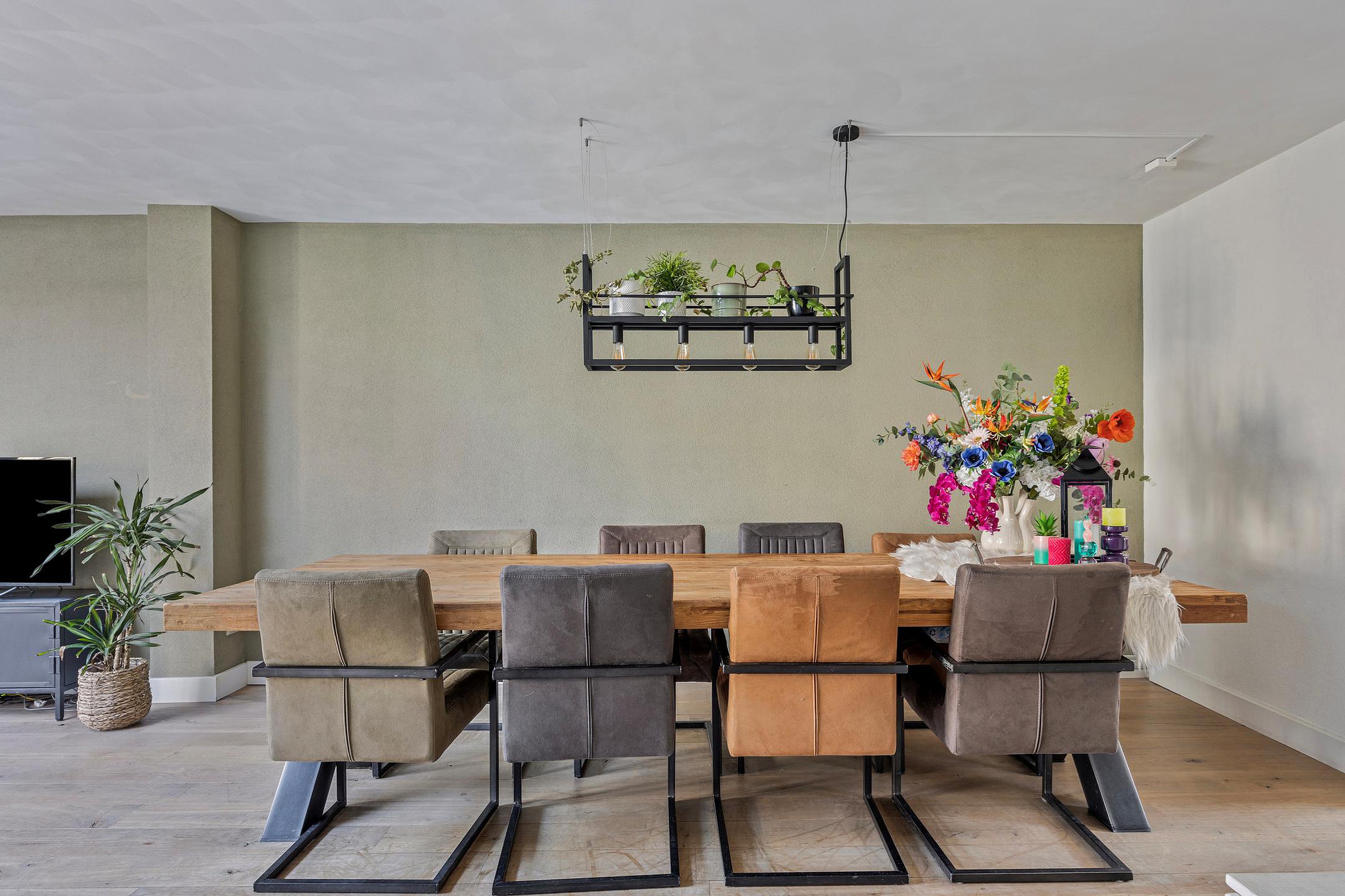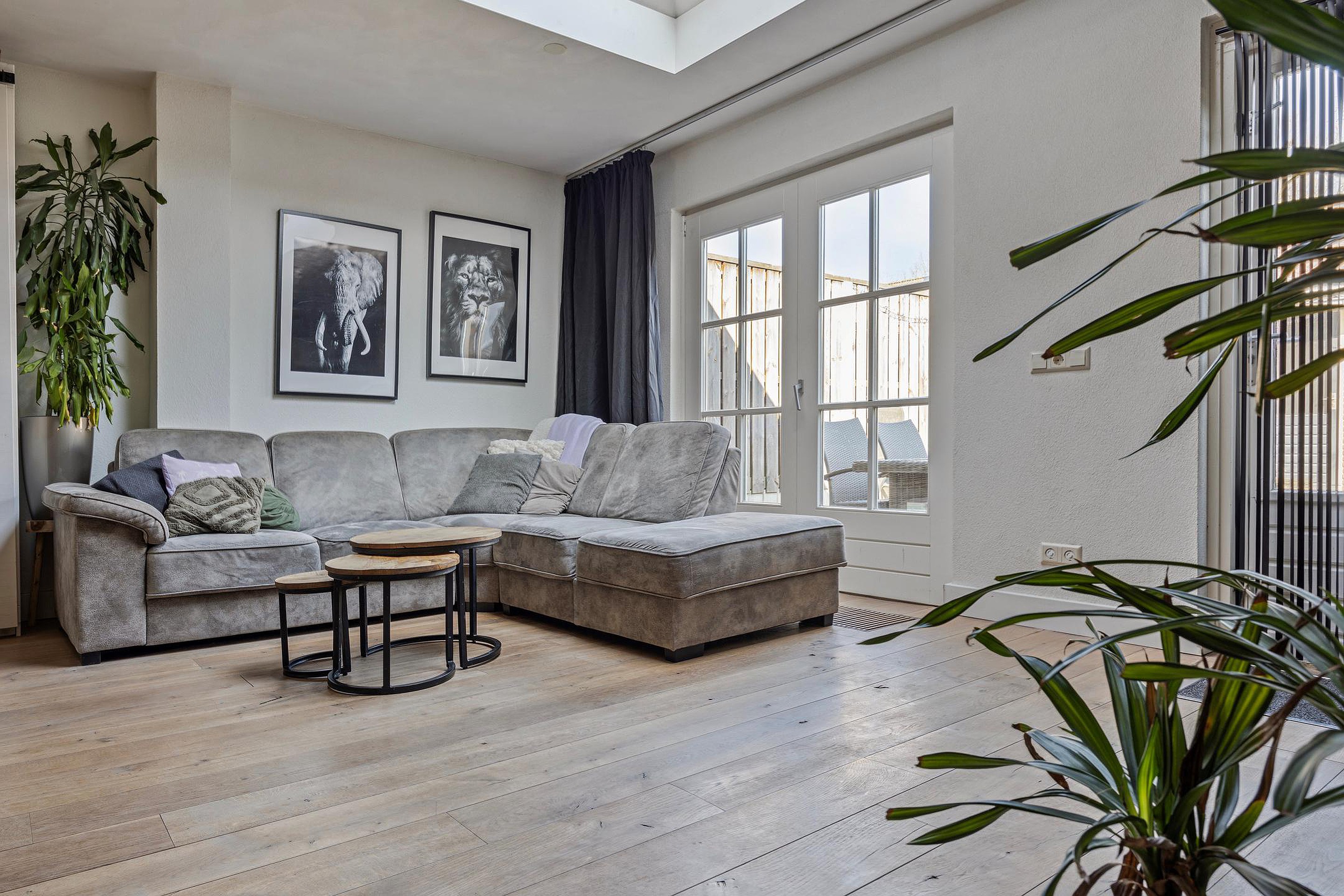 De uitgebouwde woonkamer is een echte blikvanger: strak gestucte wanden, een mooie houten vloer, openslaande tuindeuren én een lichtkoepel die de ruimte laat baden in daglicht. Hier geniet je elke dag van een frisse, lichte en ruime leefruimte.
