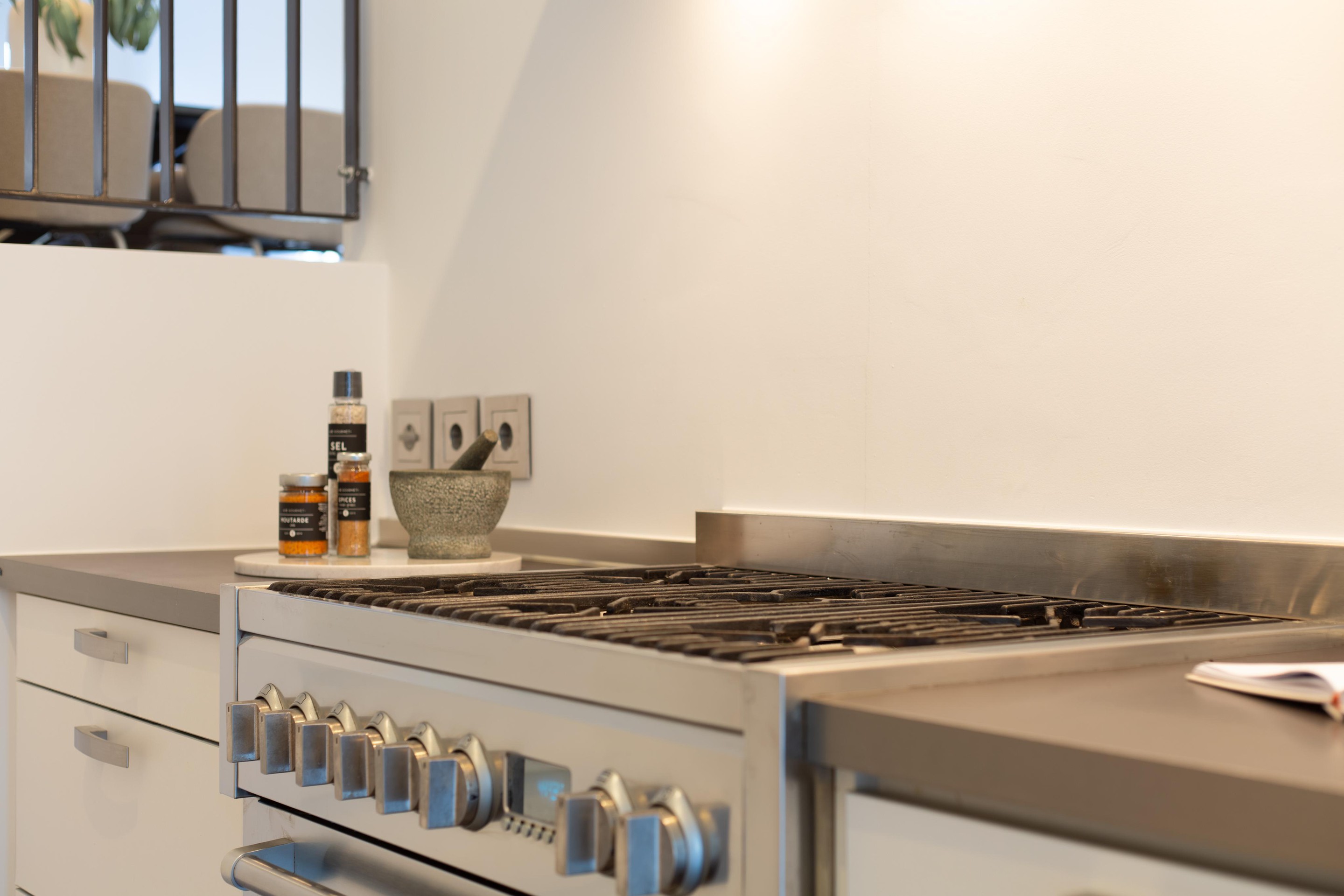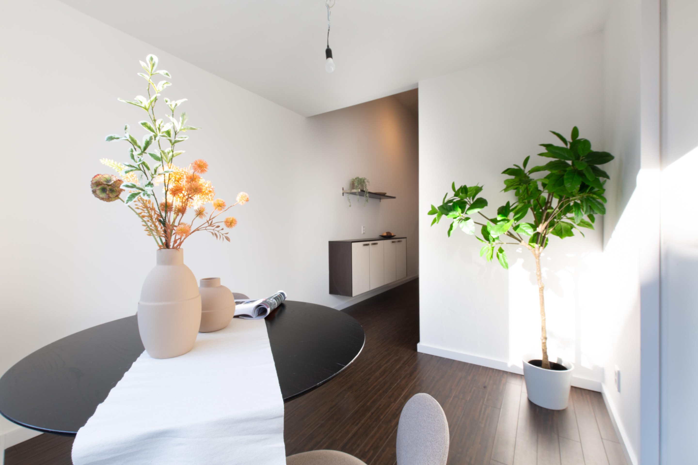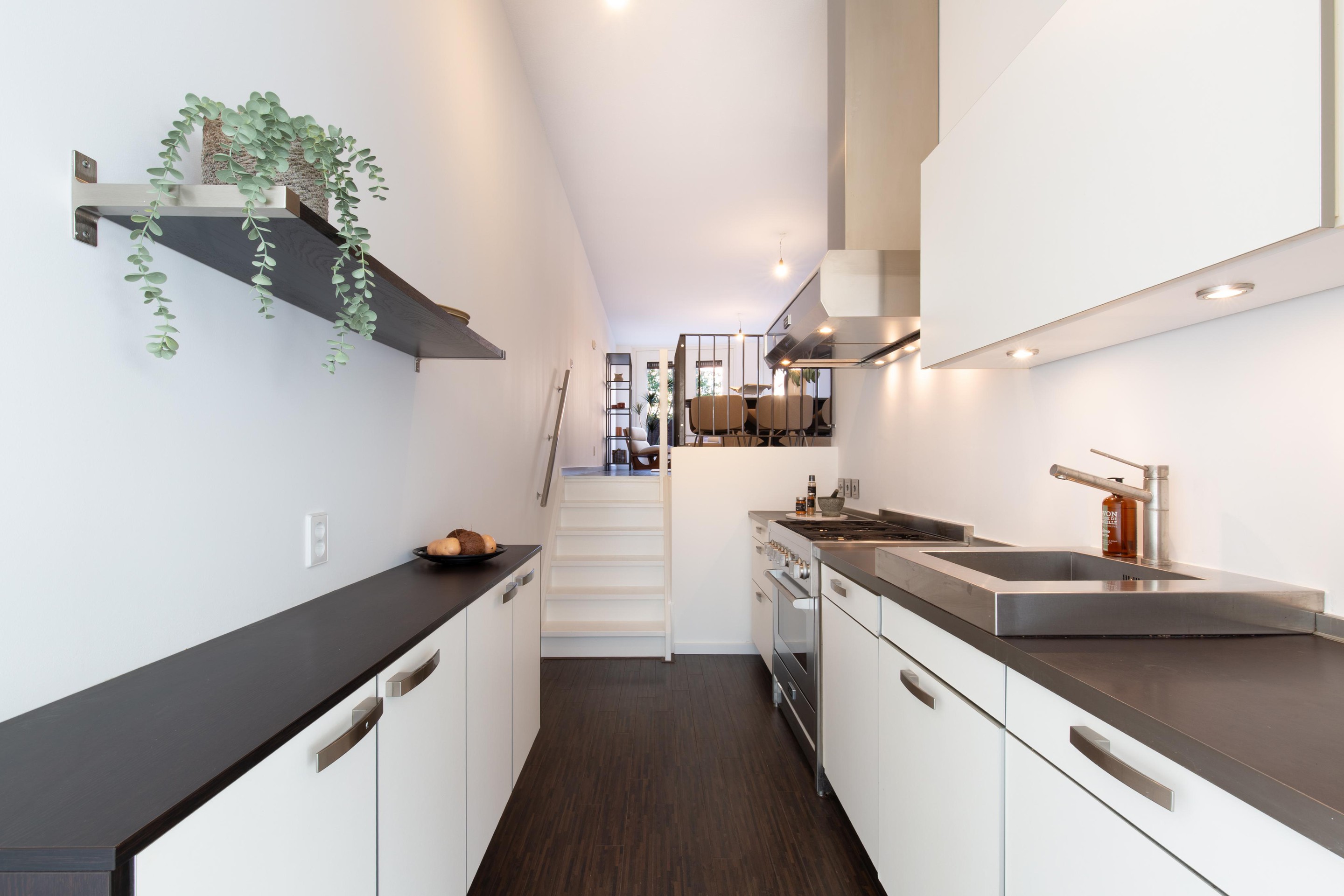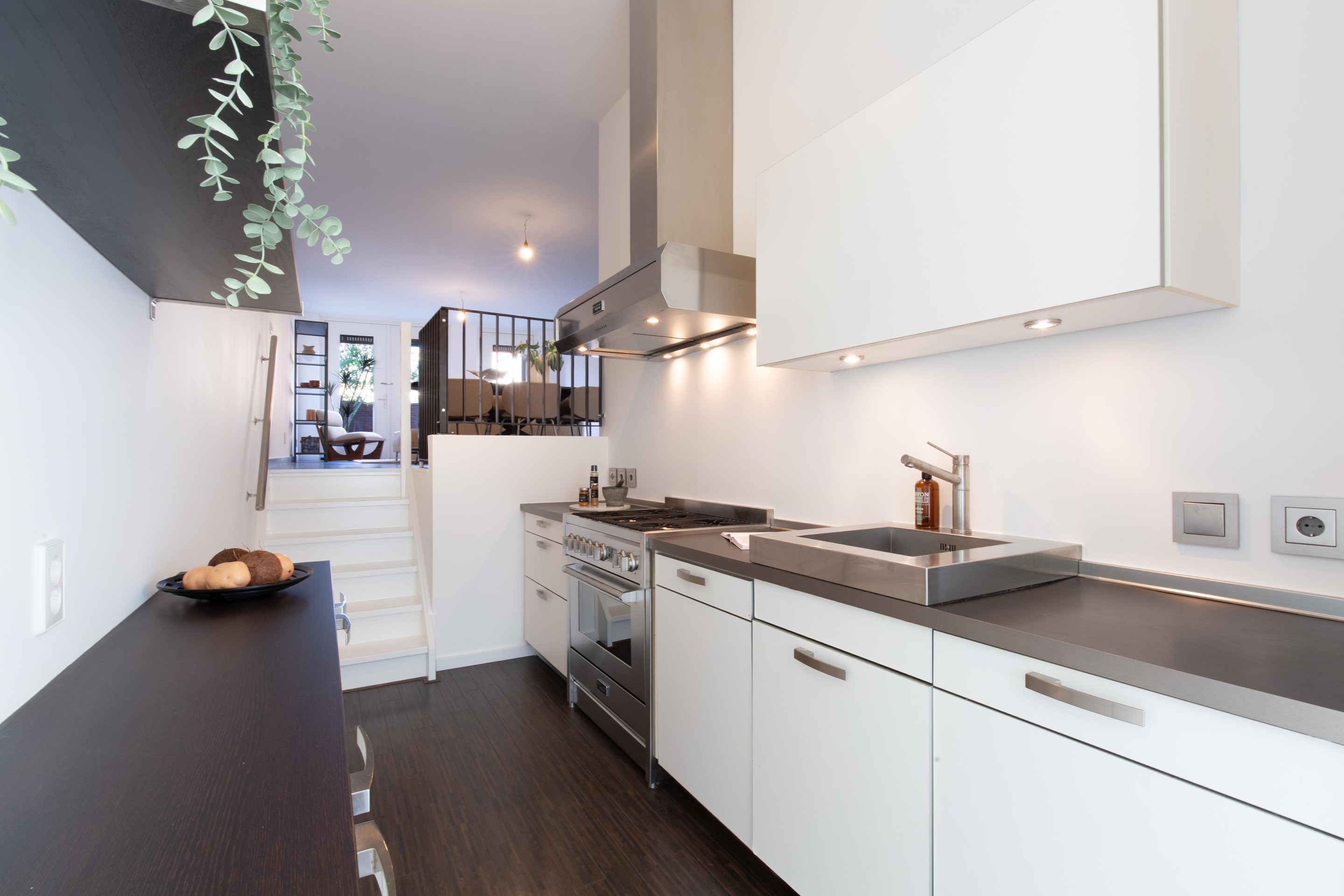 De entree zet direct de toon: een lange hal, strakke lijnen en een gevoel van ruimte. De Siematic-keuken vormt het hart van de woning en is uitgerust met hoogwaardige apparatuur van Miele en een professioneel Solitaire-fornuis en afzuigsysteem — klaar voor uitgebreide diners of snelle doordeweekse avonden.