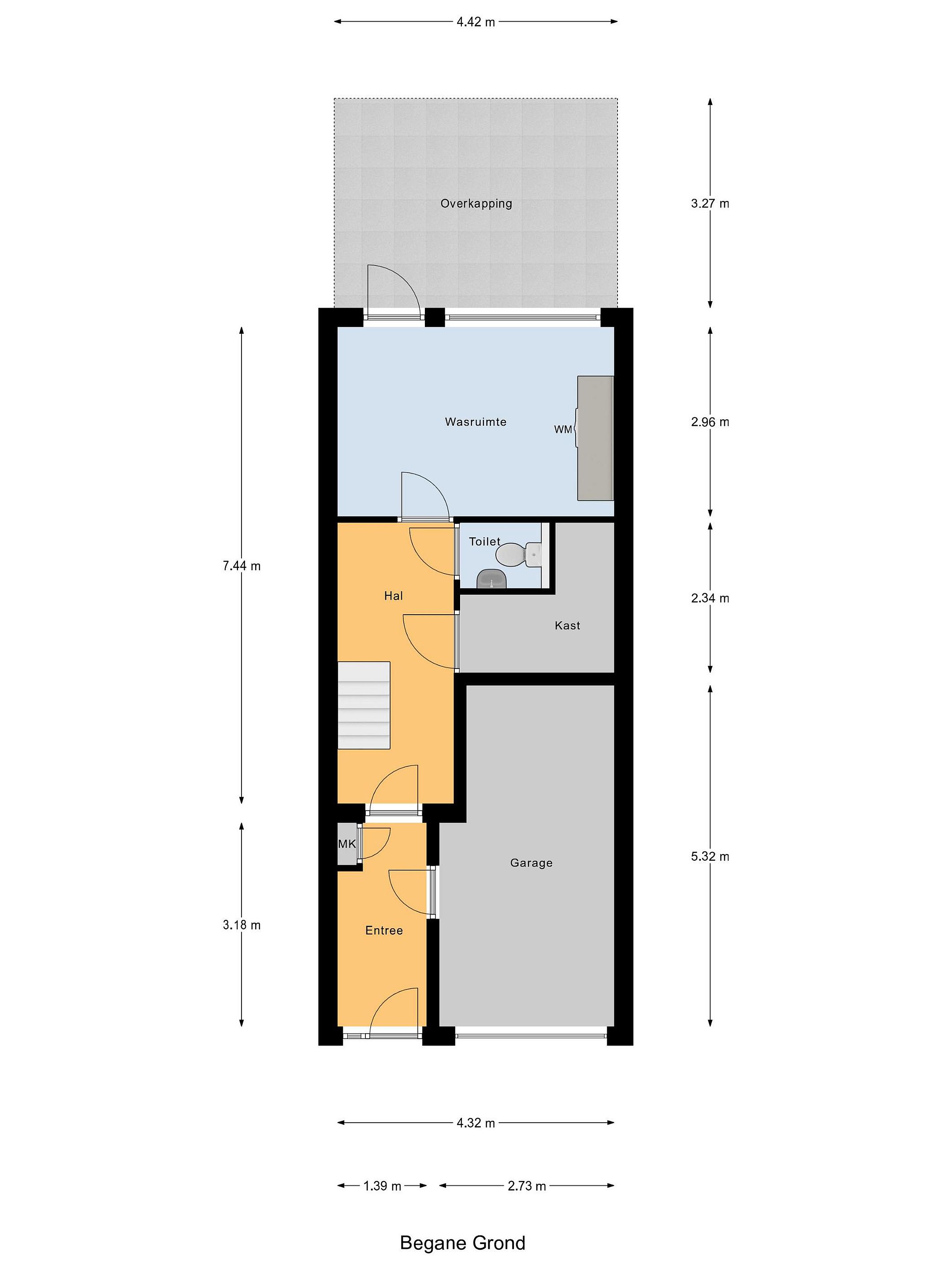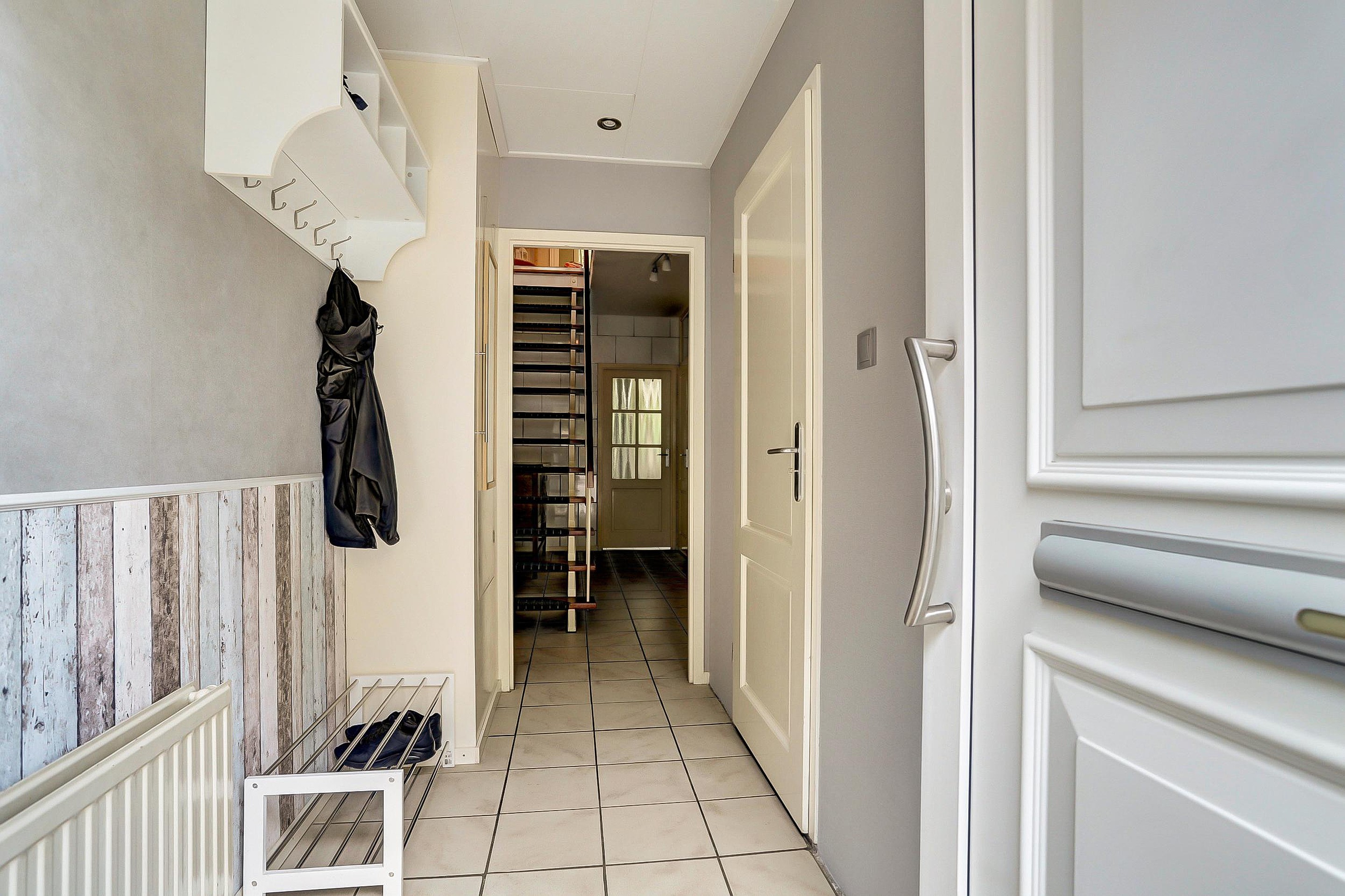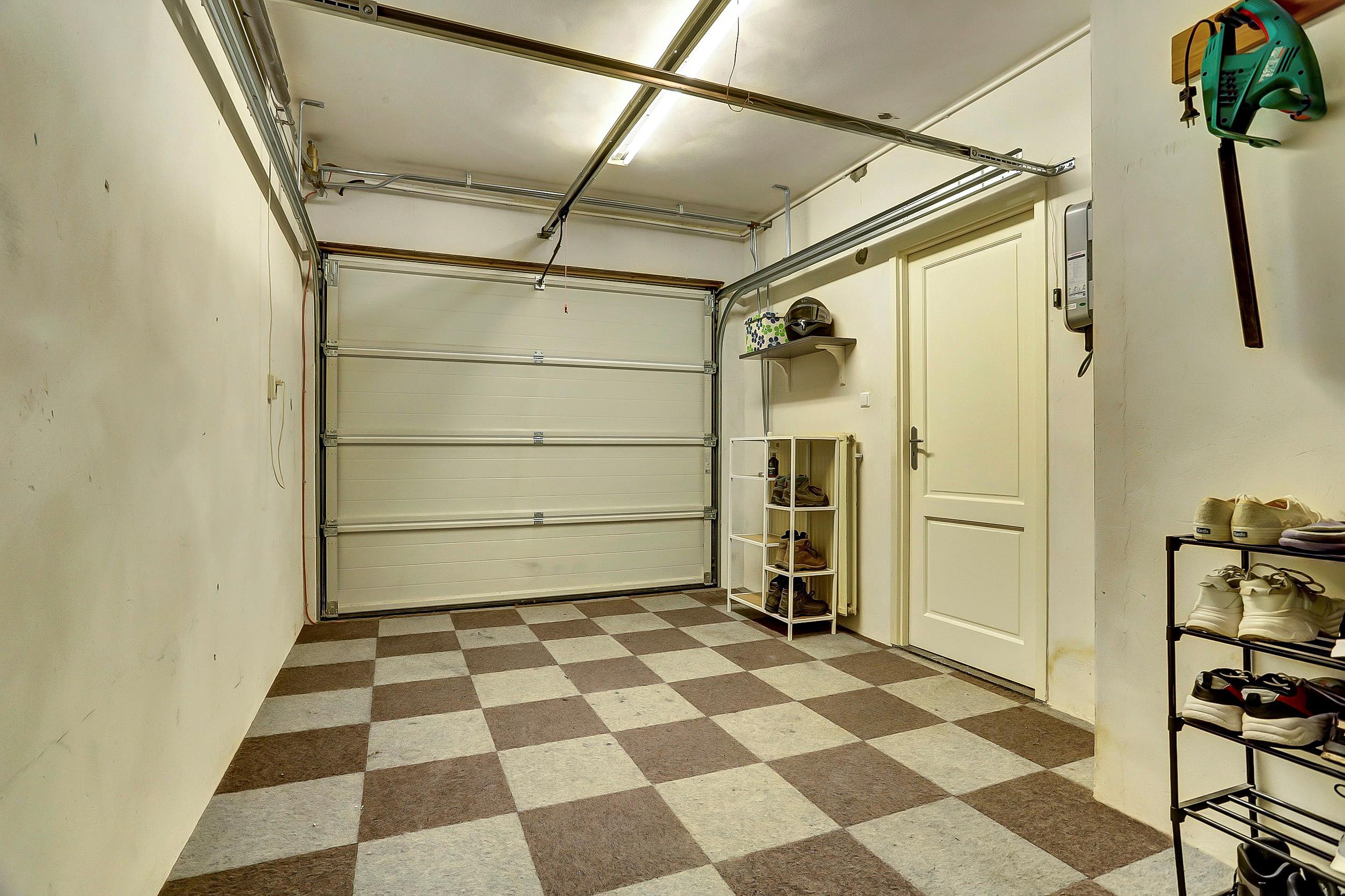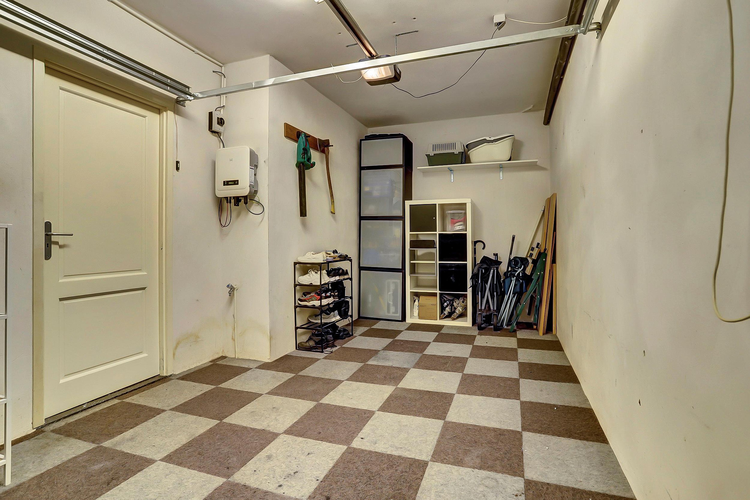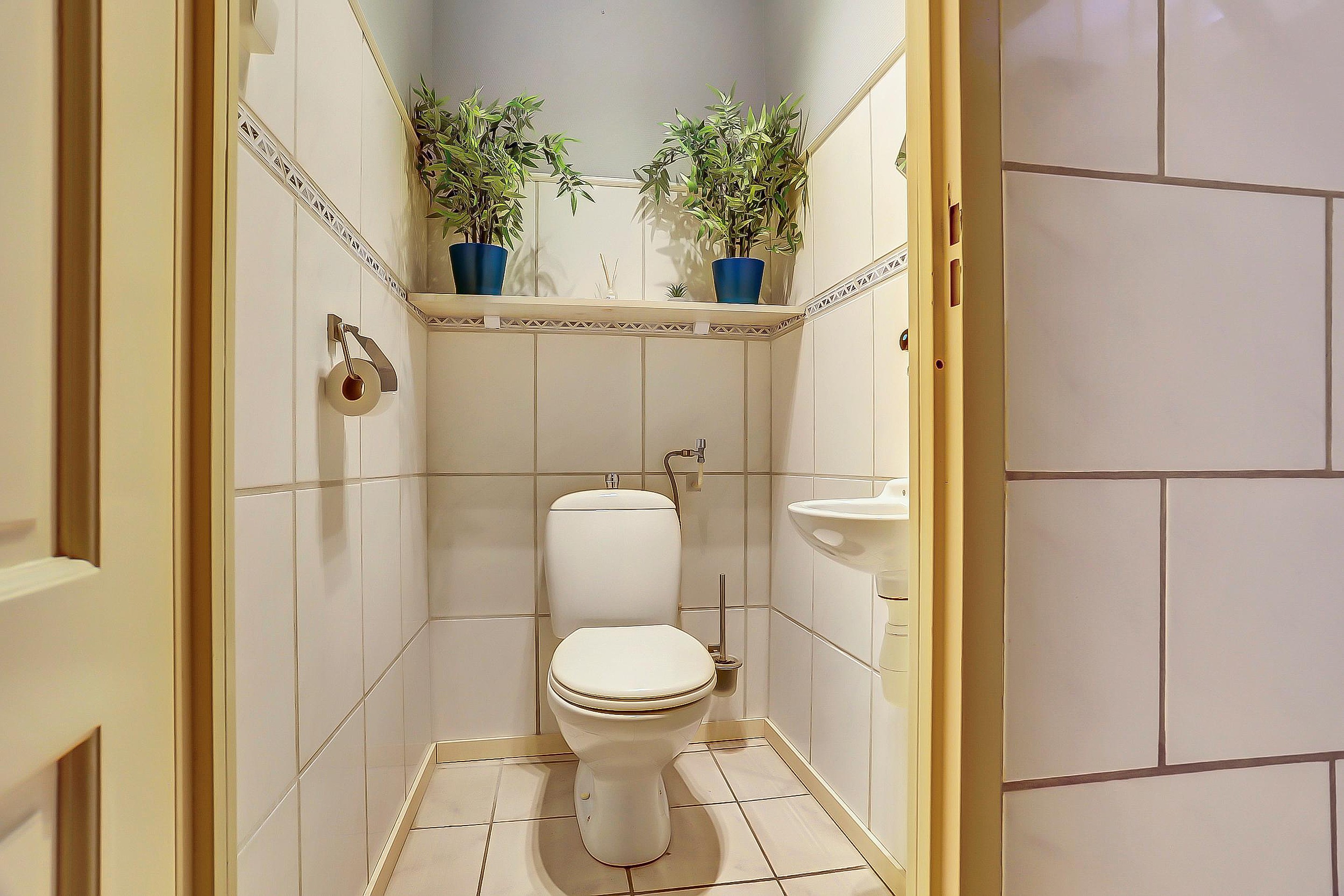 Bij binnenkomst in de hal tref je de meterkast en de toegang tot de inpandige garage met elektrische roldeur. Vanuit hier bereik je de gang met de trapopgang naar de eerste verdieping, de toiletruimte, een berging met cv-installatie en de toegang tot de tuinkamer. De toiletruimte is voorzien van een toilet en fonteintje.