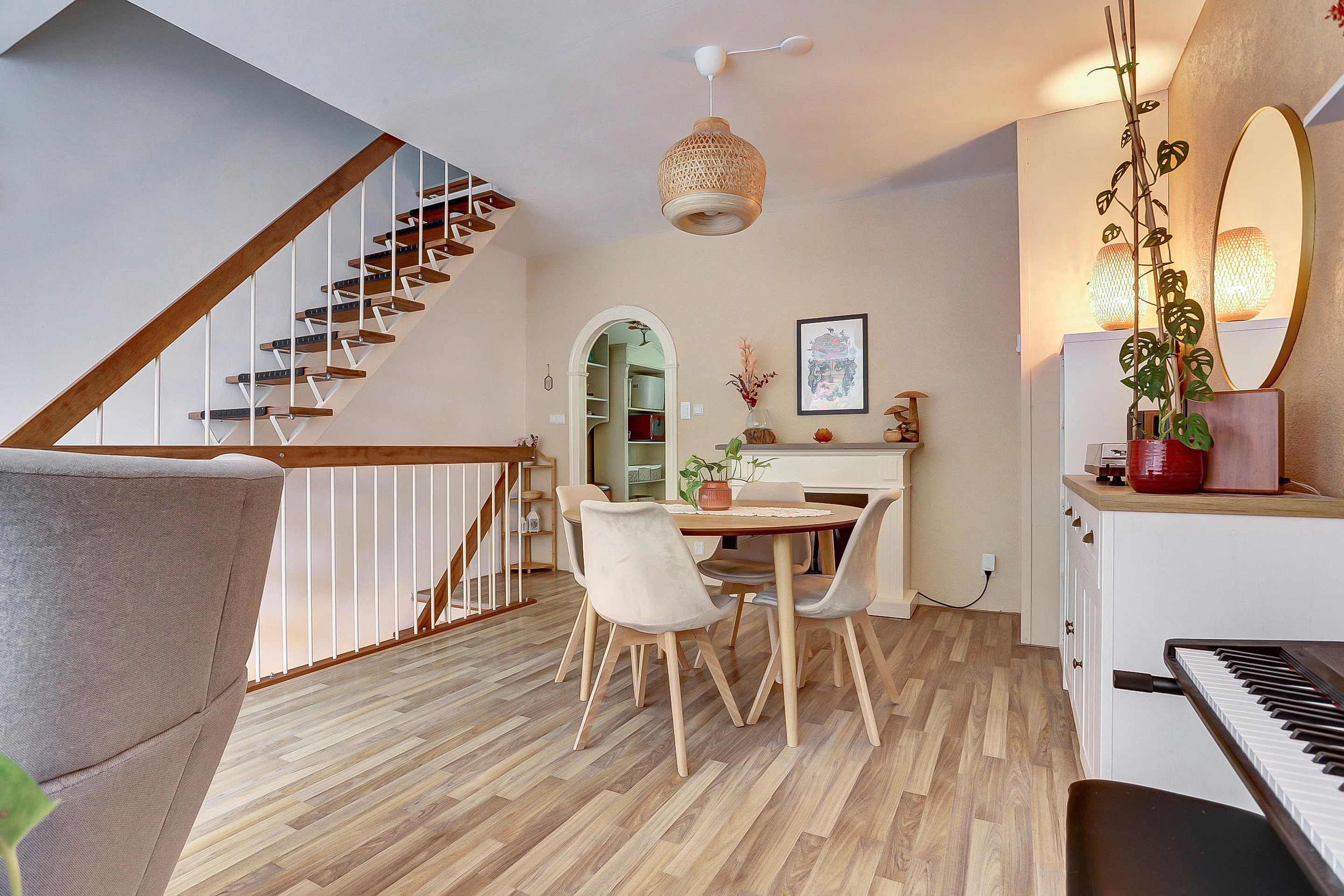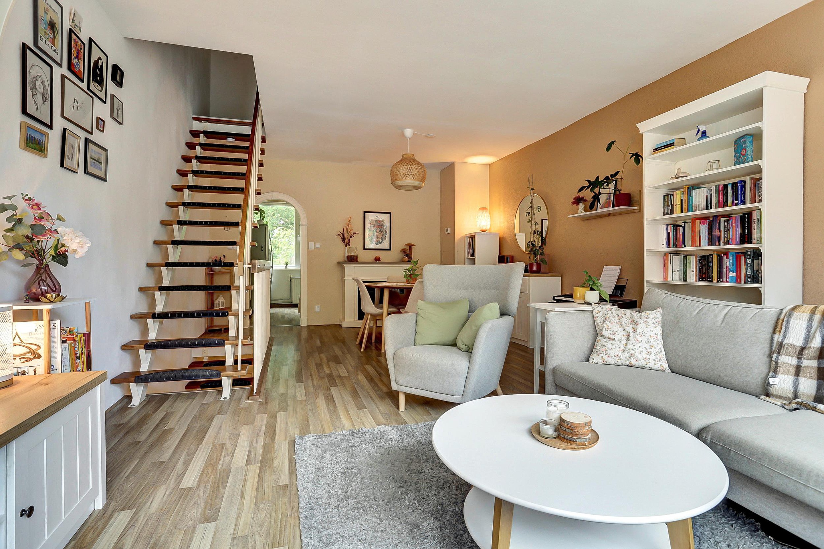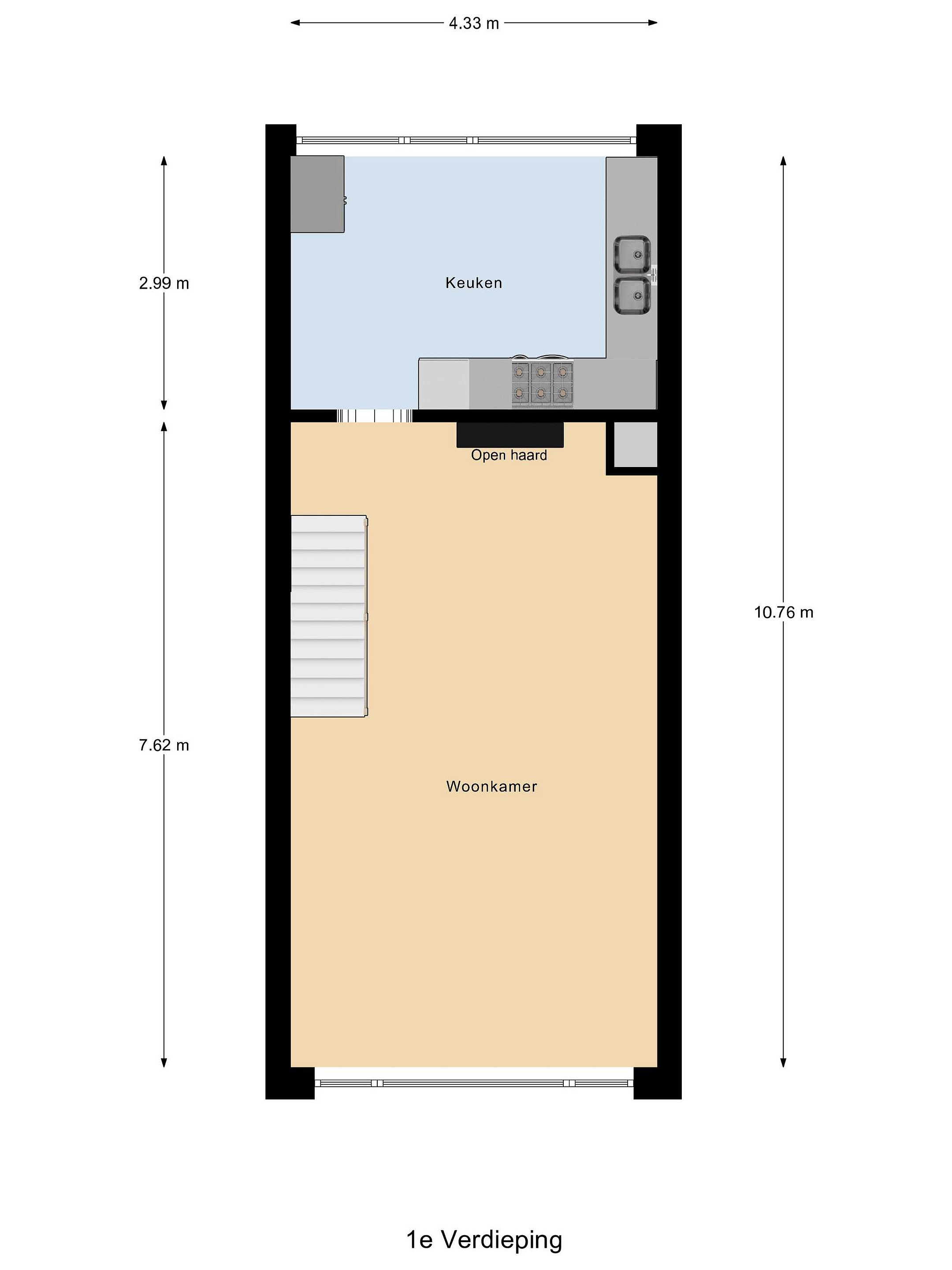 Via de vaste trap bereik je de eerste verdieping. Hier bevindt zich de royale woonkamer, die dankzij de grote raampartijen aan de voorzijde geniet van veel daglicht en een ruimtelijk gevoel.