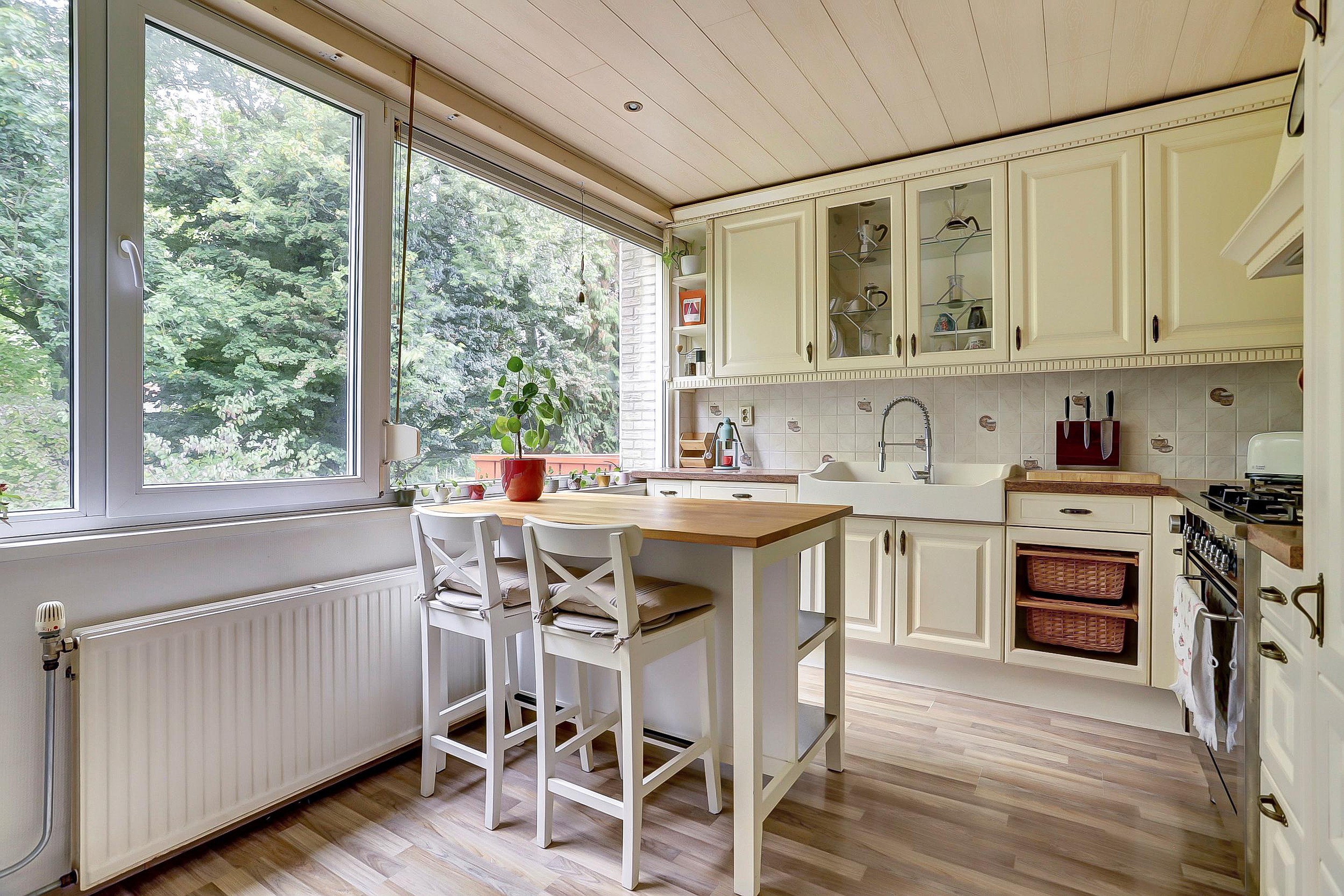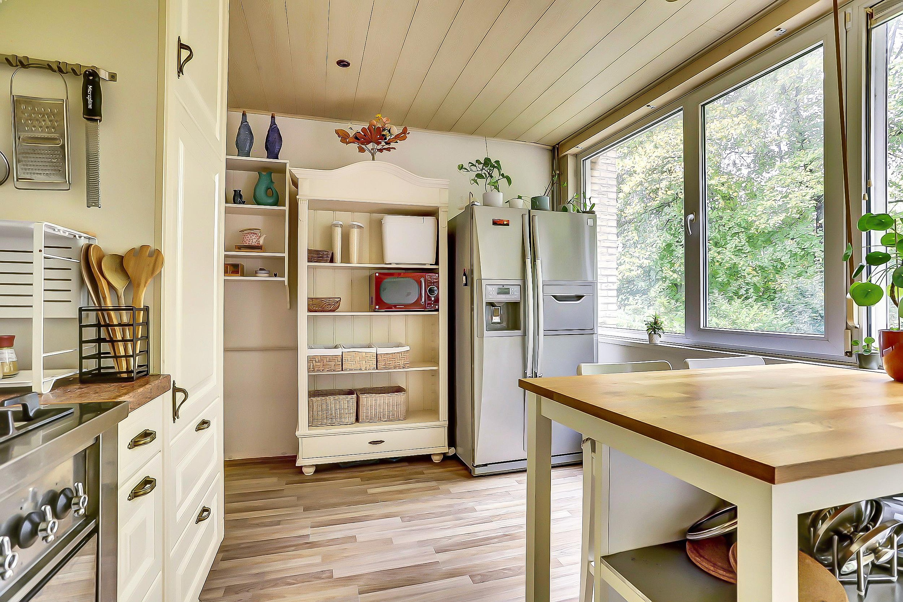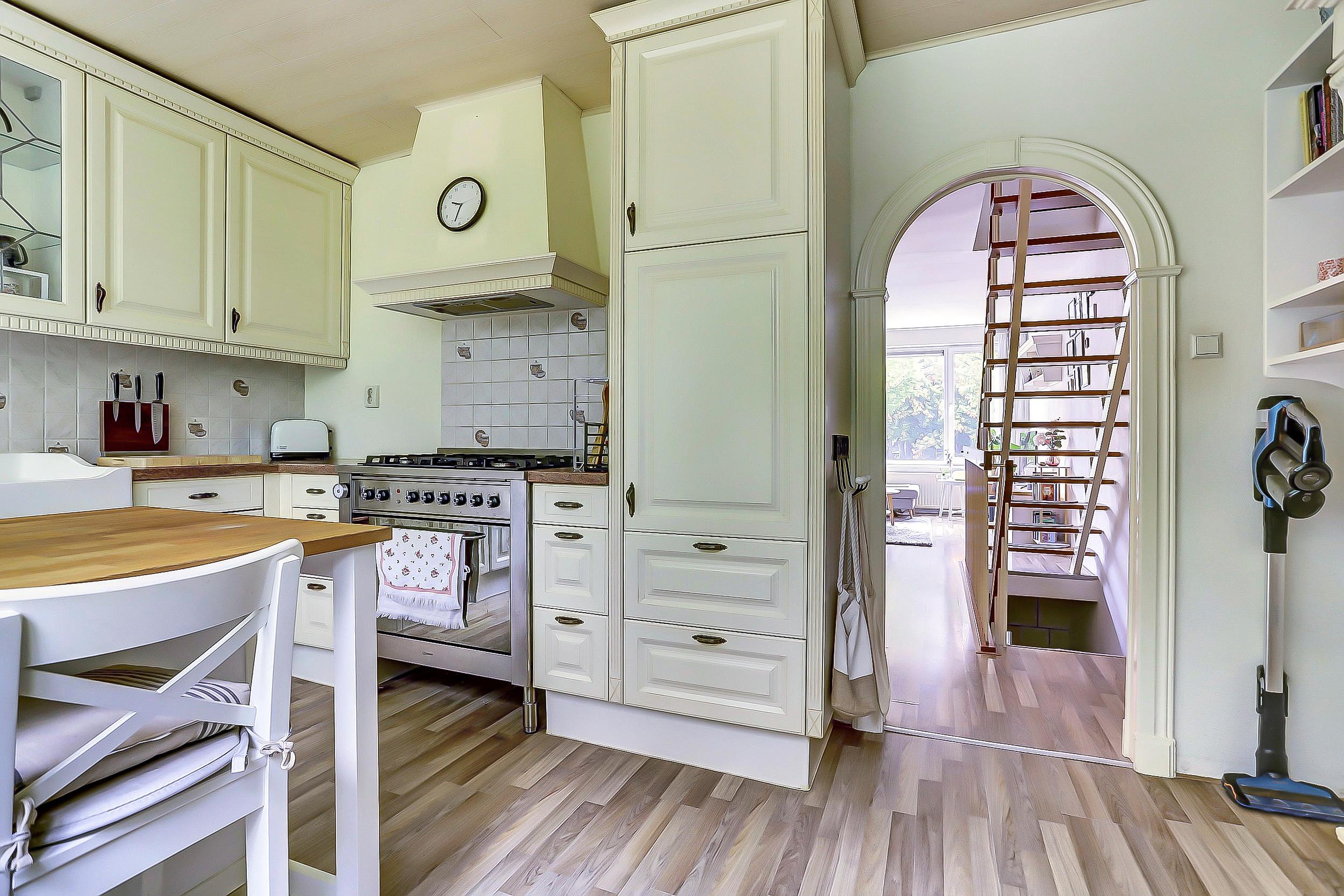 Aan de achterzijde ligt de keuken, eveneens met grote raampartijen die zorgen voor een prettige lichtinval. De keuken is voorzien van diverse inbouwapparatuur, waaronder een vaatwasser en een breed fornuis met grote oven – perfect voor de enthousiaste thuiskok. Daarnaast is er volop kastruimte en praktische werkruimte aanwezig.