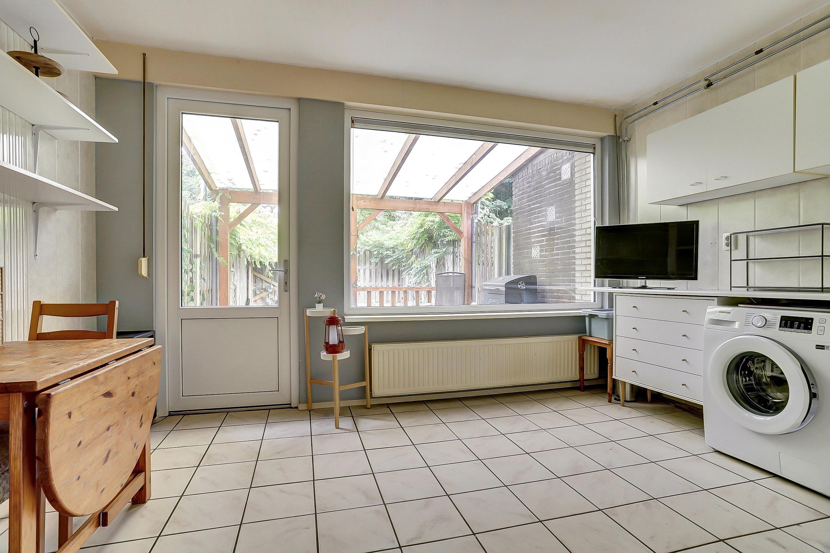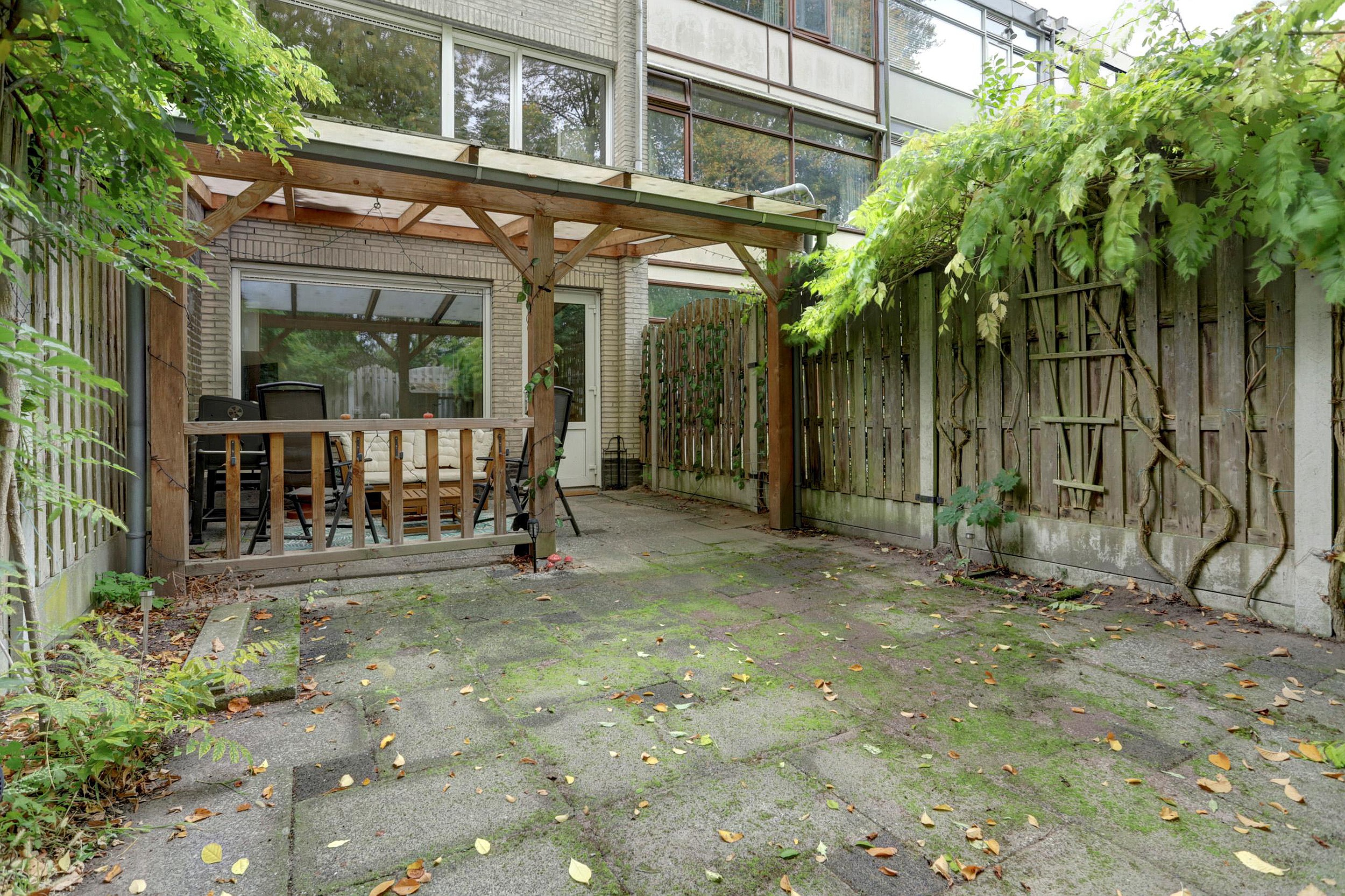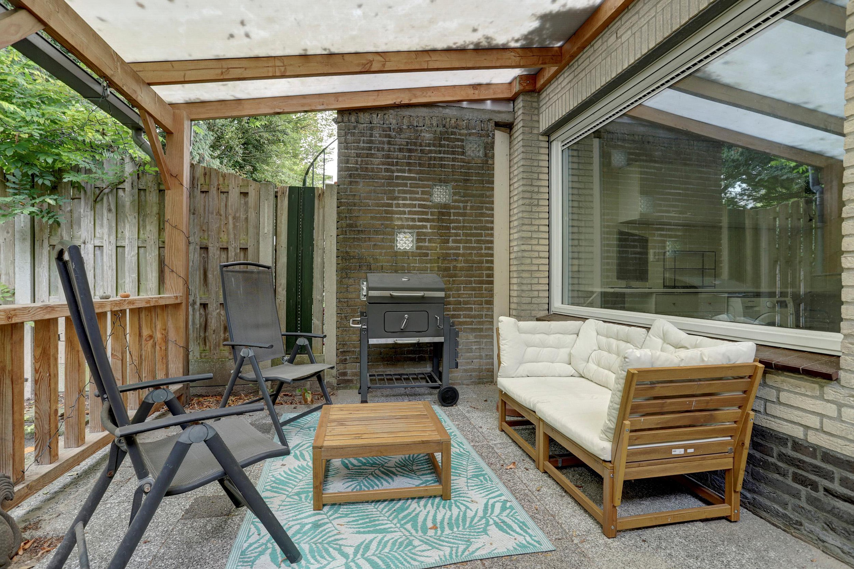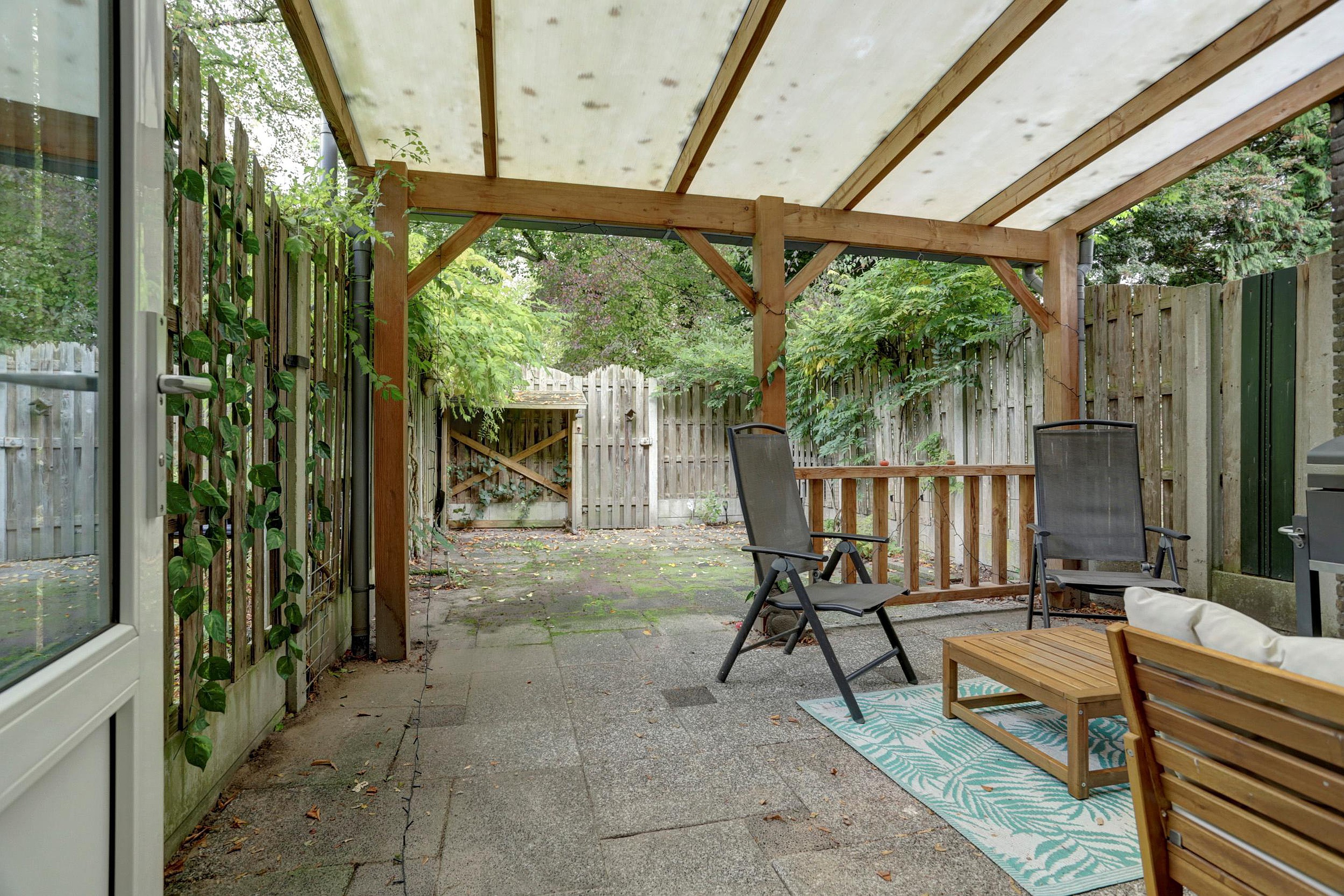 Via de achterdeur bereik je de onderhoudsvriendelijke, volledig bestrate tuin met een gezellige overkapping en voldoende ruimte voor een loungeset en barbecue — een heerlijke plek om van het buitenleven te genieten. Daarnaast is er een praktische achterom aanwezig.