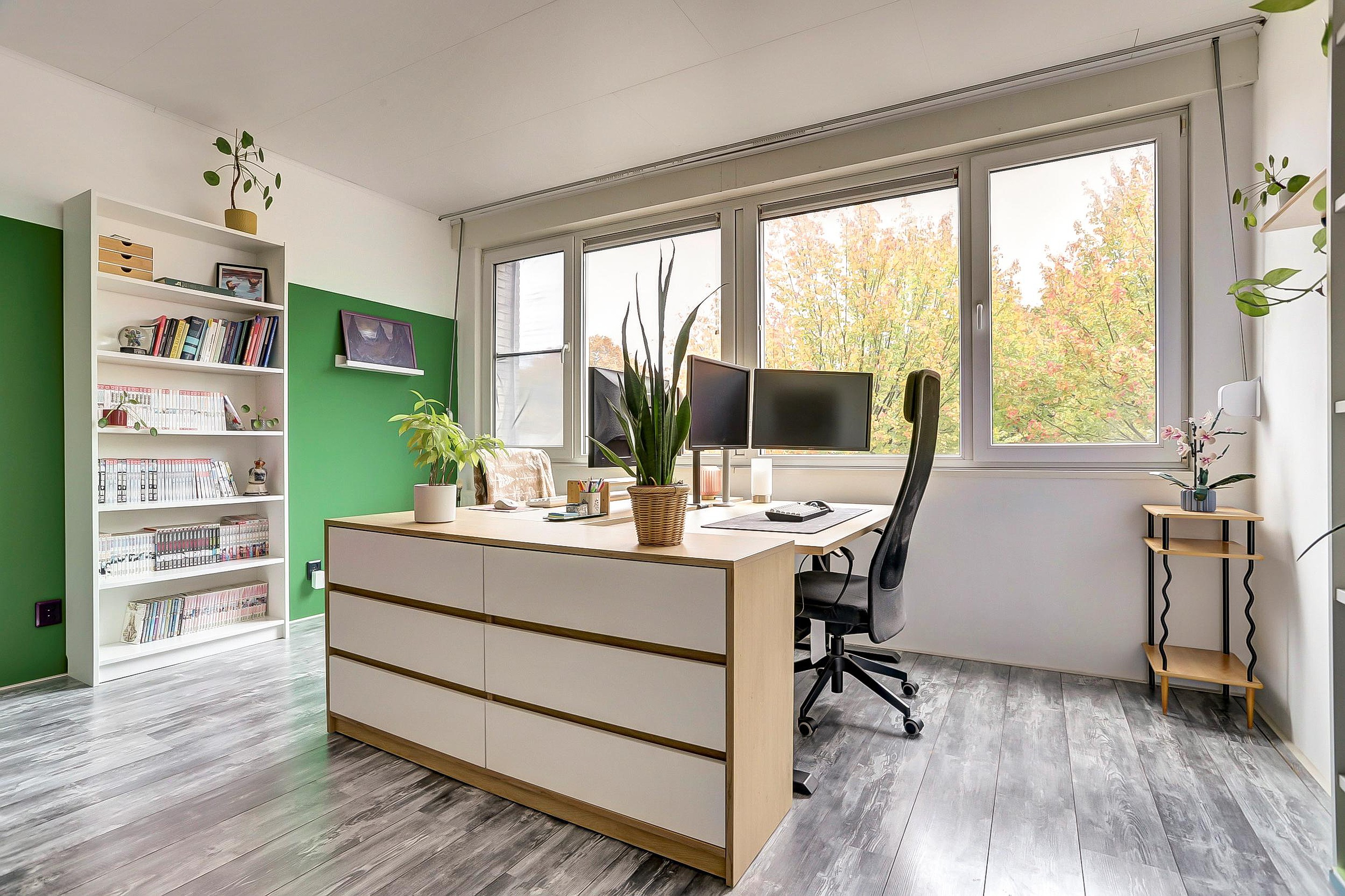 De ruime kamer aan de voorzijde wordt momenteel gebruikt als werkkamer, maar bestond oorspronkelijk uit twee aparte ruimtes. Indien gewenst kan deze eenvoudig weer worden opgesplitst in twee afzonderlijke kamers.
