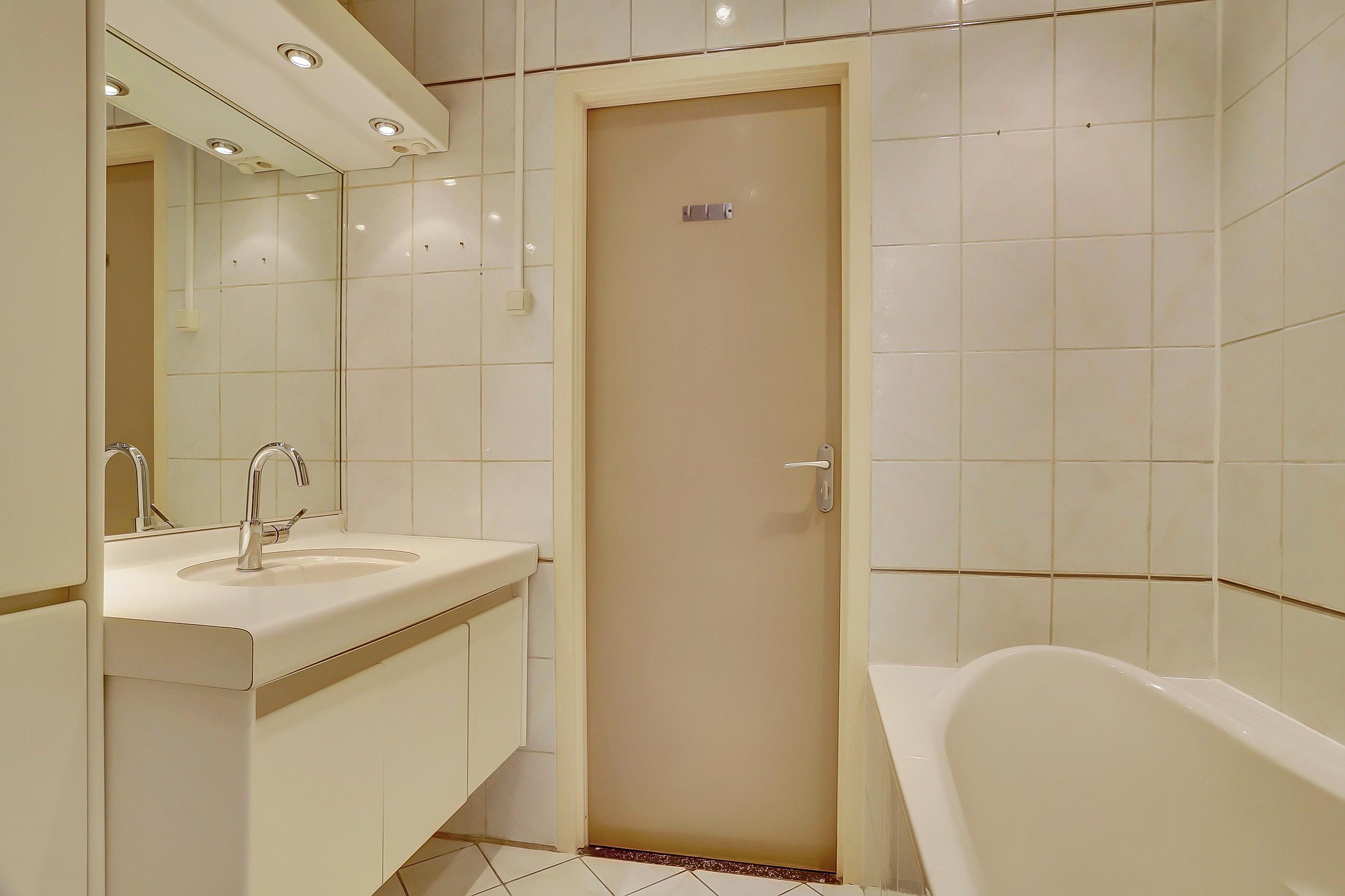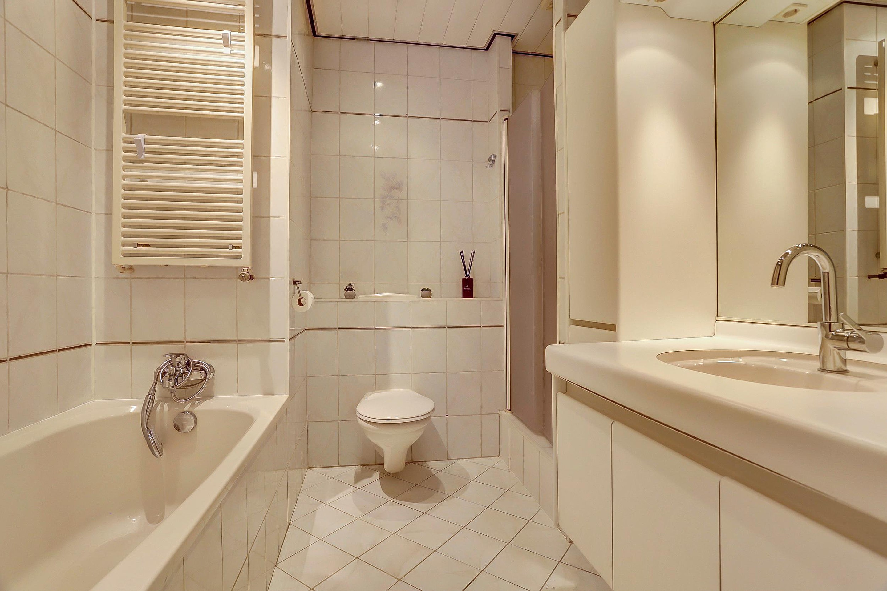 De badkamer is volledig betegeld en beschikt over een ligbad, aparte douche, toilet, wastafelmeubel en een designradiator.