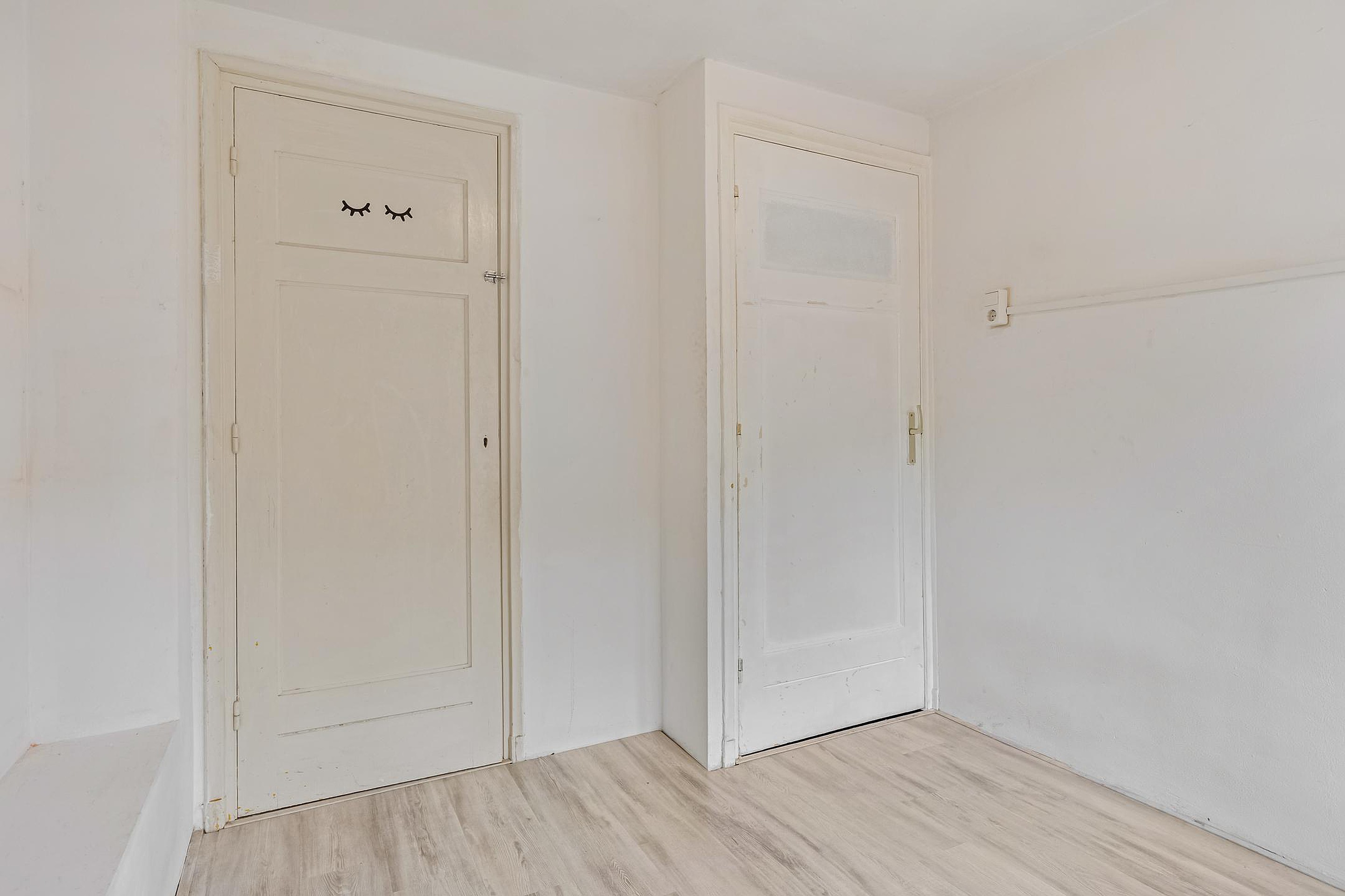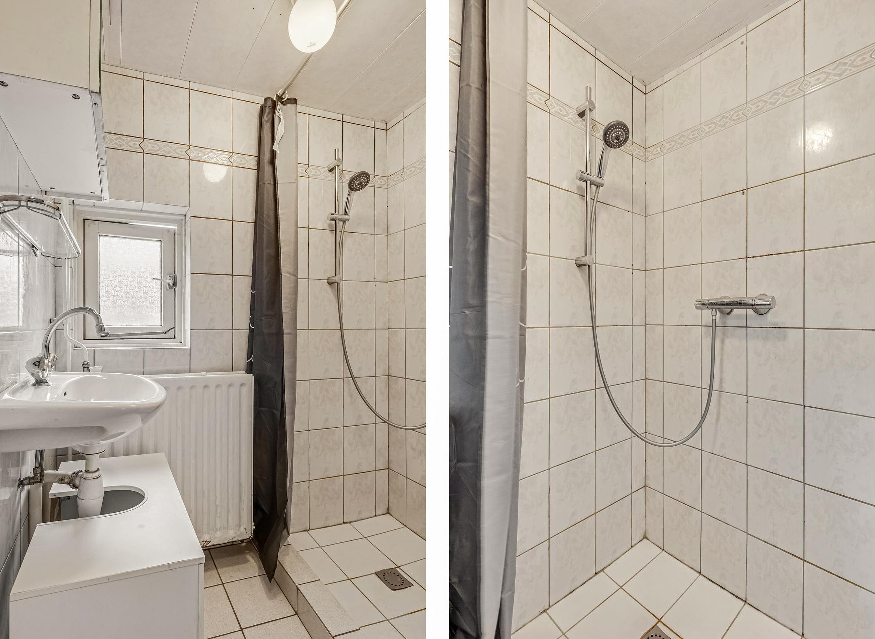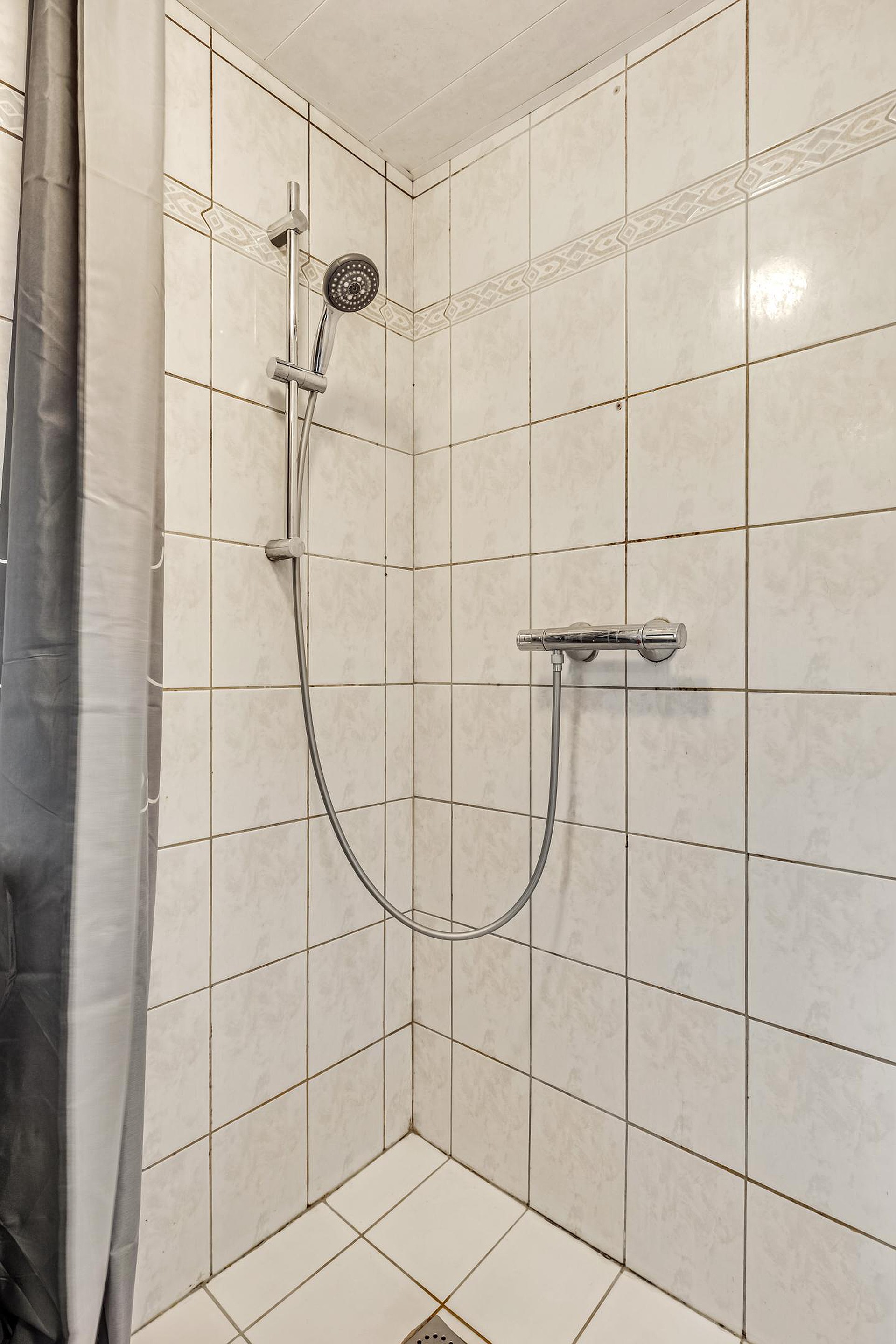 De aanwezige paneeldeuren zijn een leuk detail op de bovenverdieping. De badkamer is eenvoudig en uitgerust met een wastafel en een douchehoek, en is voorzien van lichte betegeling.