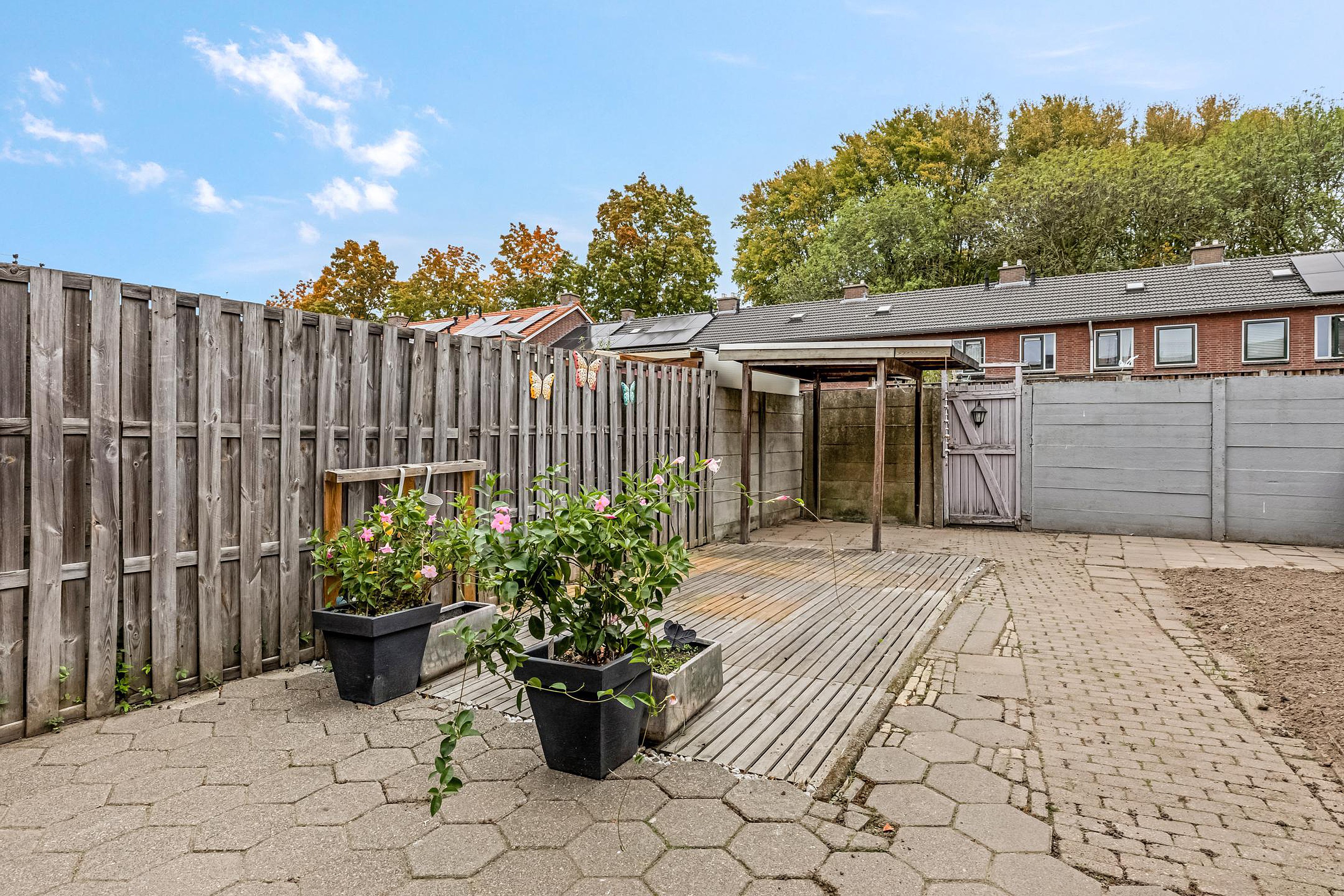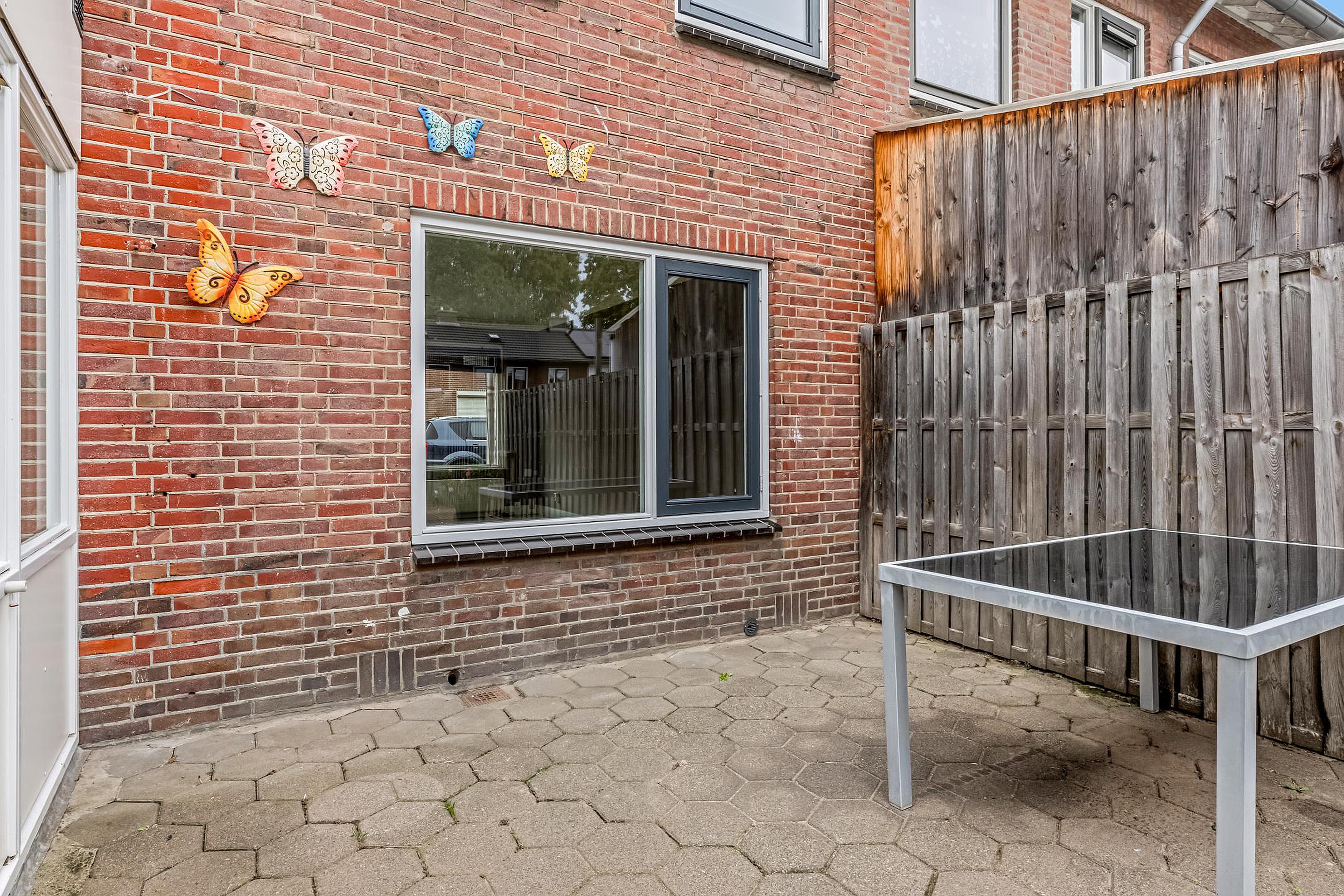 Vanuit de keuken stap je de tuin in. Deze is gelegen op het oosten, dus je start de dag met de zon op de achtergevel. Gedurende de dag trekt de zon langzaam dieper de tuin in. Het geheel is aangelegd met een combinatie met bestrating, gazon en een border voor divers groen. De tuin is ook via de eigen achterom te bereiken.