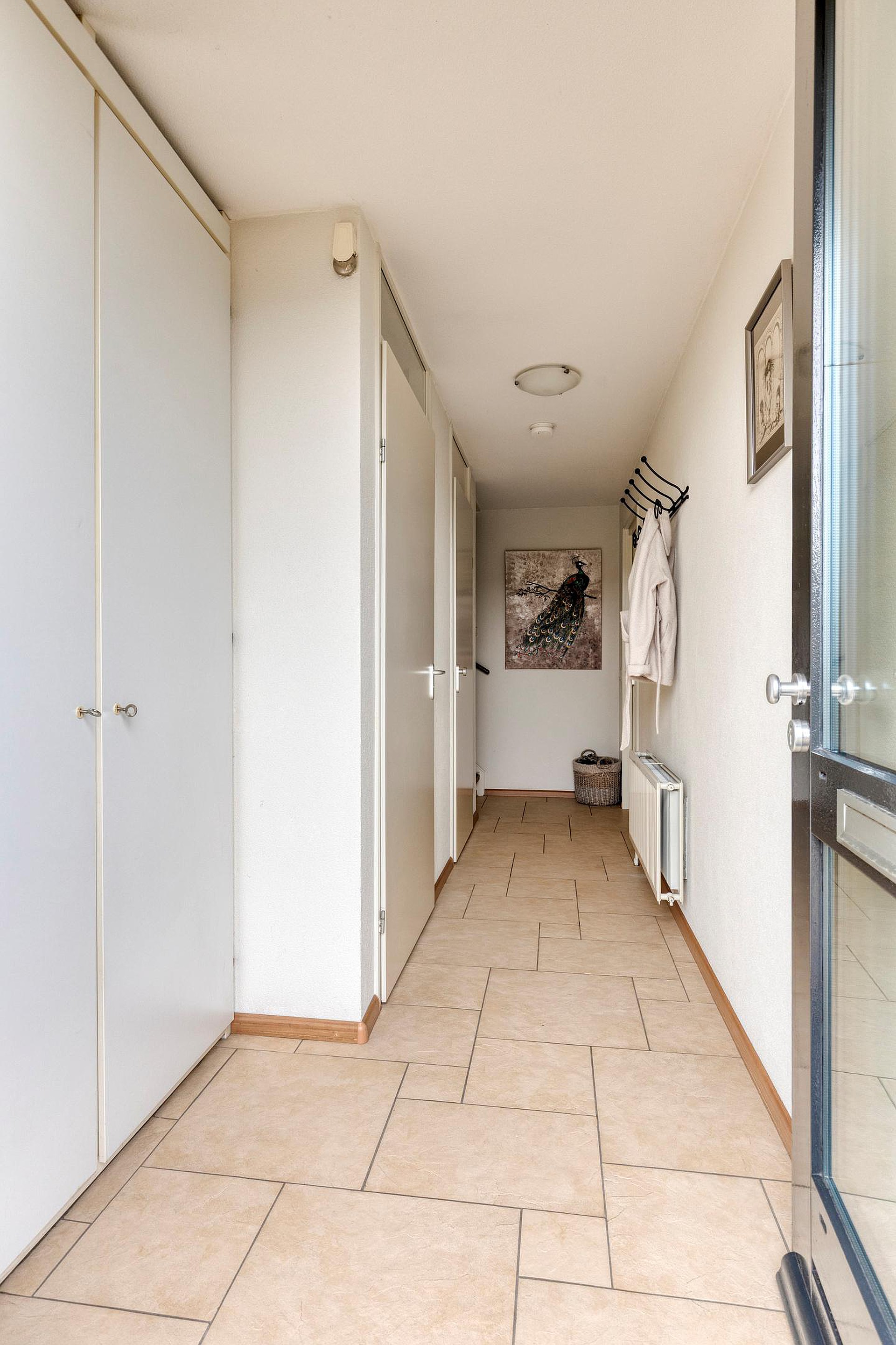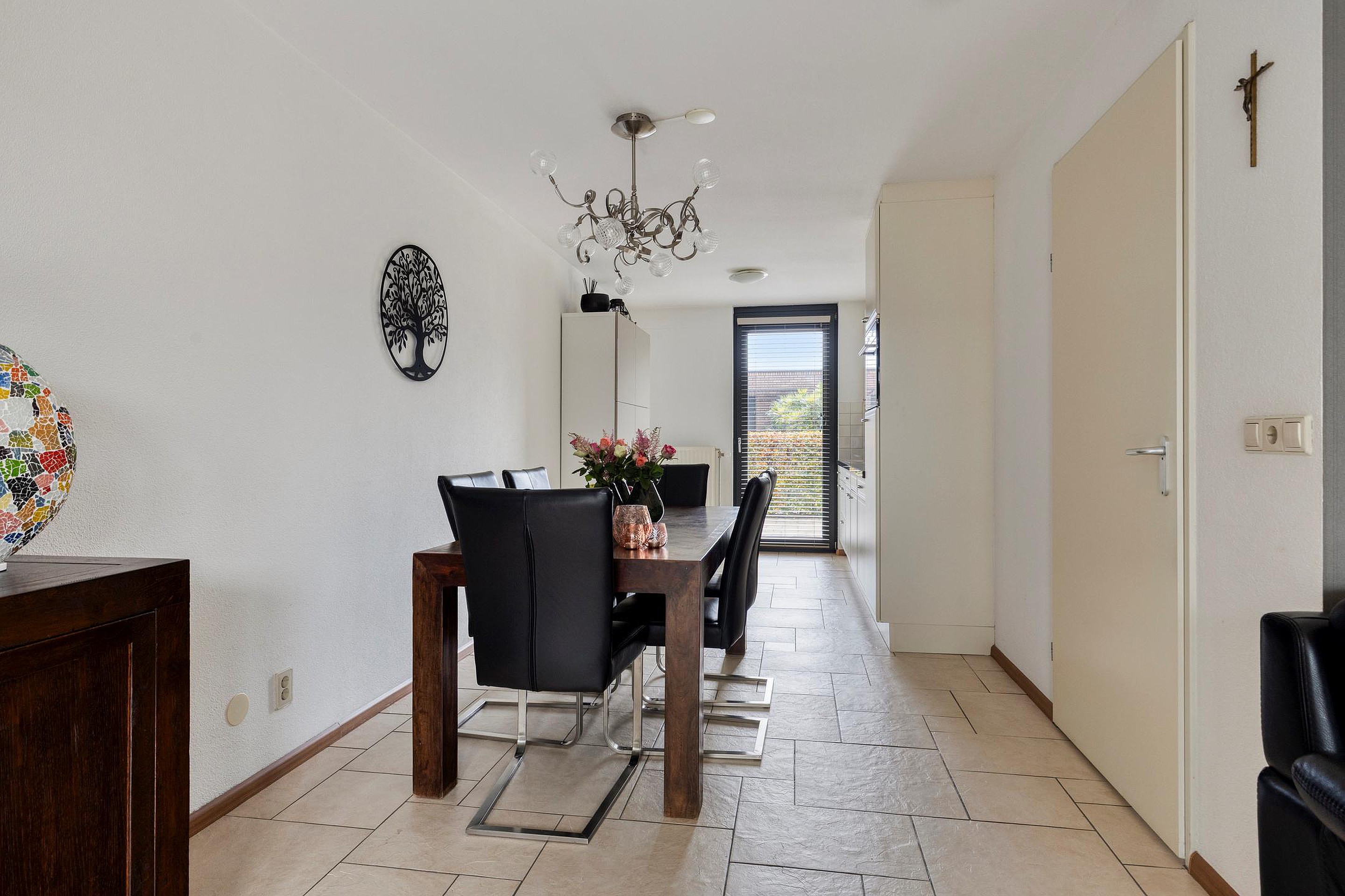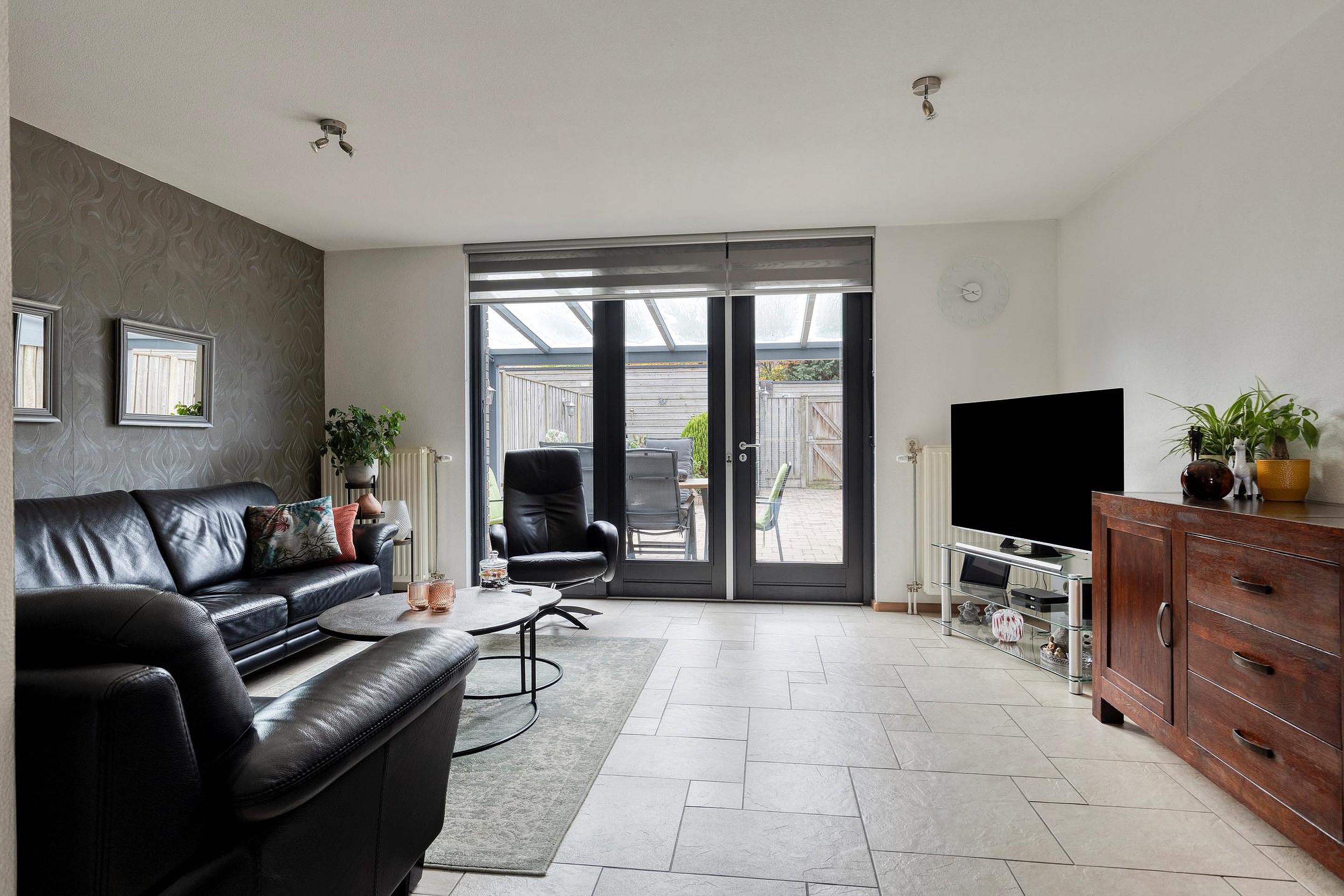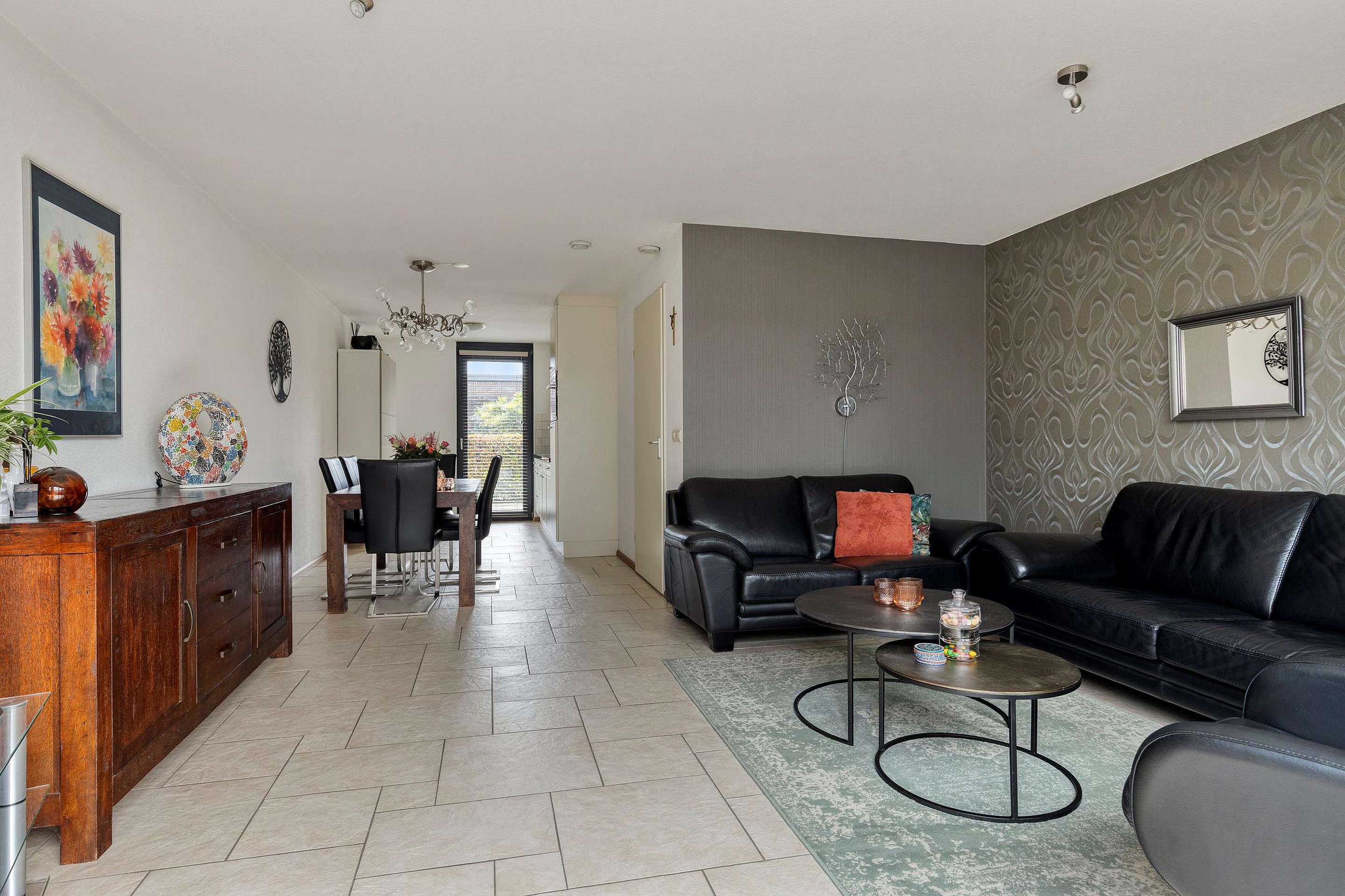 Je stapt binnen in een lichte woonkamer met strakke, wit/bruin kleurige vloertegels — netjes, tijdloos en ideaal.