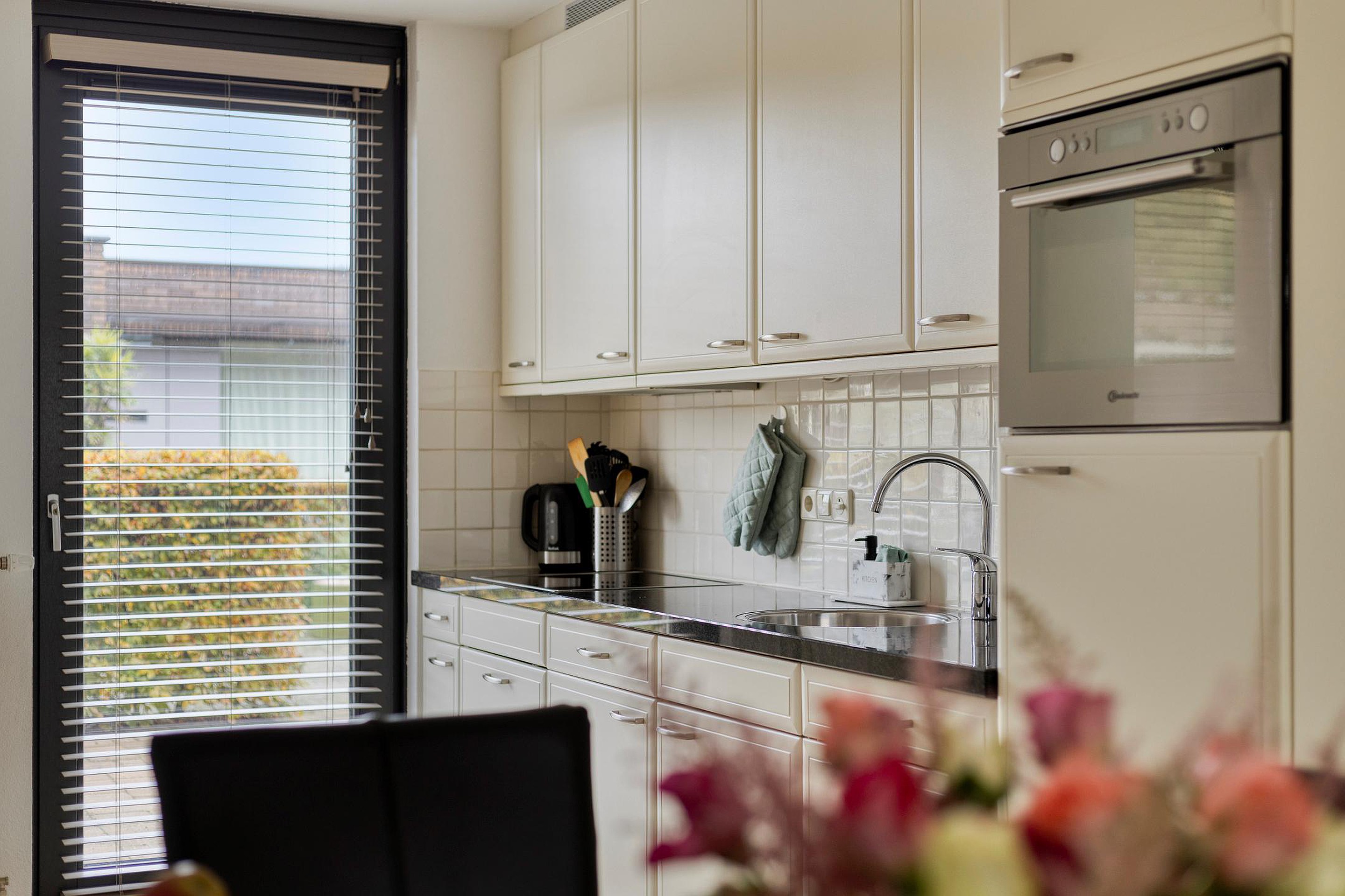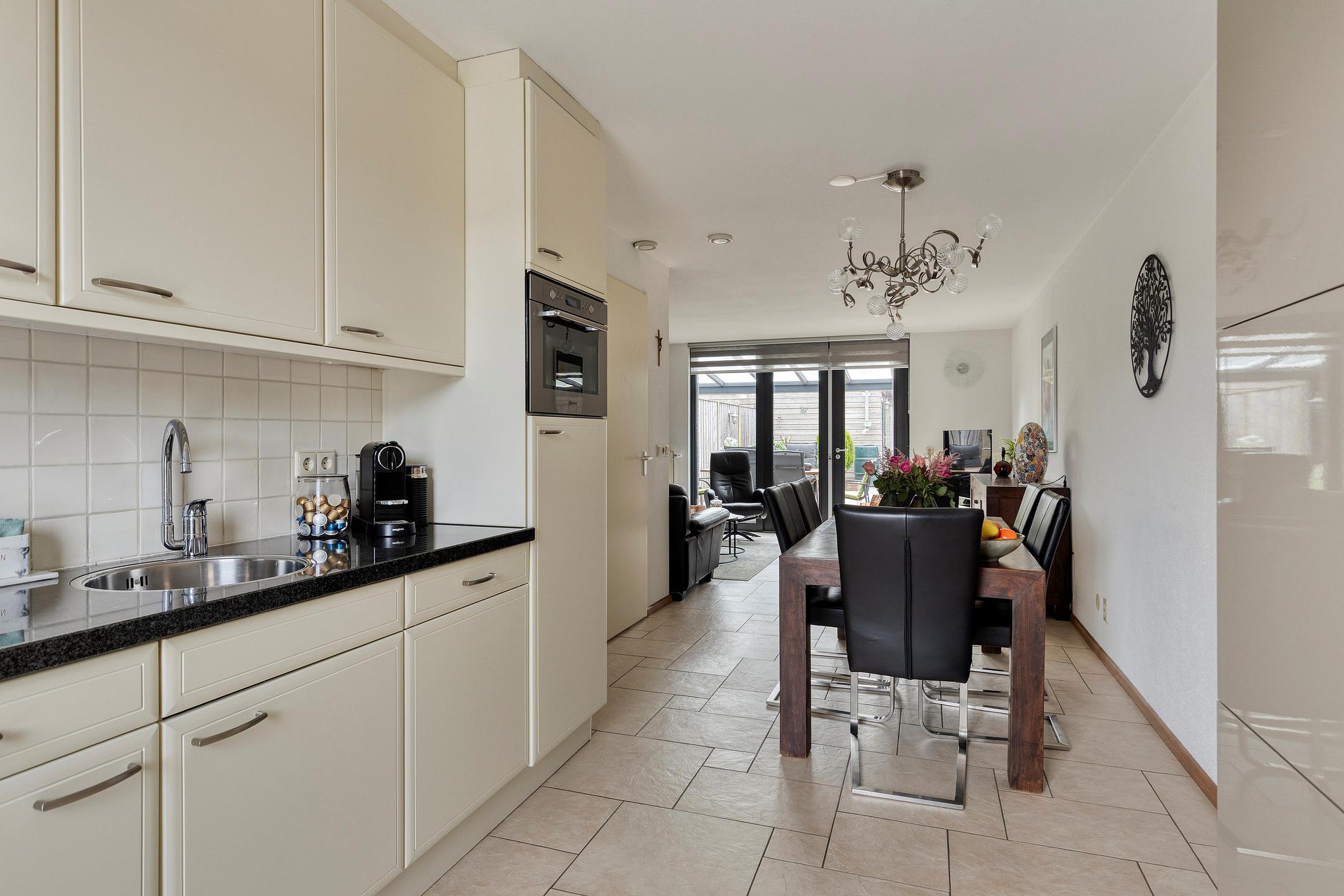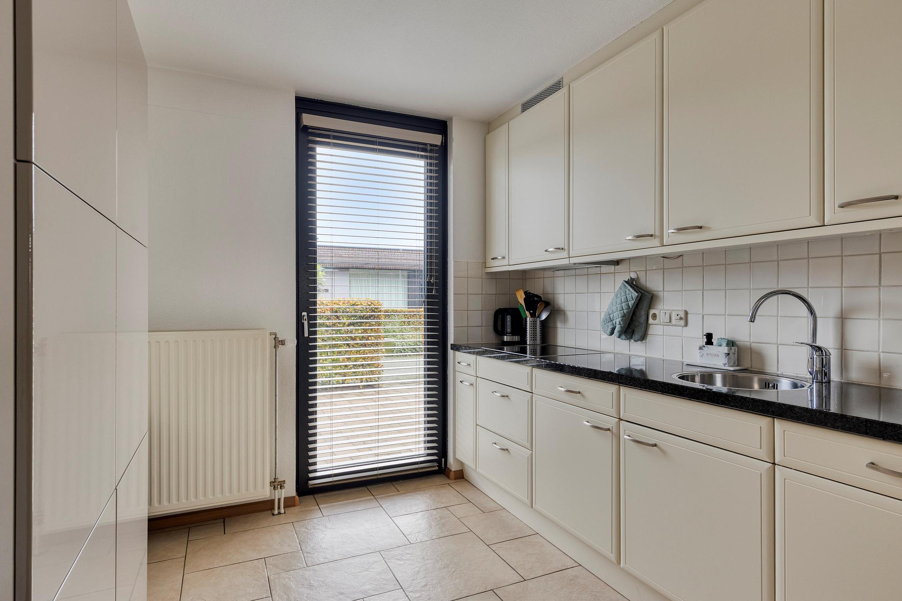 De open keuken is er eentje om trots op te zijn: voorzien van een granieten werkblad en compleet met koelkast, vaatwasser, keramische kookplaat en afzuigkap. Koken, borrelen, tafelen — het gaat hier allemaal vanzelf.