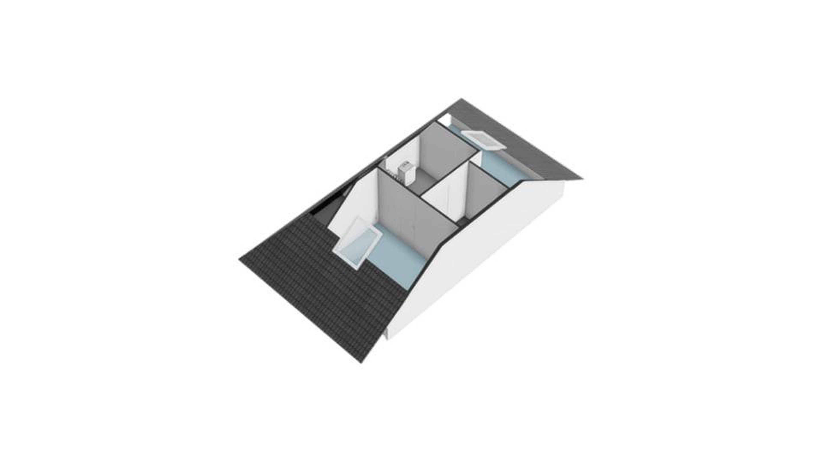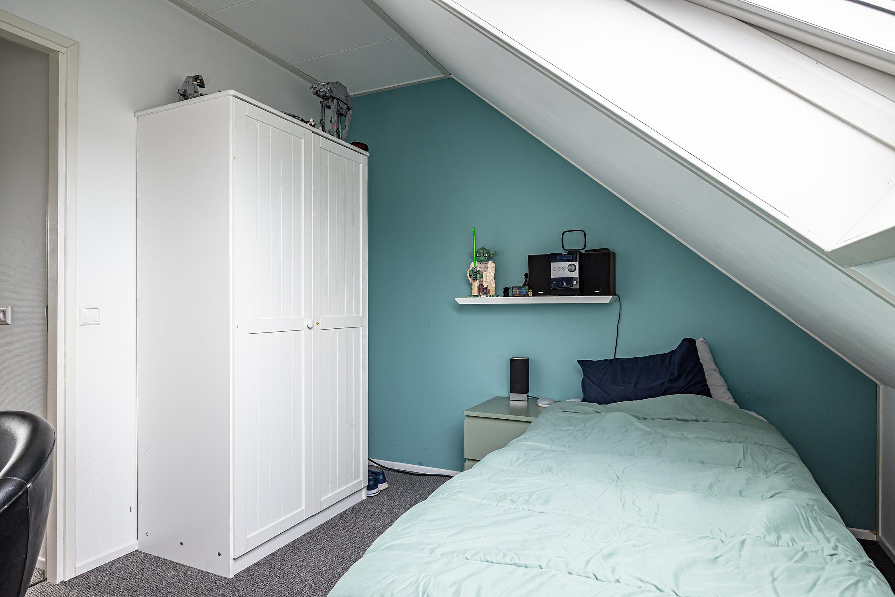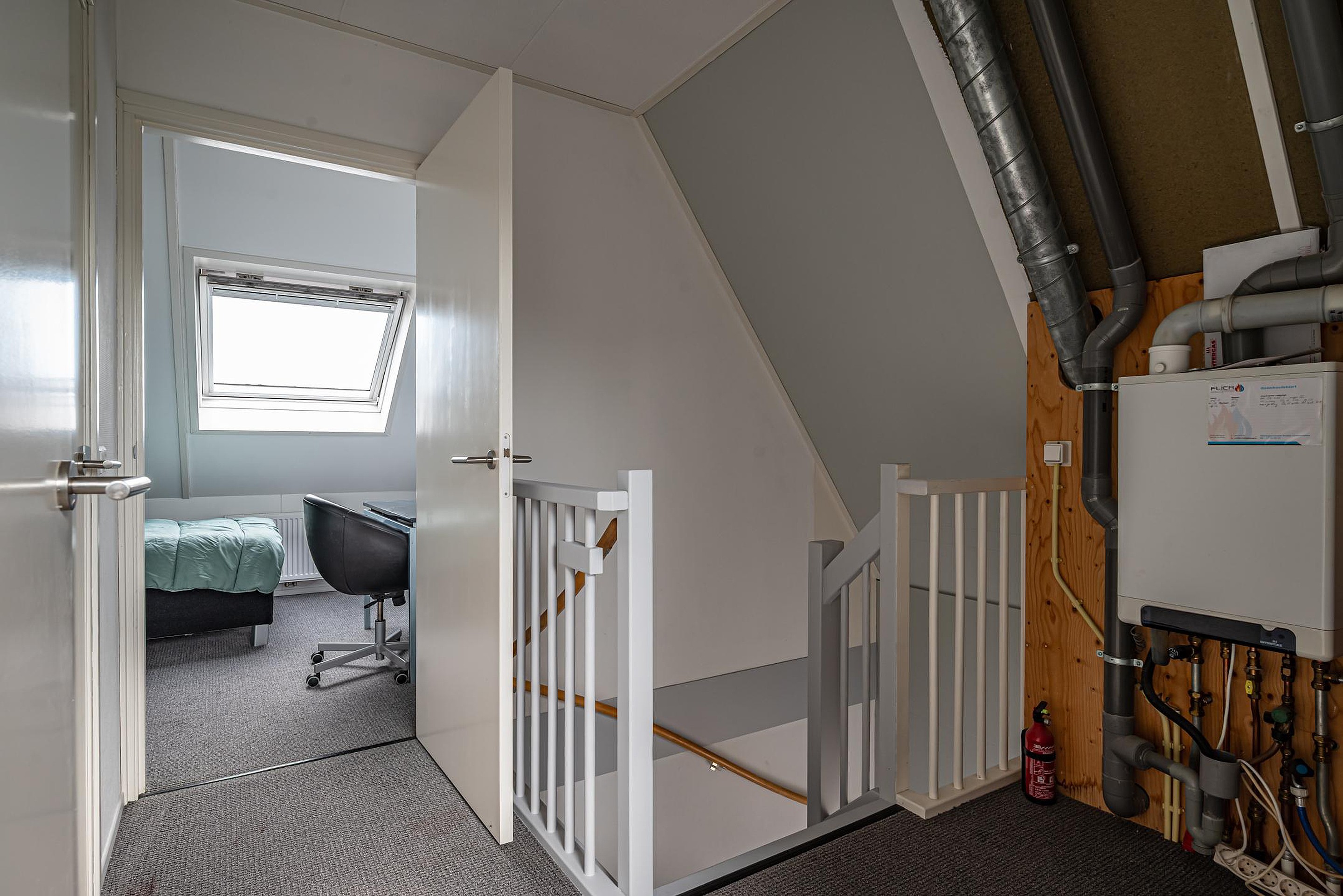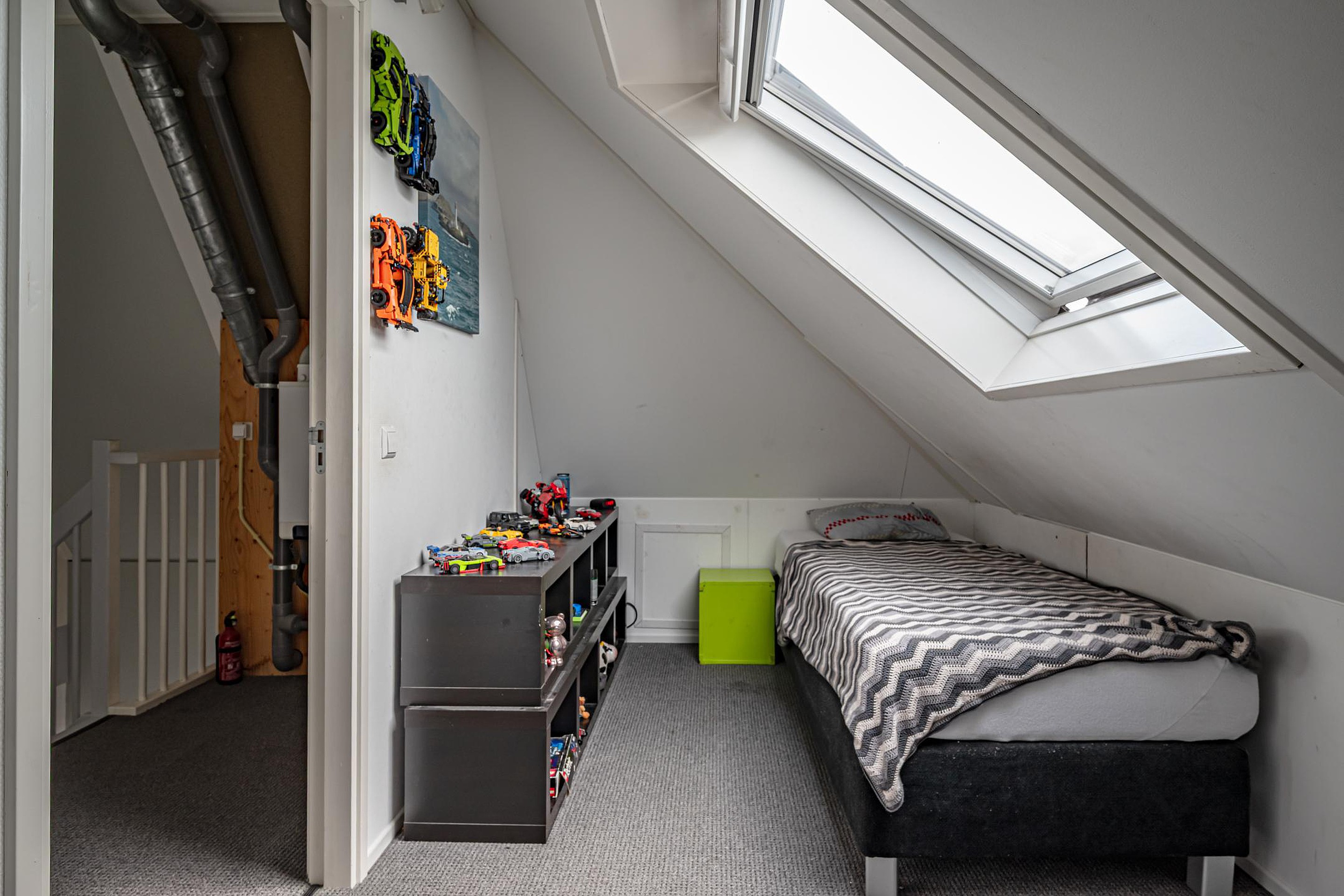 Vaste trap naar voorzolder met CV-ketel (Intergas, 2012), omvormer en praktische riante inloopkast met toegang tot kleine bergzolder. Twee slaapkamers met dakramen en volop bergruimte o.a. achter de knieschotten.