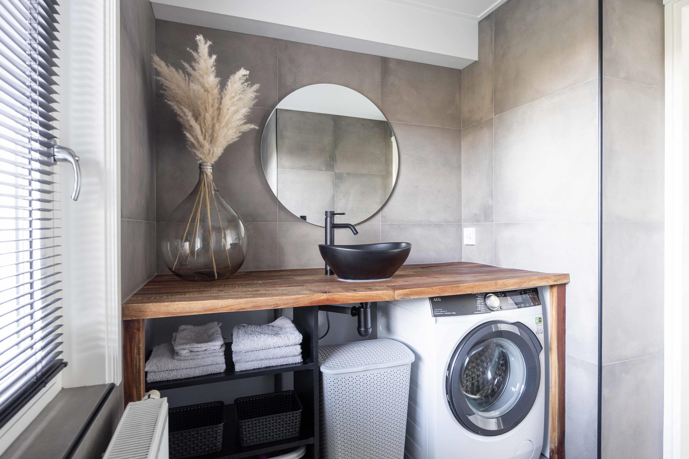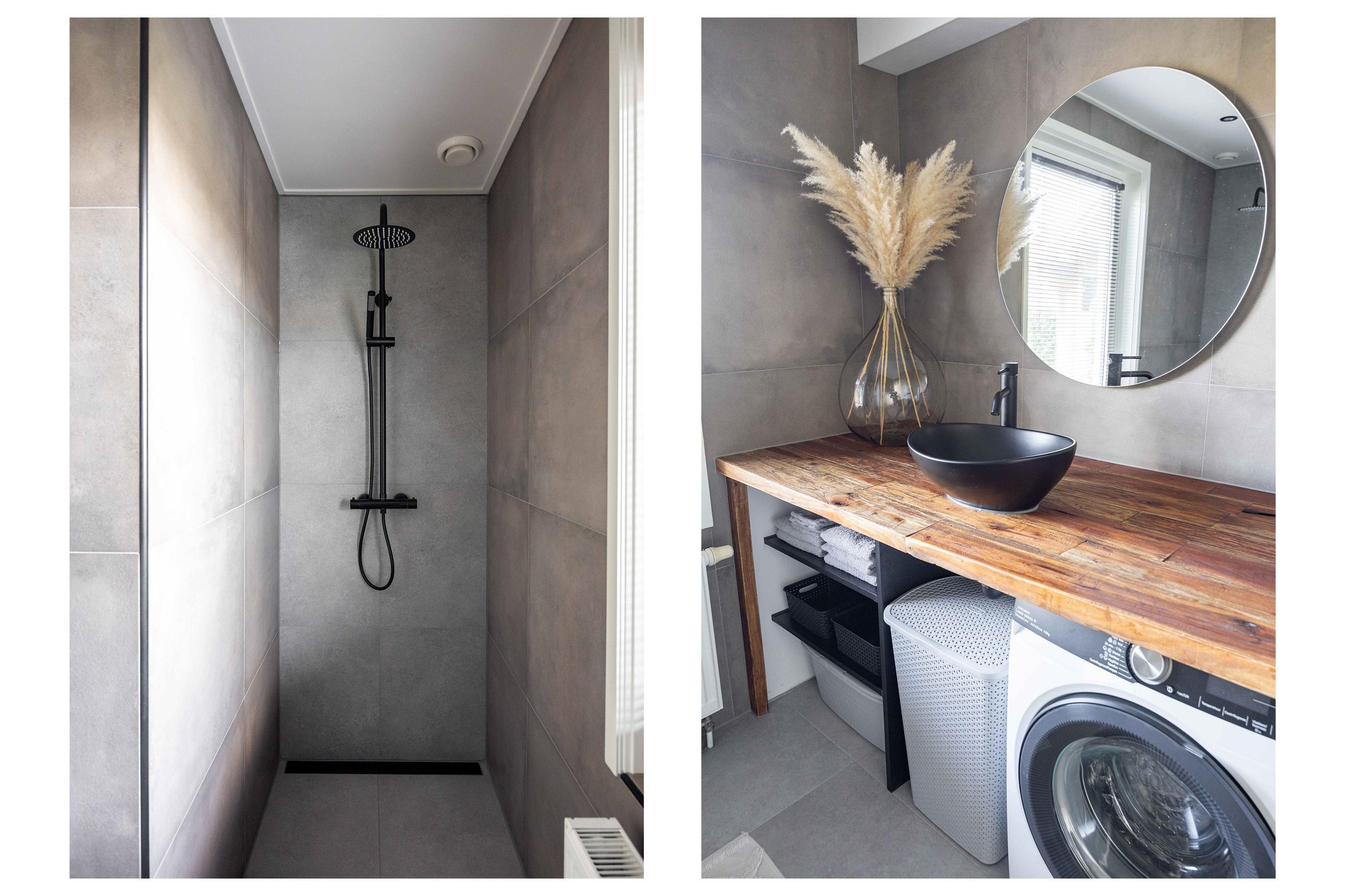 De badkamer bevindt zich op de begane grond en is volledig vernieuwd met een modern wastafelmeubel en een inloopdouche – een heerlijke plek om na een dag in de buitenlucht te ontspannen.