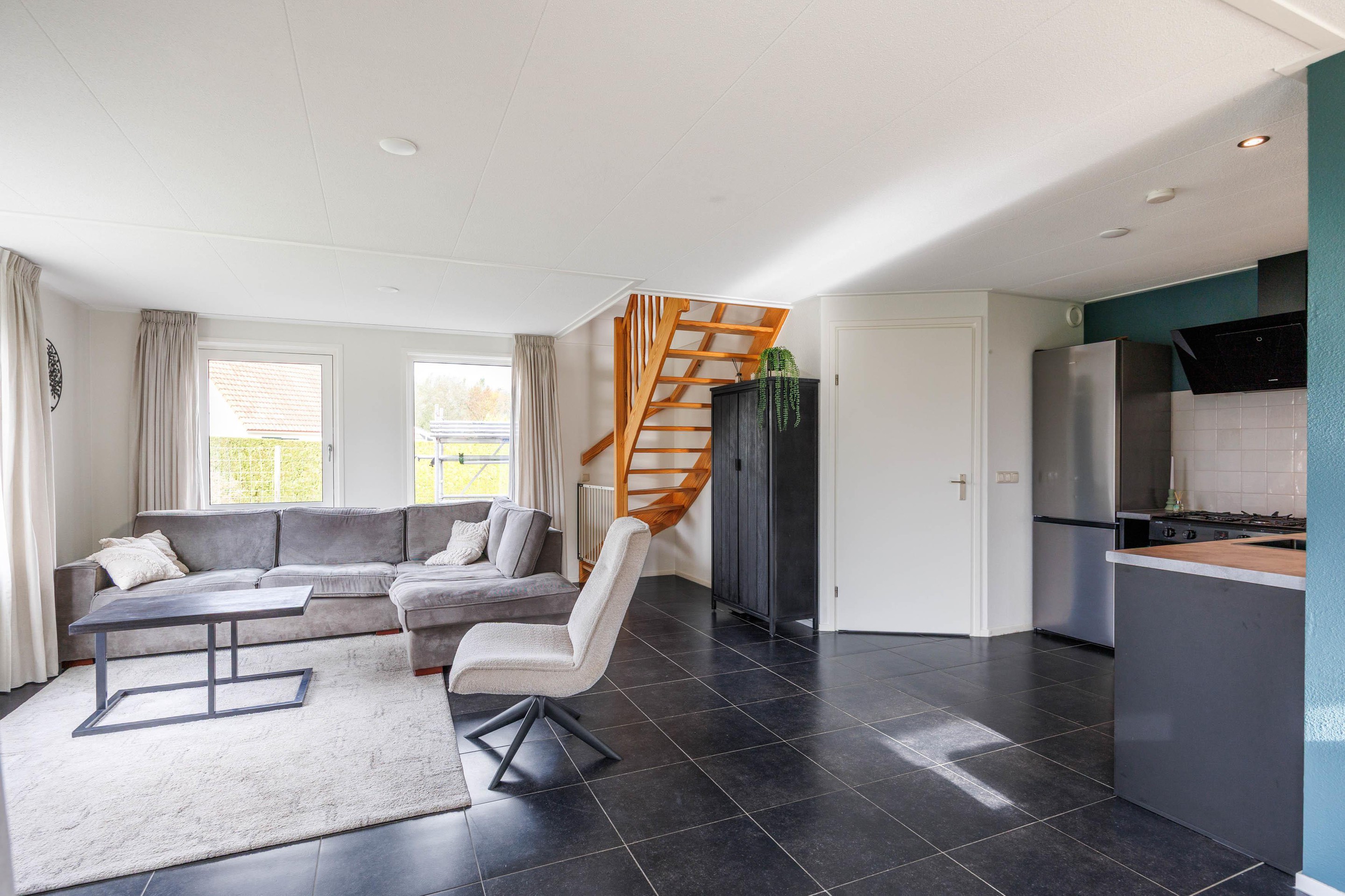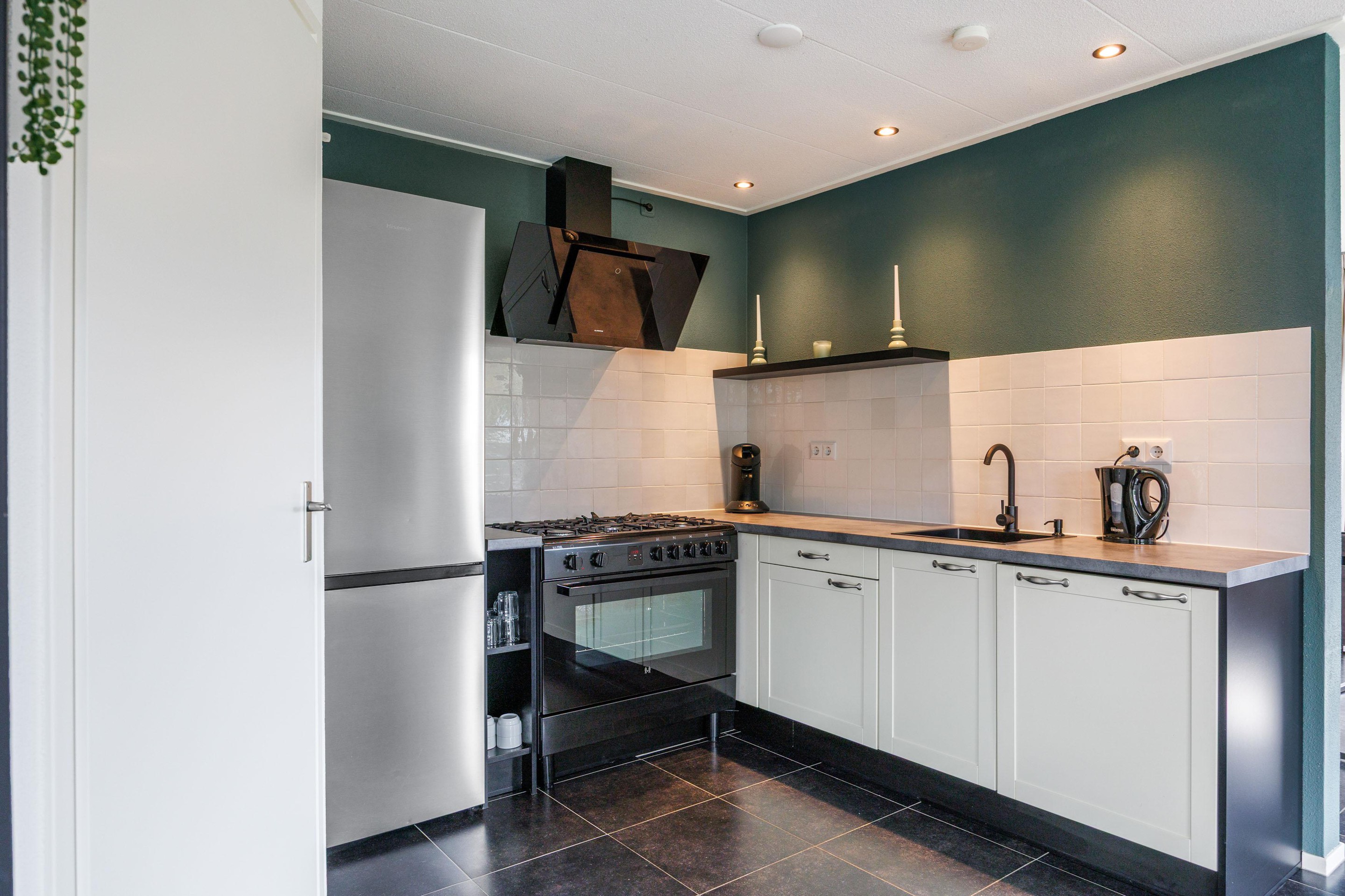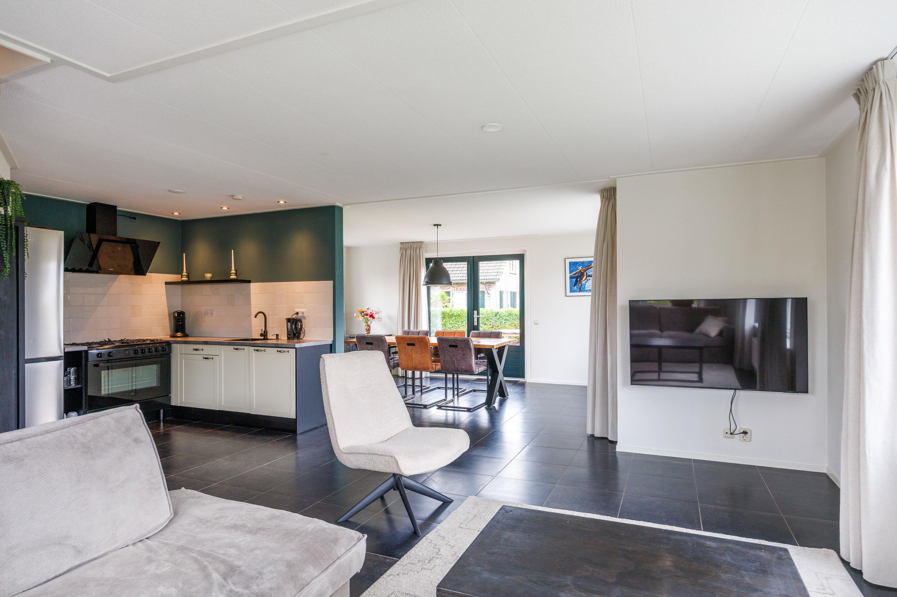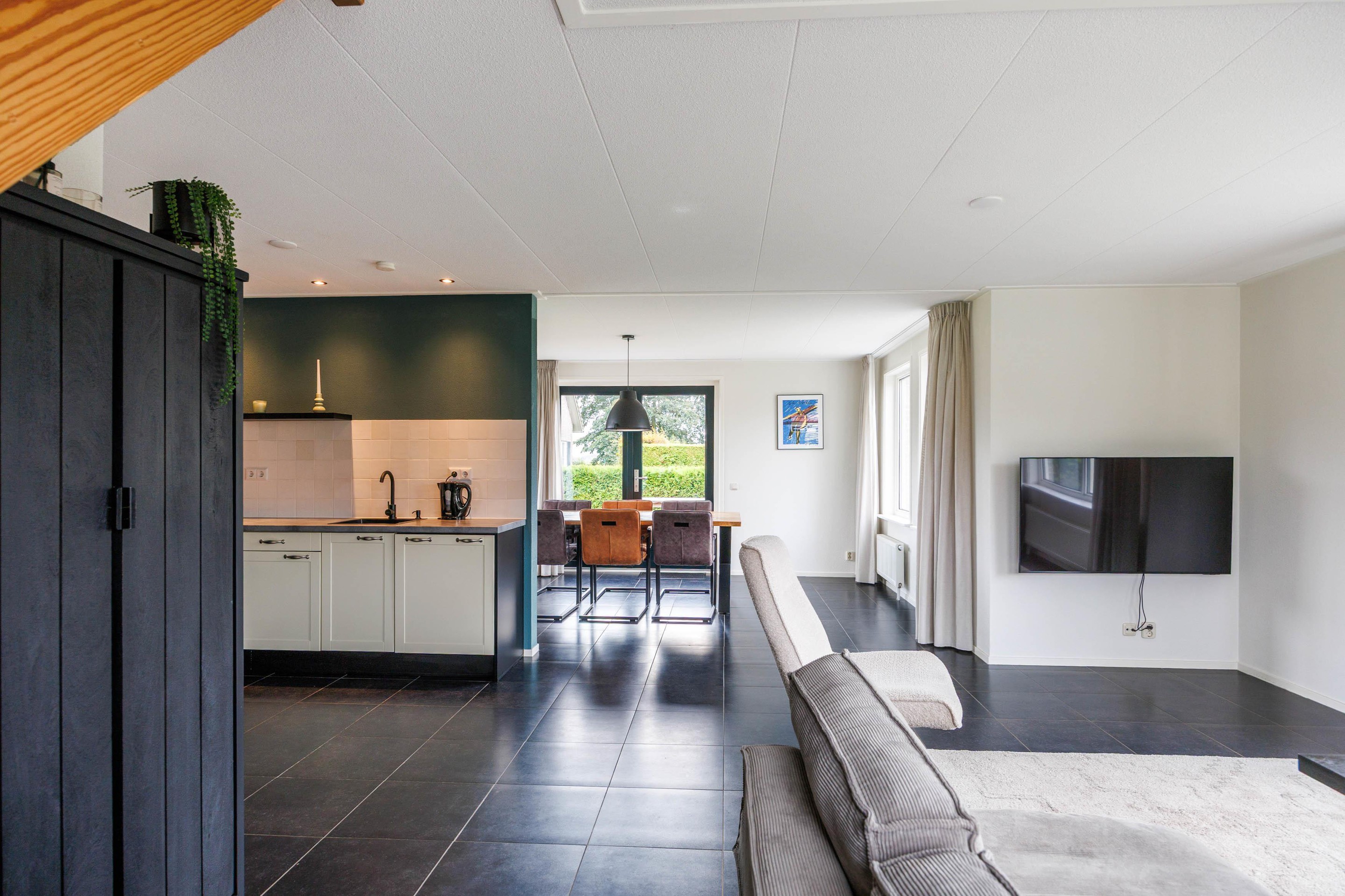 De open keuken is praktisch ingericht en voorzien van een gaskookplaat, oven, koelkast en vaatwasser. Dankzij de ruime indeling is er voldoende plek voor een eettafel en een royale zithoek.