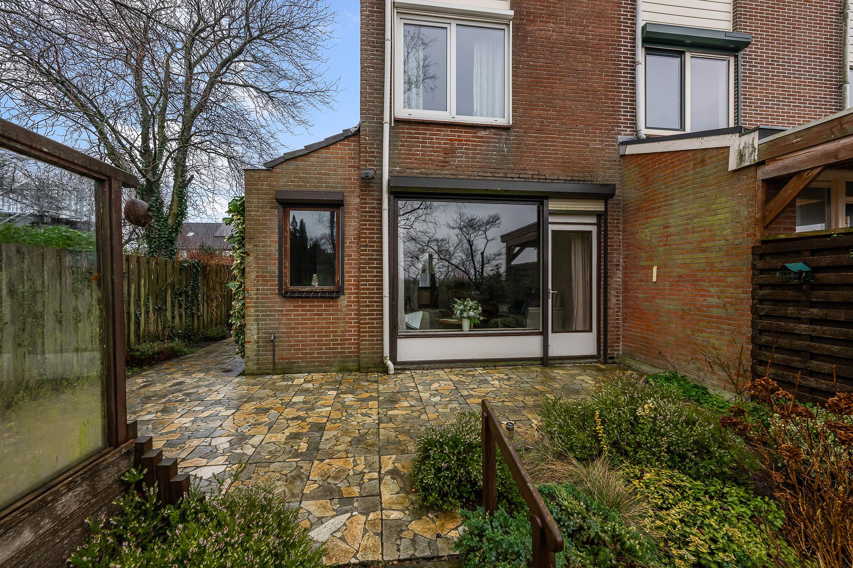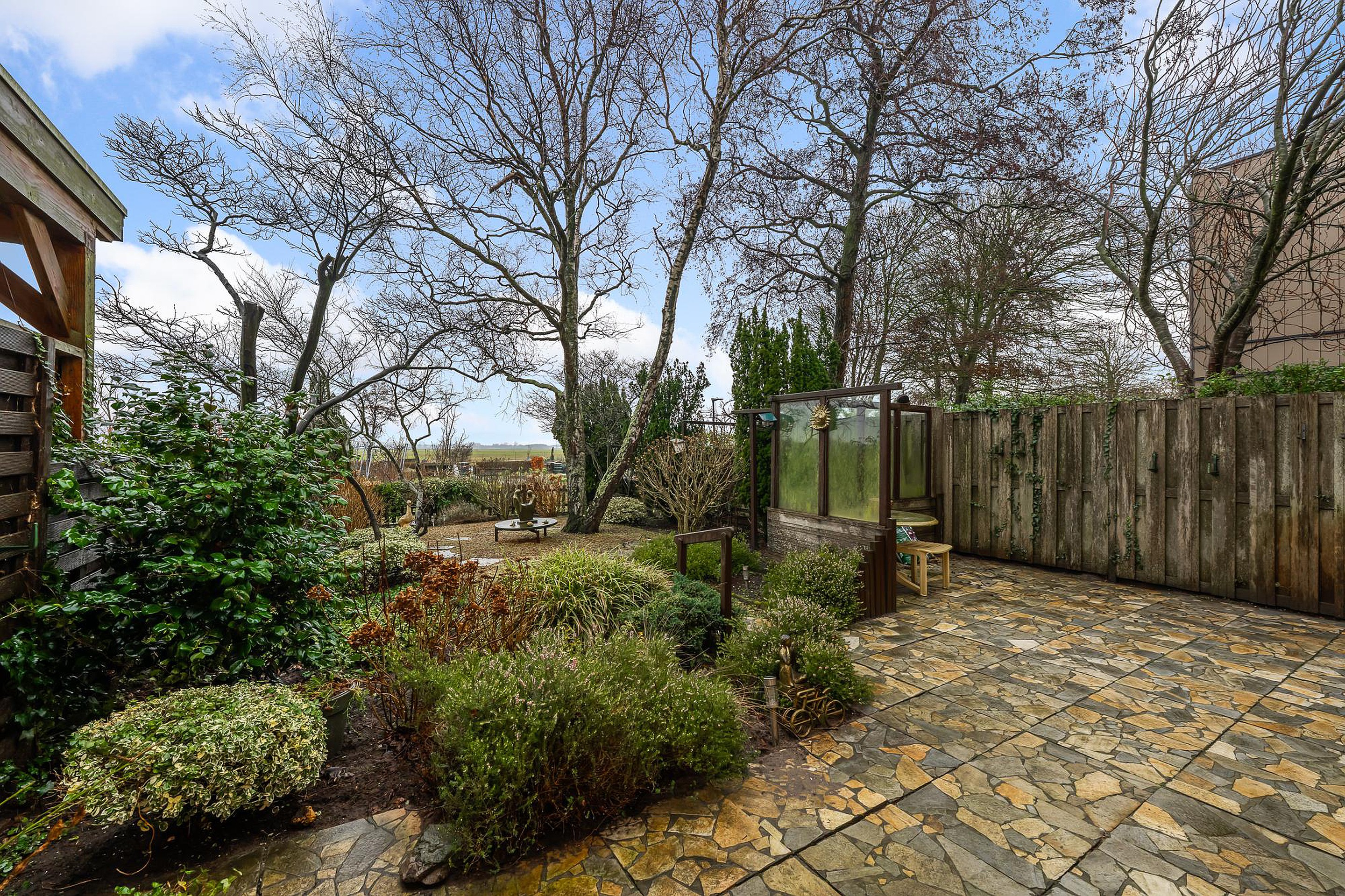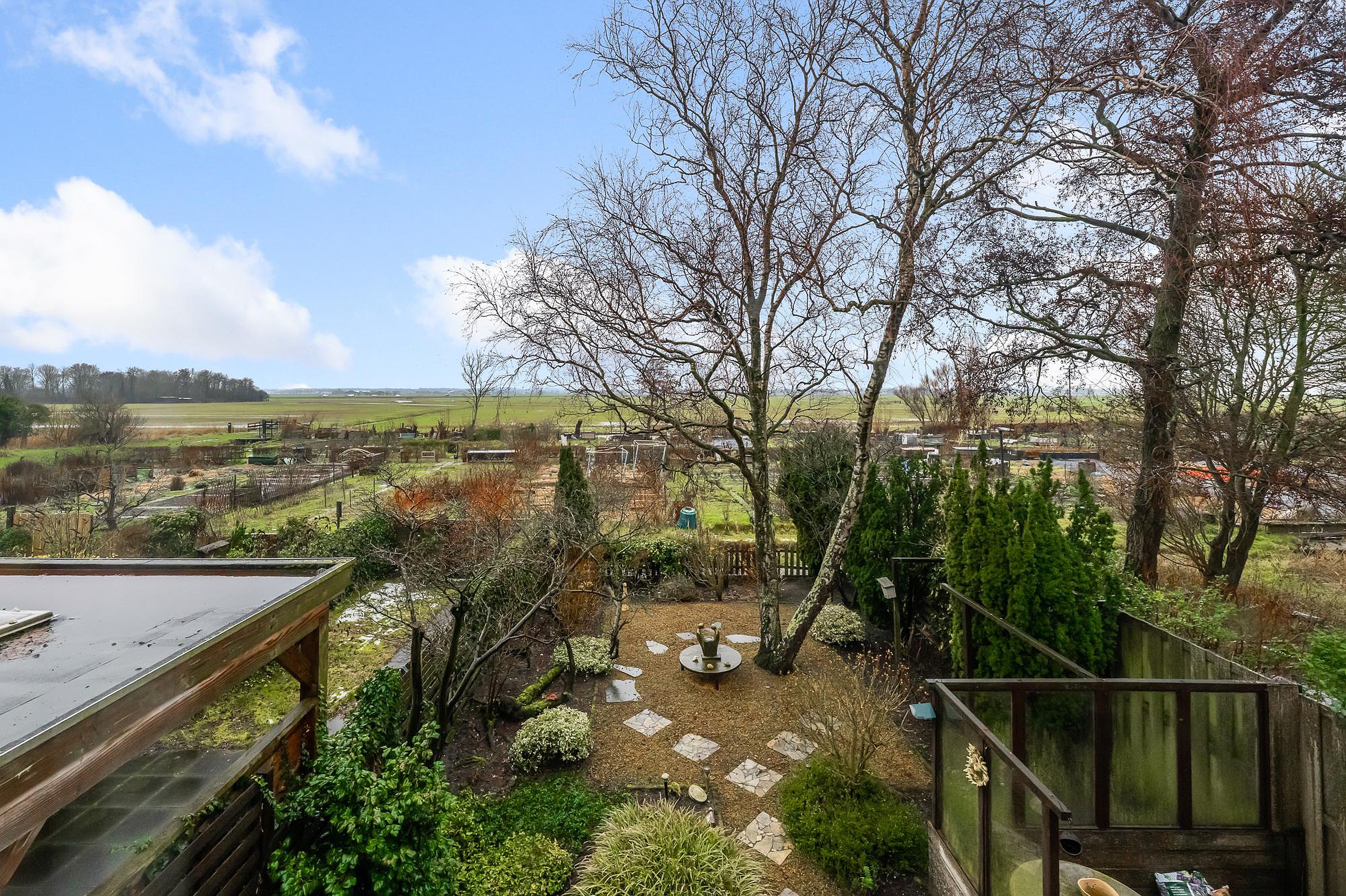 De achtertuin ligt op het noordwesten, een ideale ligging om vanaf de middag tot in de avond van de zon te genieten. Hier ervaar je rust, ruimte en een uitzonderlijk mooi uitzicht over het open landschap. Een heerlijke plek om te ontspannen, te tuinieren of lange zomeravonden door te brengen.