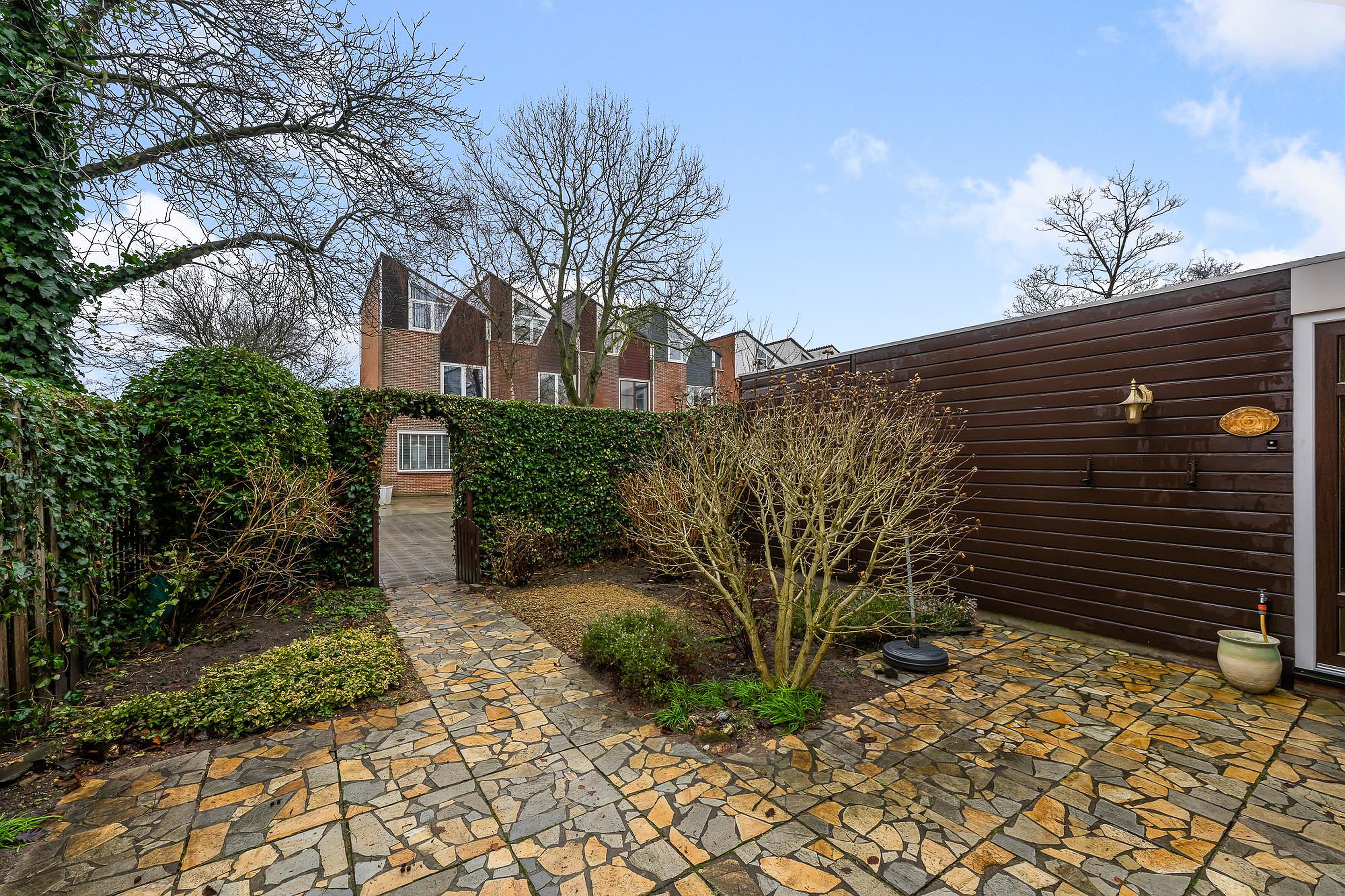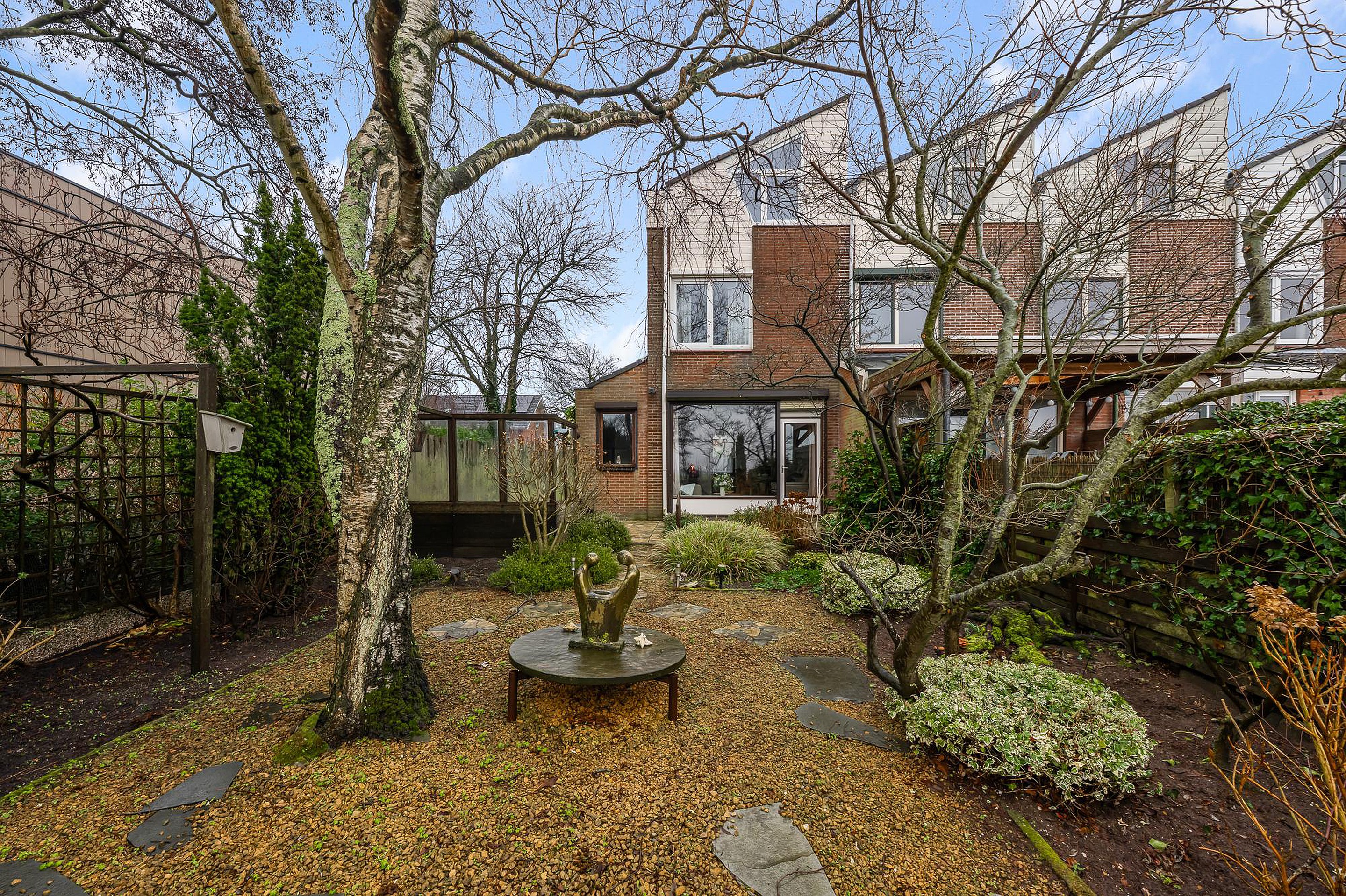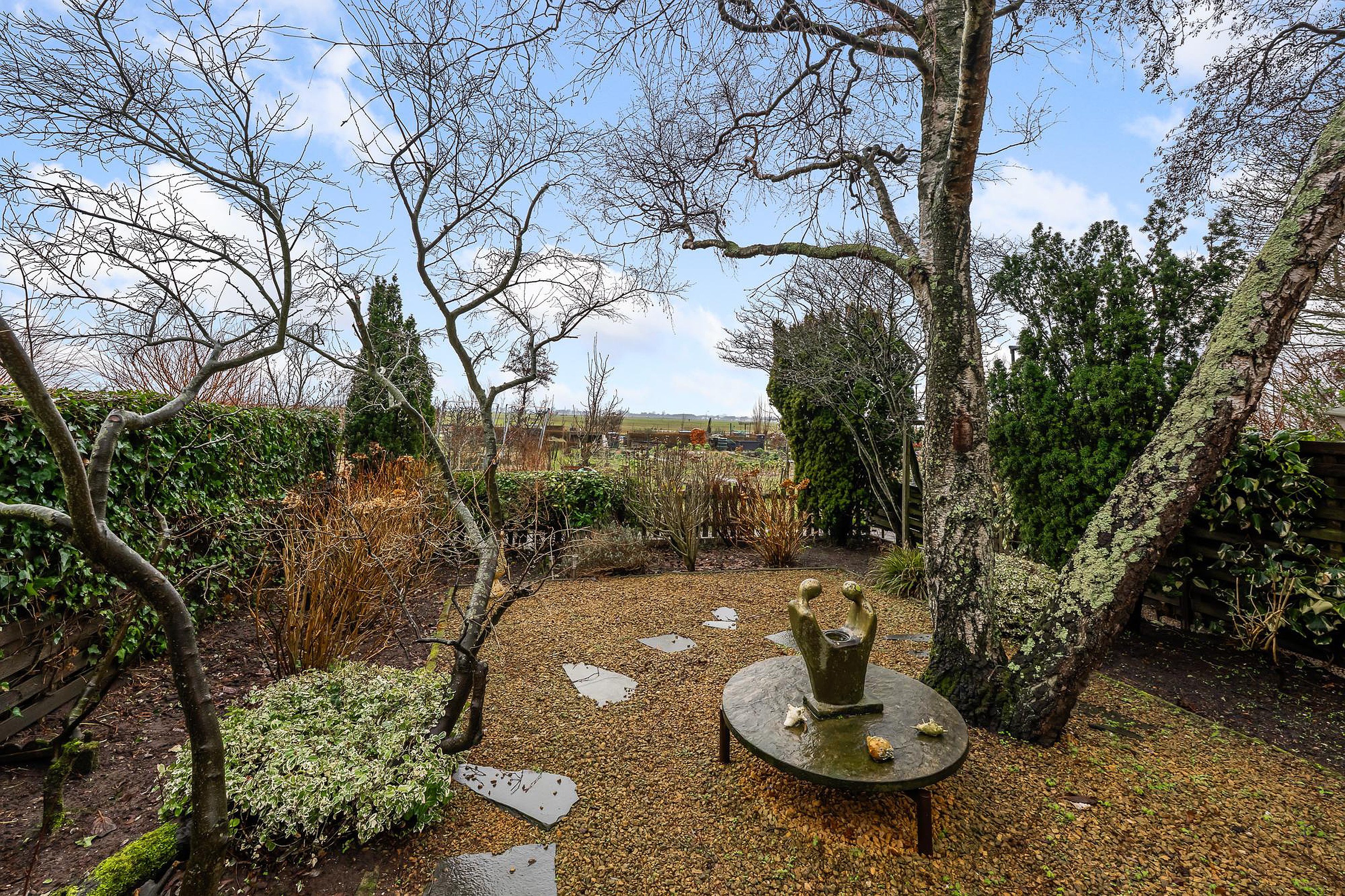 De achtertuin ligt op het noordwesten, een ideale ligging om vanaf de middag tot in de avond van de zon te genieten. Hier ervaar je rust, ruimte en een uitzonderlijk mooi uitzicht over het open landschap. Een heerlijke plek om te ontspannen, te tuinieren of lange zomeravonden door te brengen.