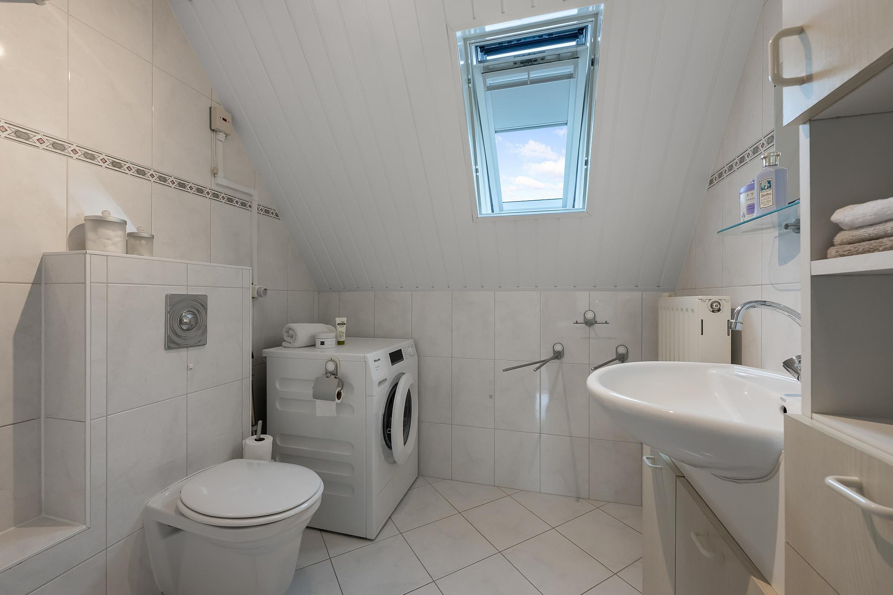 Overloop met toegang tot drie goed bemeten slaapkamers. De badkamer is praktisch ingericht en voorzien van een douche, wastafel, toilet en aansluiting voor de wasmachine.