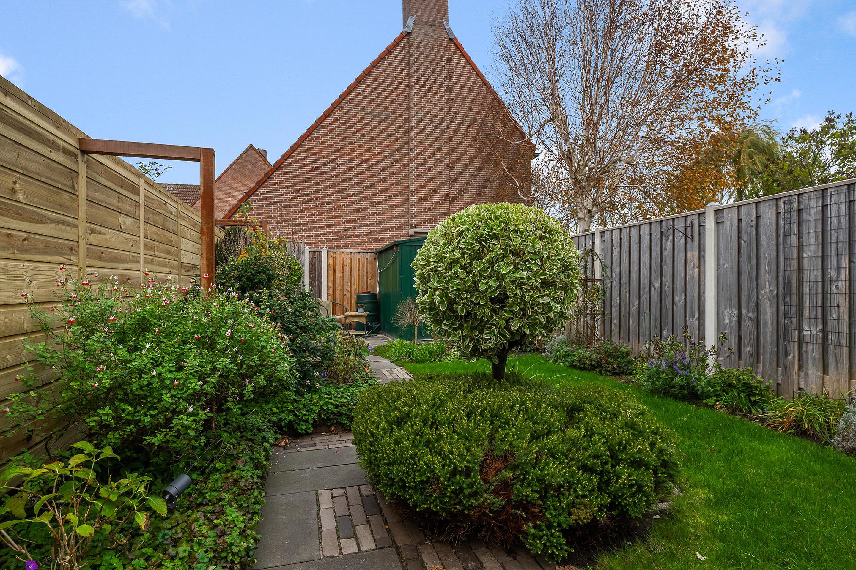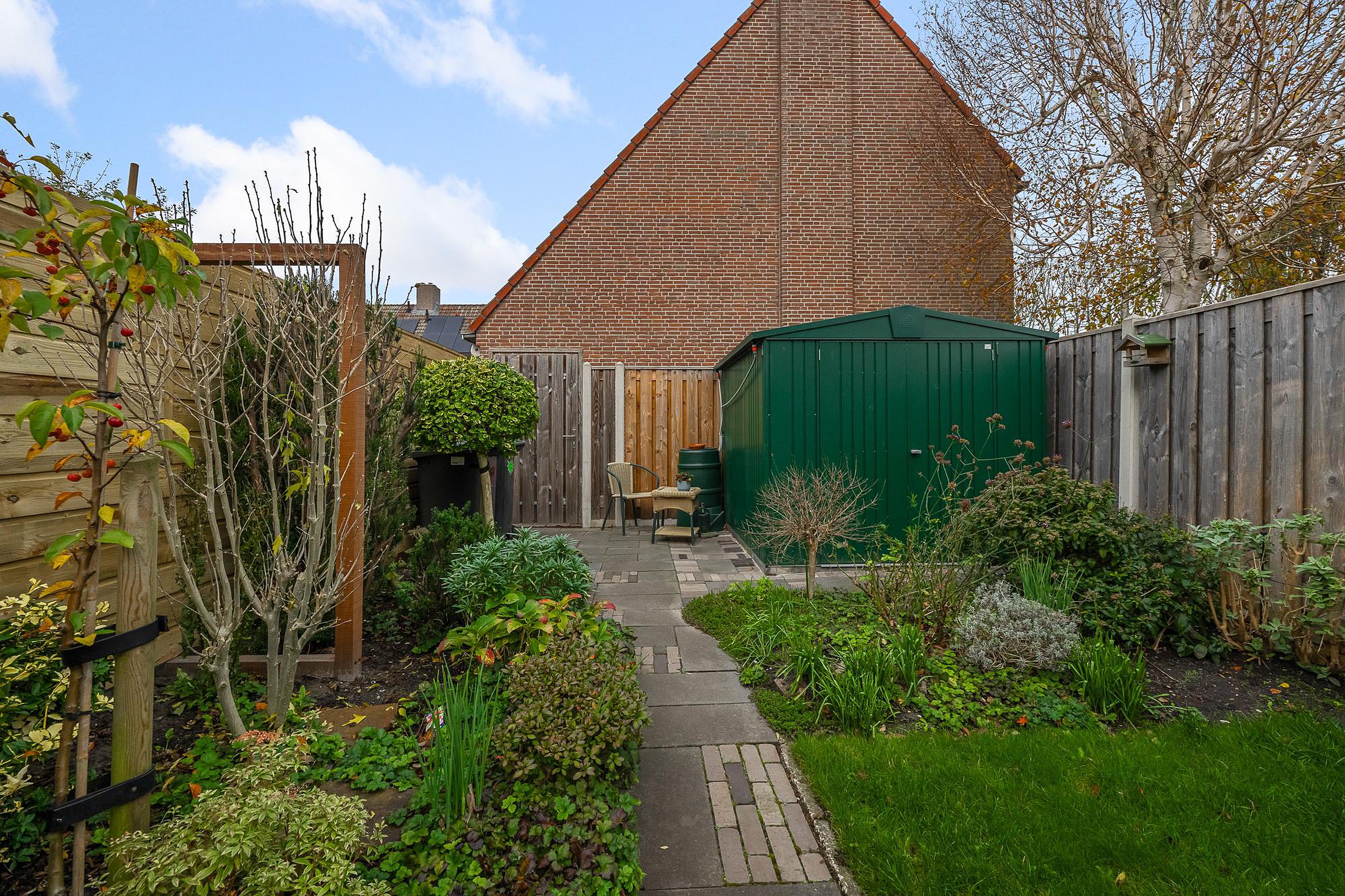 De woning beschikt over een verzorgde westelijk gelegen achtertuin, bestaande uit zowel bestrating als groen. Een heerlijke plek om te zitten, te spelen of te tuinieren. Verder is er een achterom en een separate berging voor bijvoorbeeld fietsen en gereedschap.