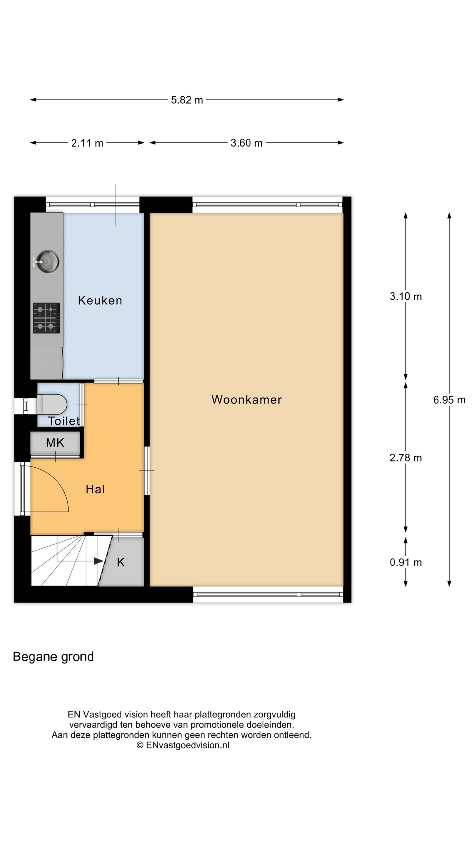 Entree met hal, meterkast, toilet en trapopgang. Vanuit de hal bereik je de gesloten keuken met toegang tot de achtertuin. De woonkamer is heerlijk licht door de ramen aan de voor- en achterzijde.