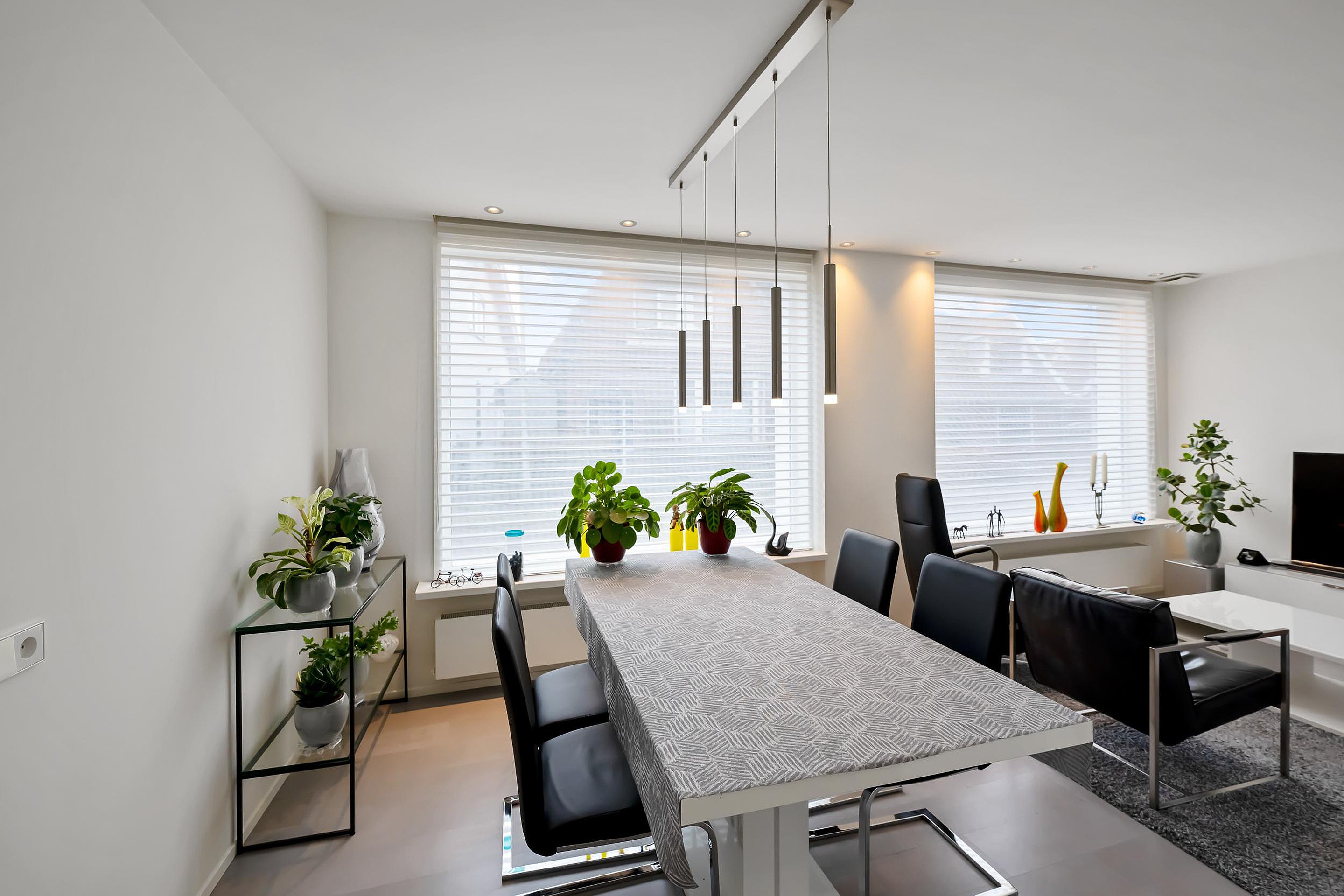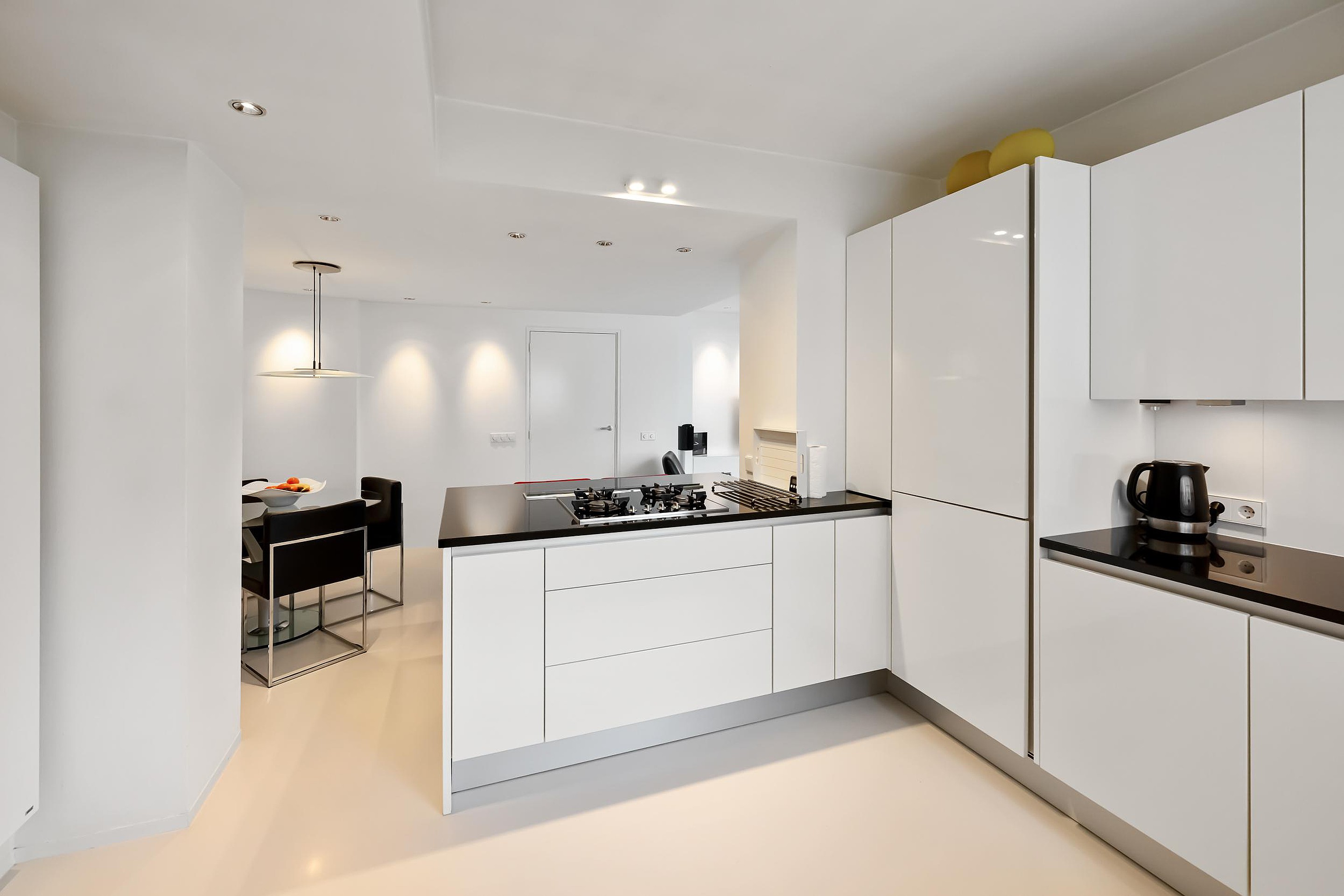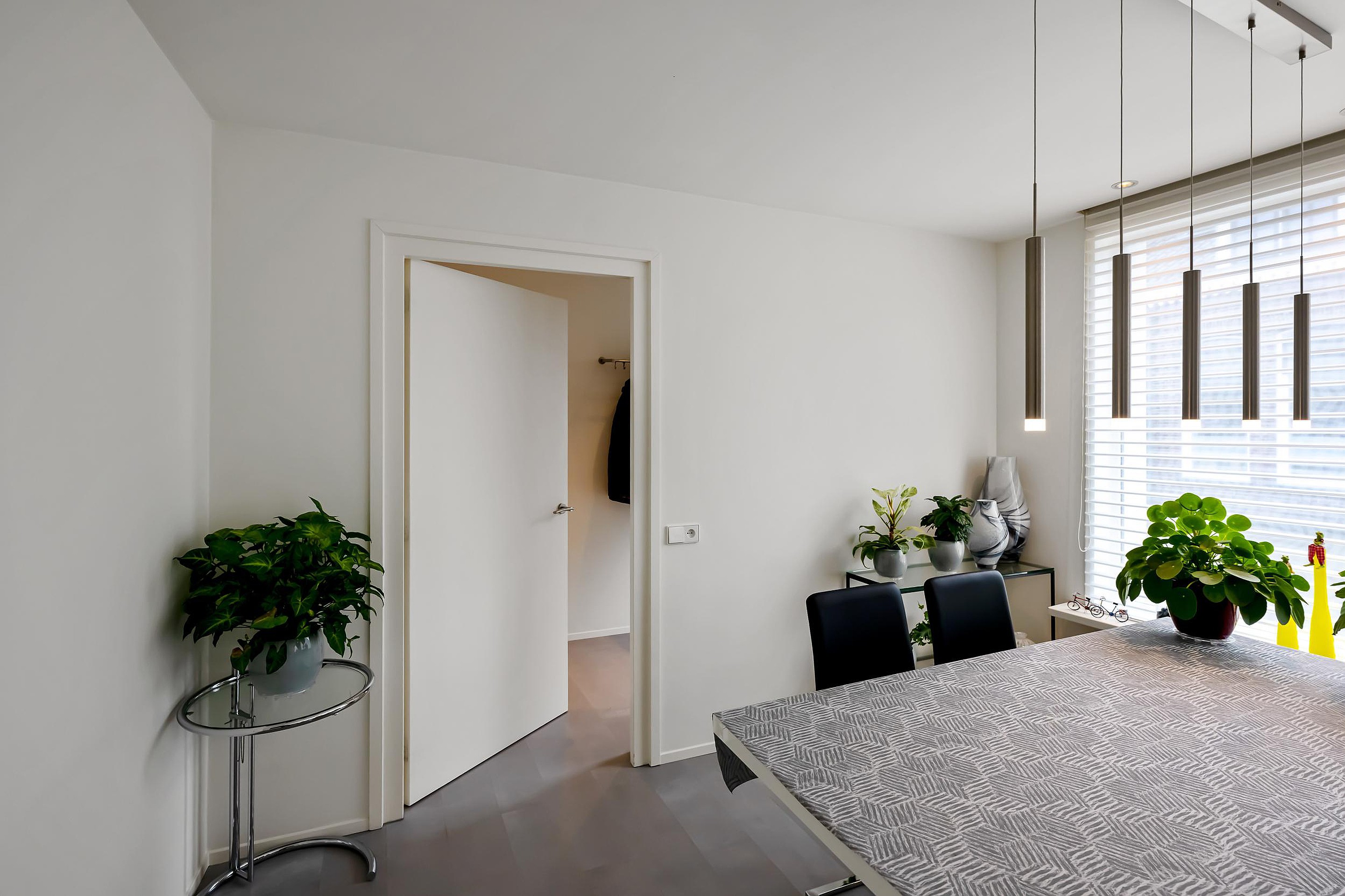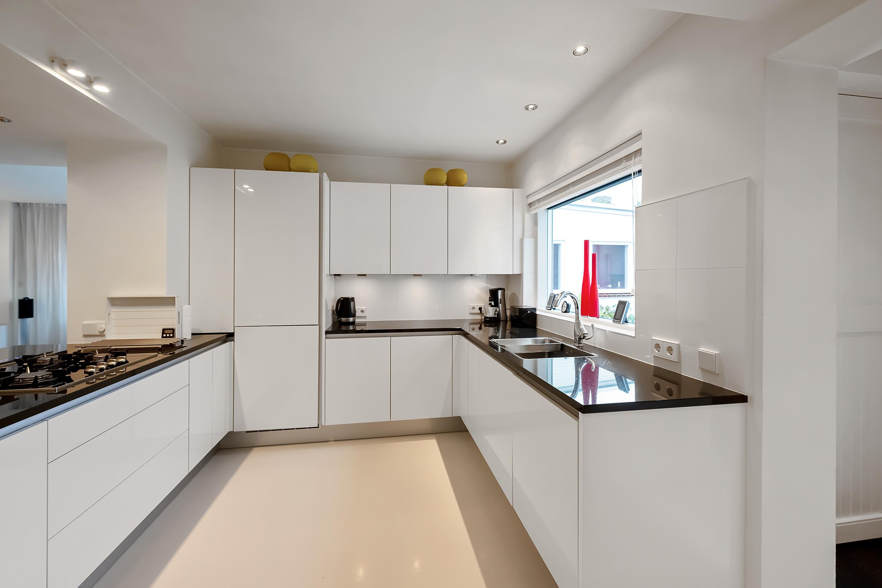 Via de tweede hal is de trap naar de eerste verdieping, en ook de toegang naar de achter(woonkamer). Vanaf hier loop je zo de luxe open keuken in die is voorzien van alle benodigde apparatuur om heerlijk te kokkerellen.
