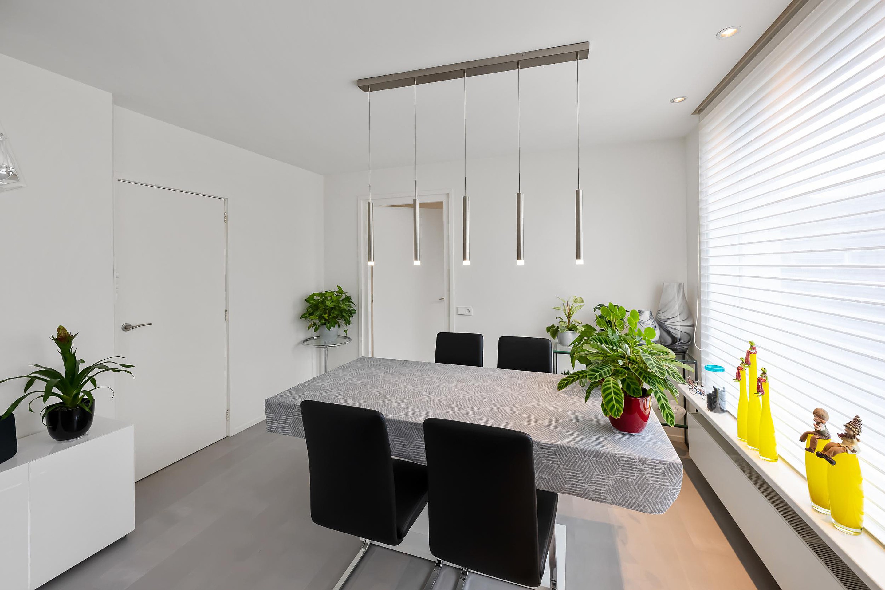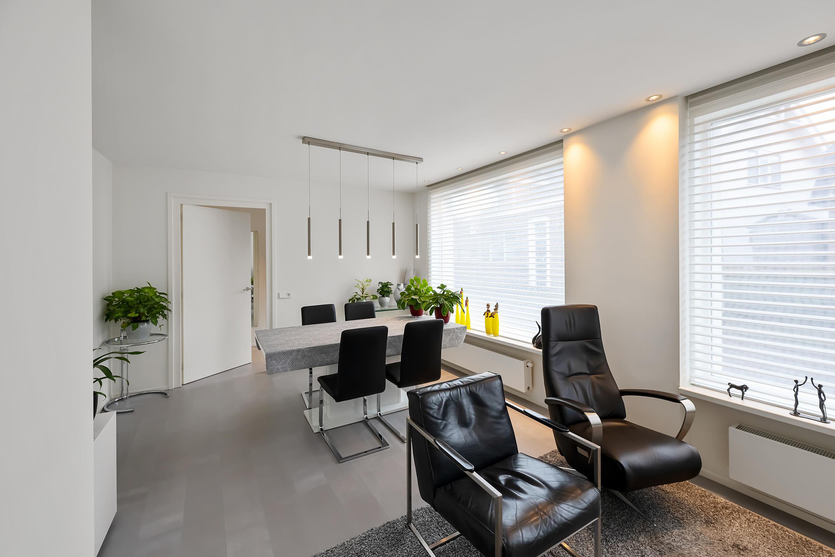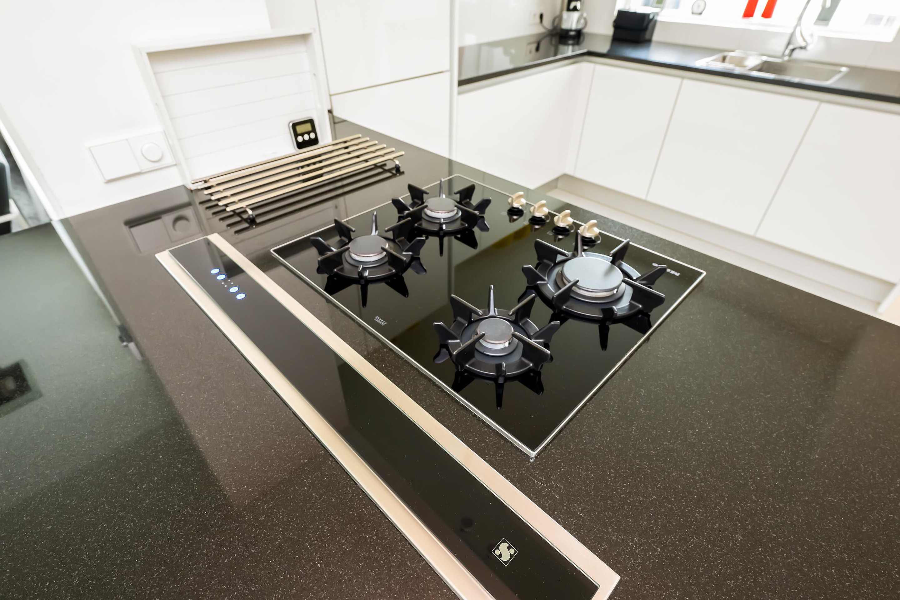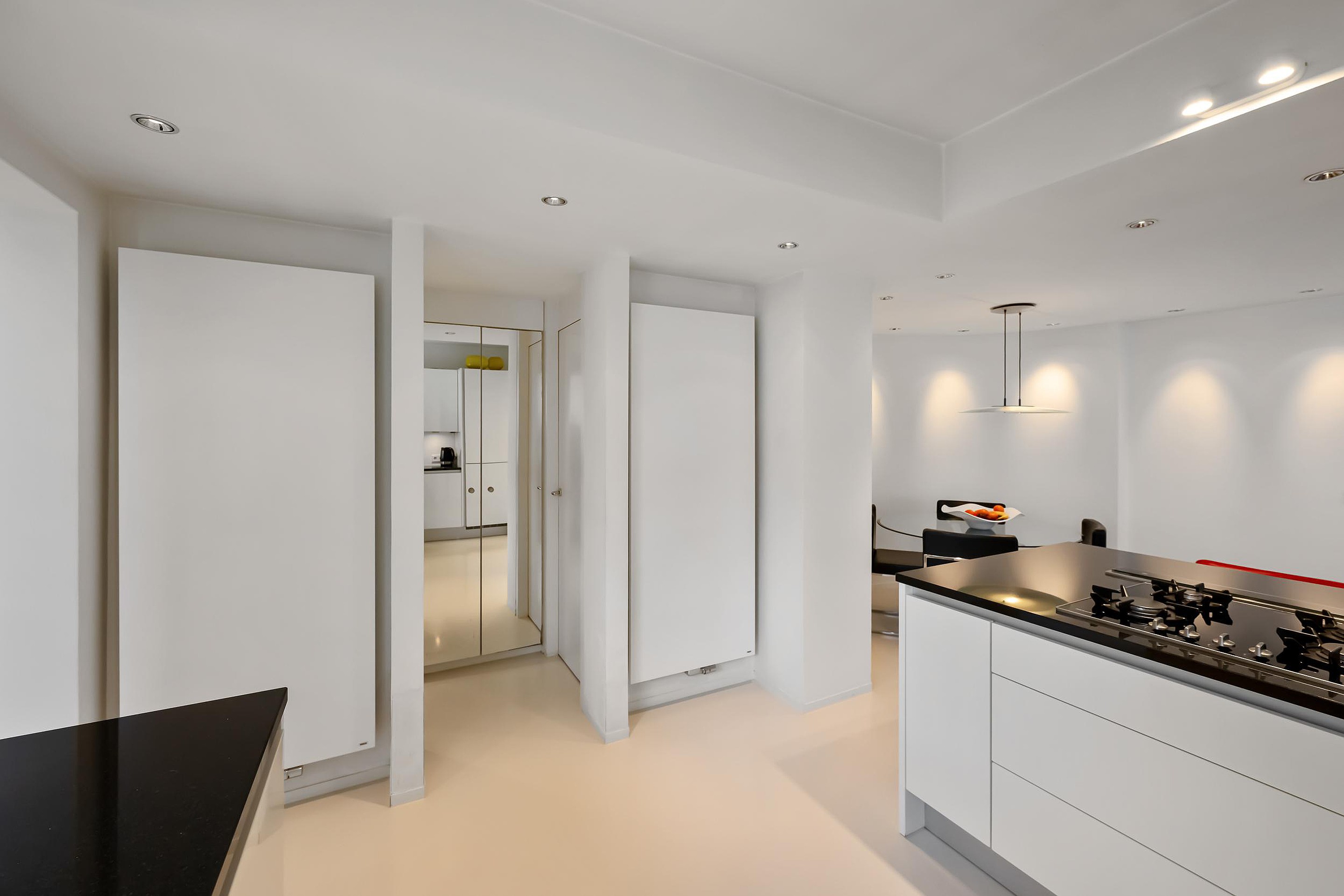 Via de tweede hal is de trap naar de eerste verdieping, en ook de toegang naar de achter(woonkamer). Vanaf hier loop je zo de luxe open keuken in die is voorzien van alle benodigde apparatuur om heerlijk te kokkerellen.