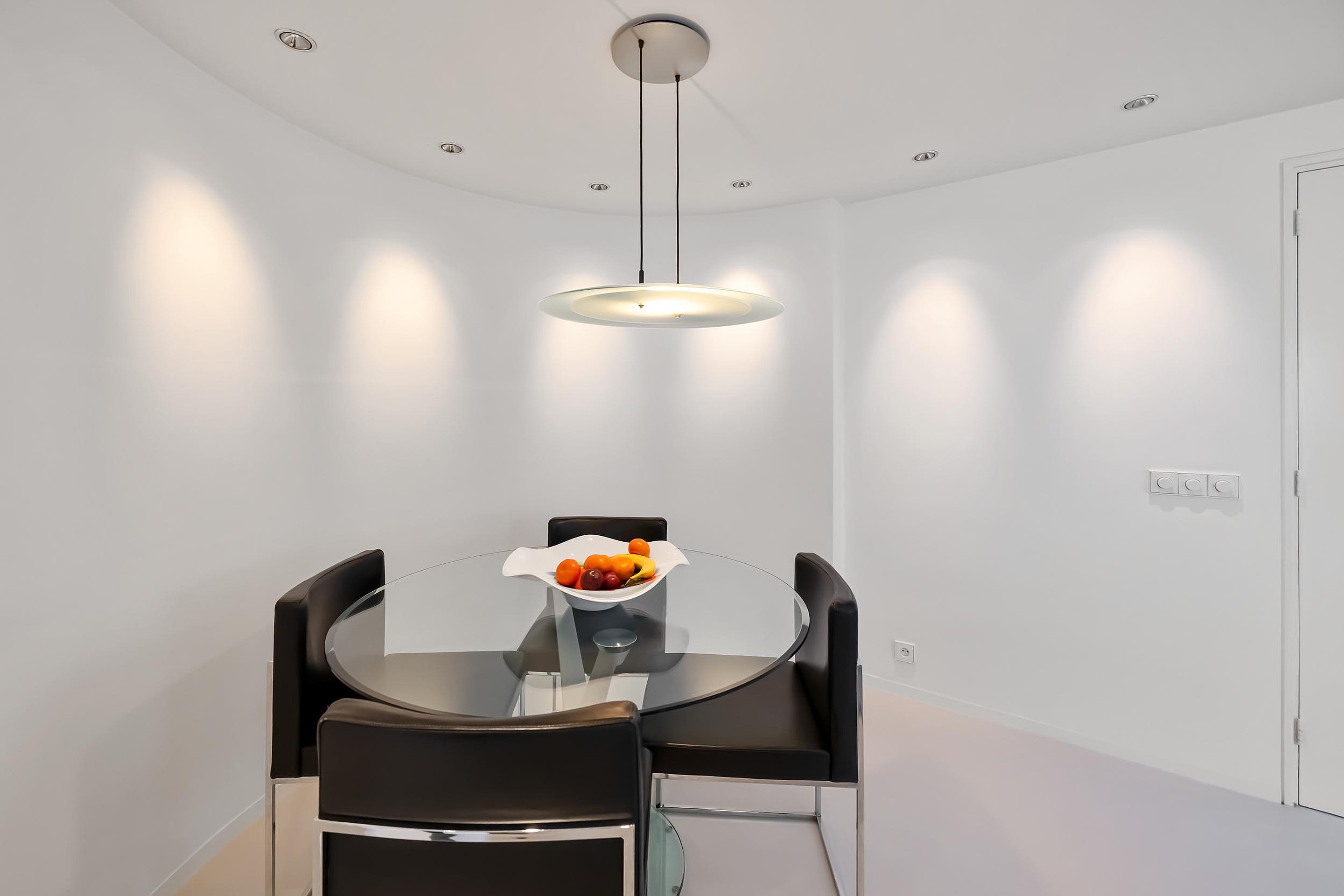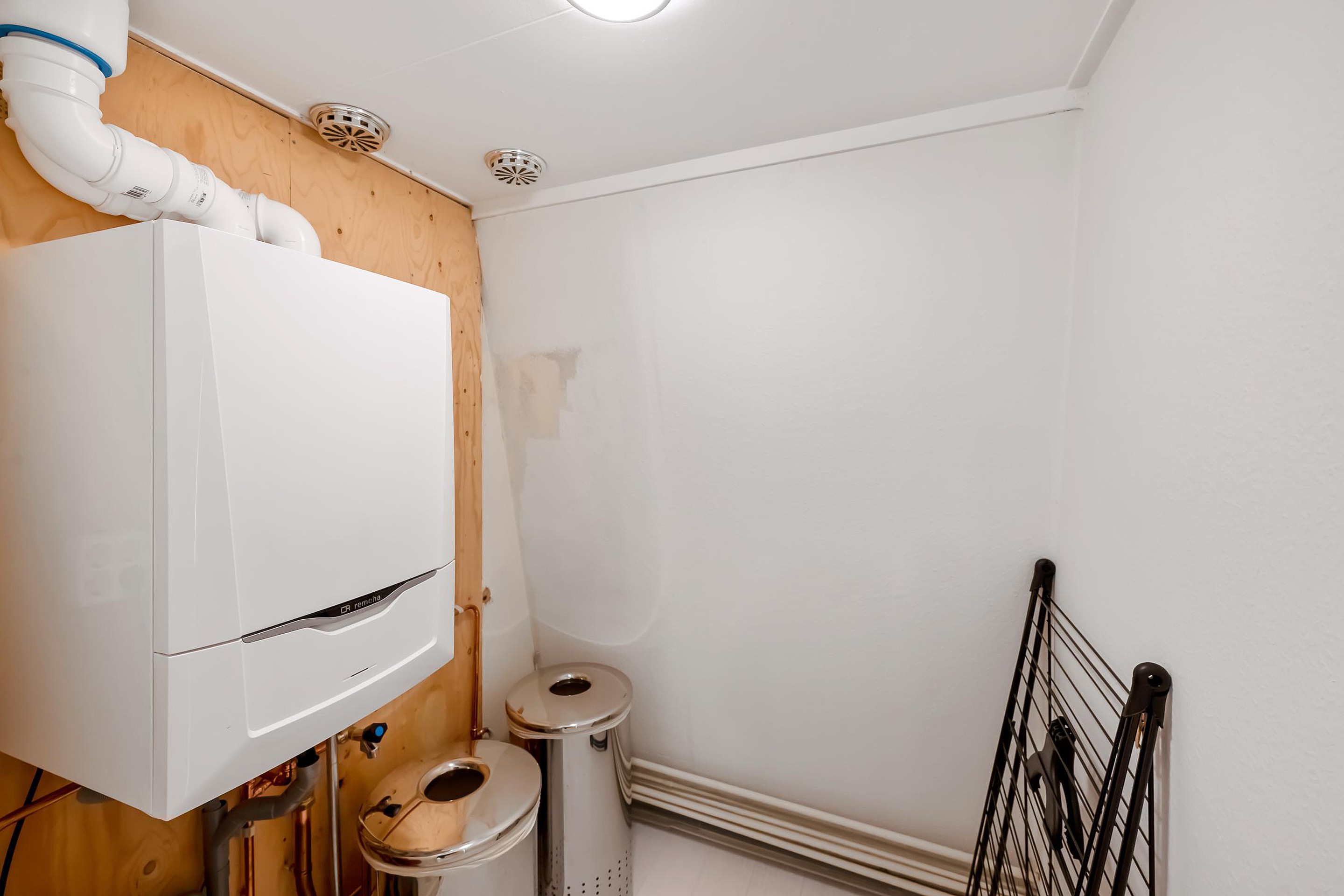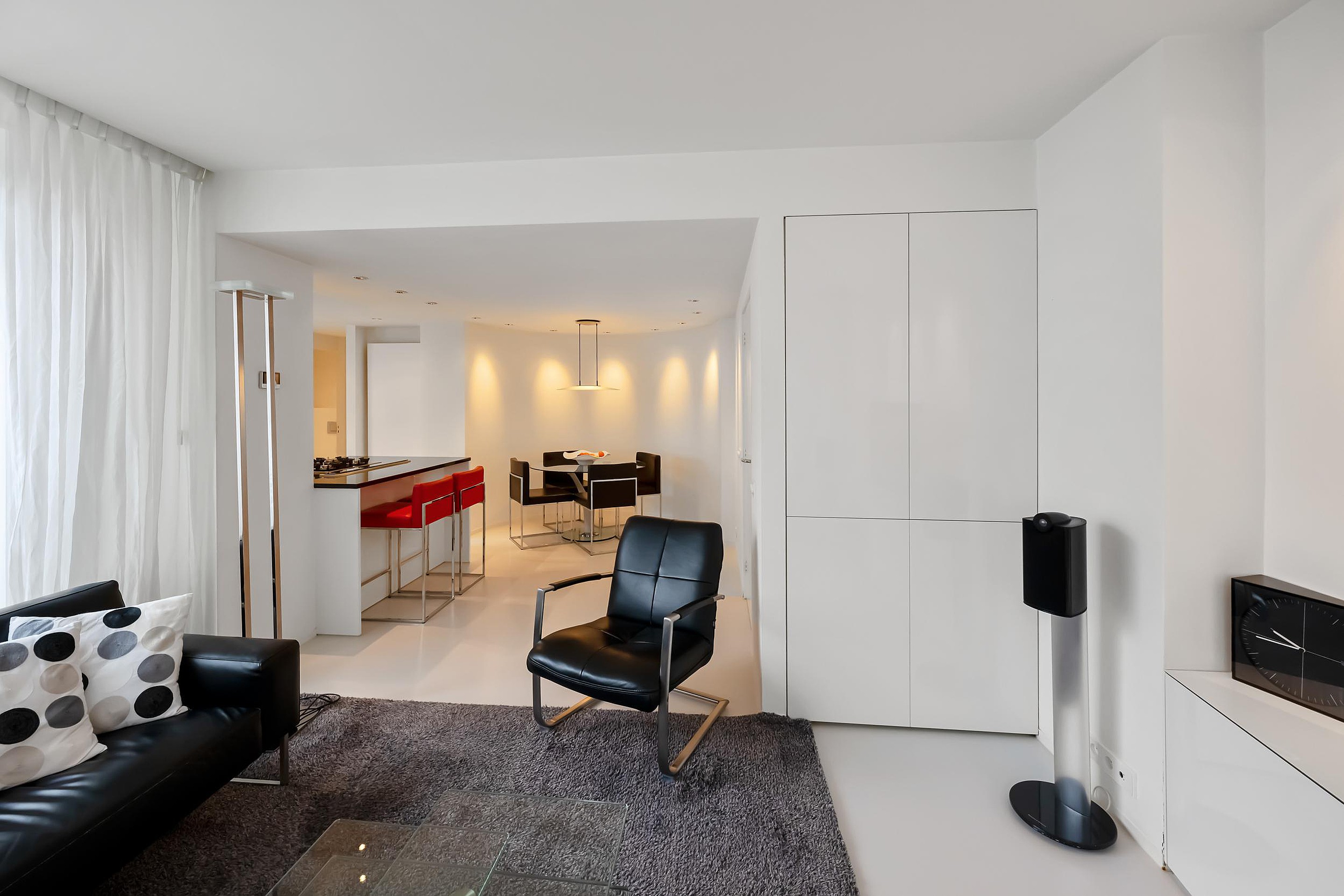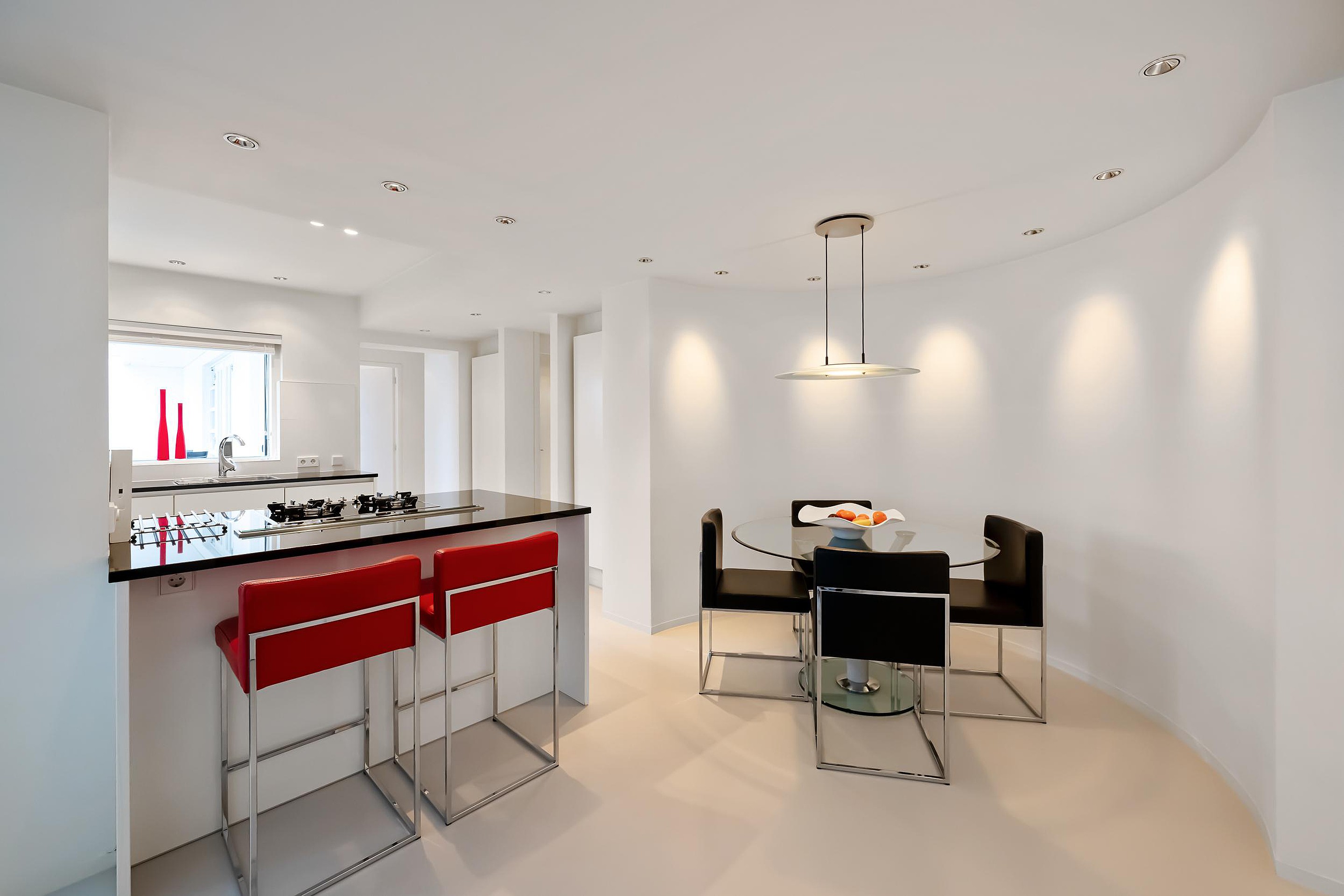 Via de tweede hal is de trap naar de eerste verdieping, en ook de toegang naar de achter(woonkamer). Vanaf hier loop je zo de luxe open keuken in die is voorzien van alle benodigde apparatuur om heerlijk te kokkerellen.
