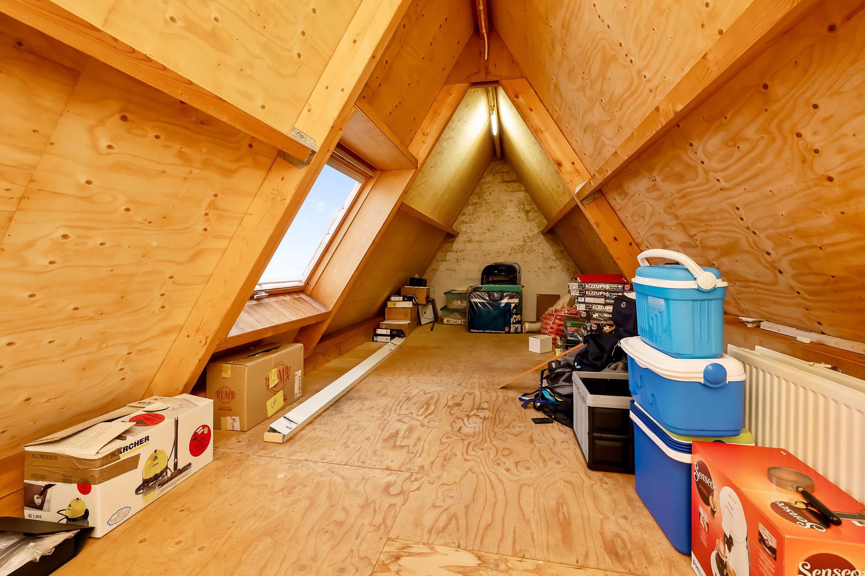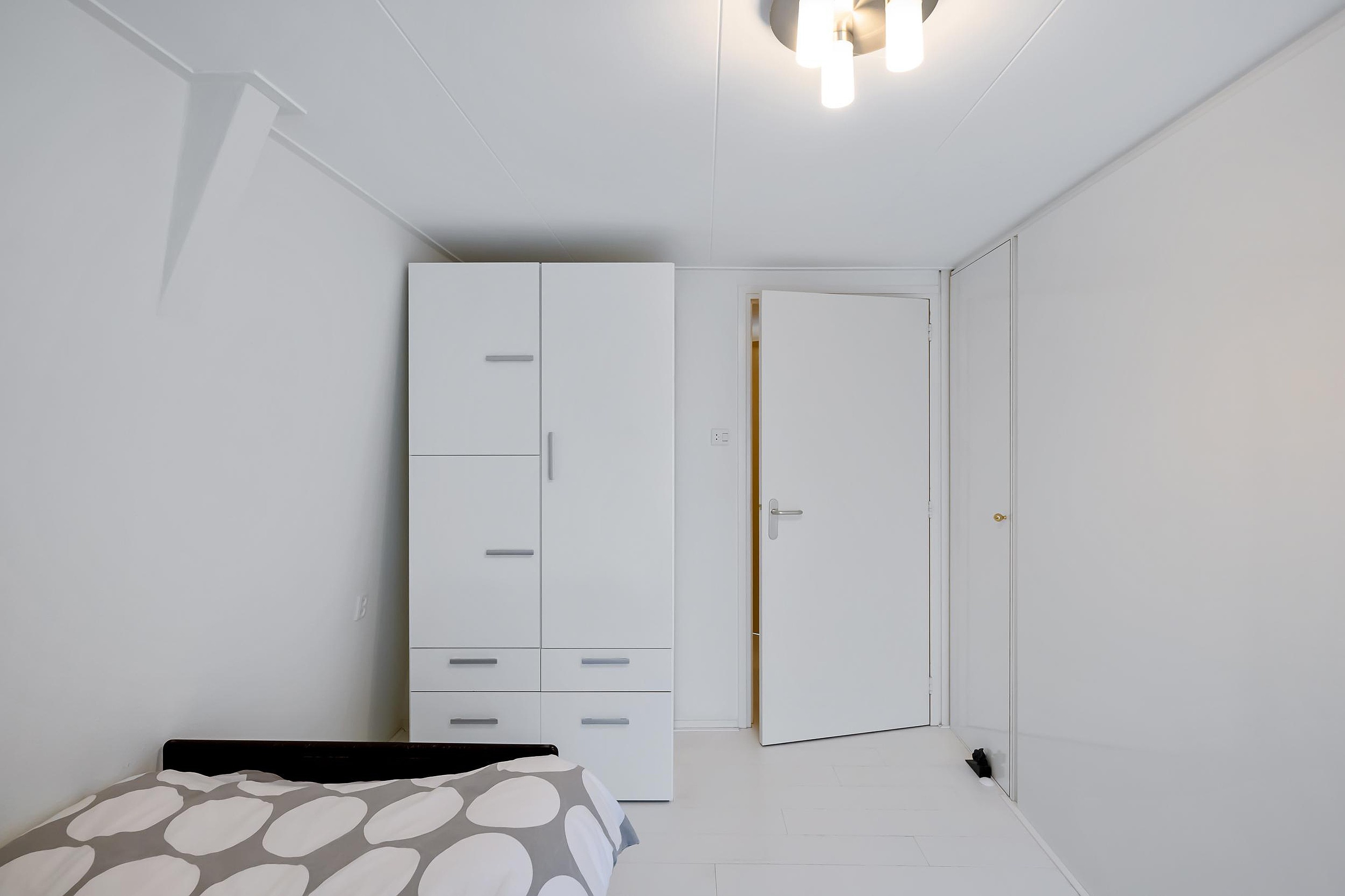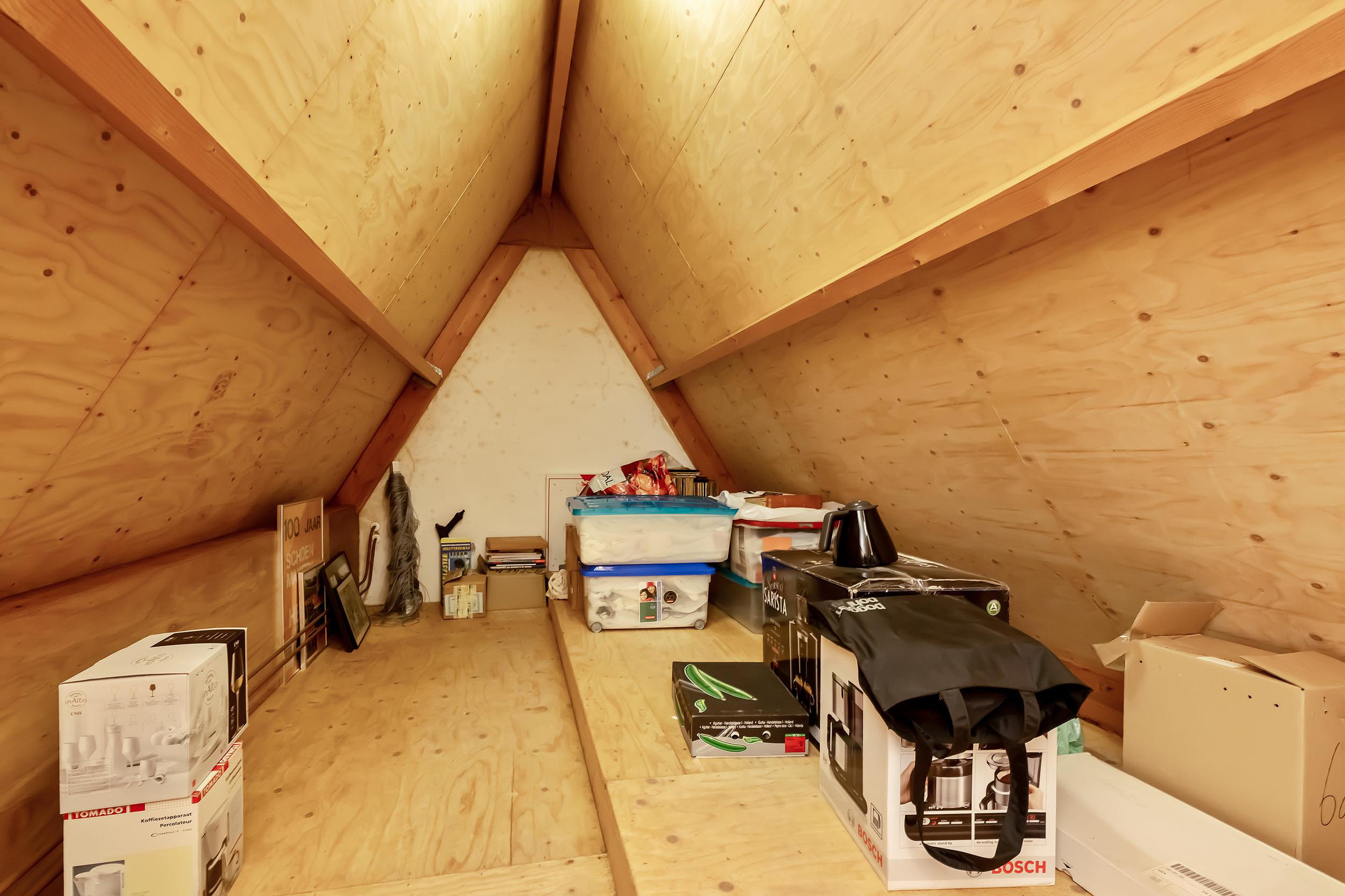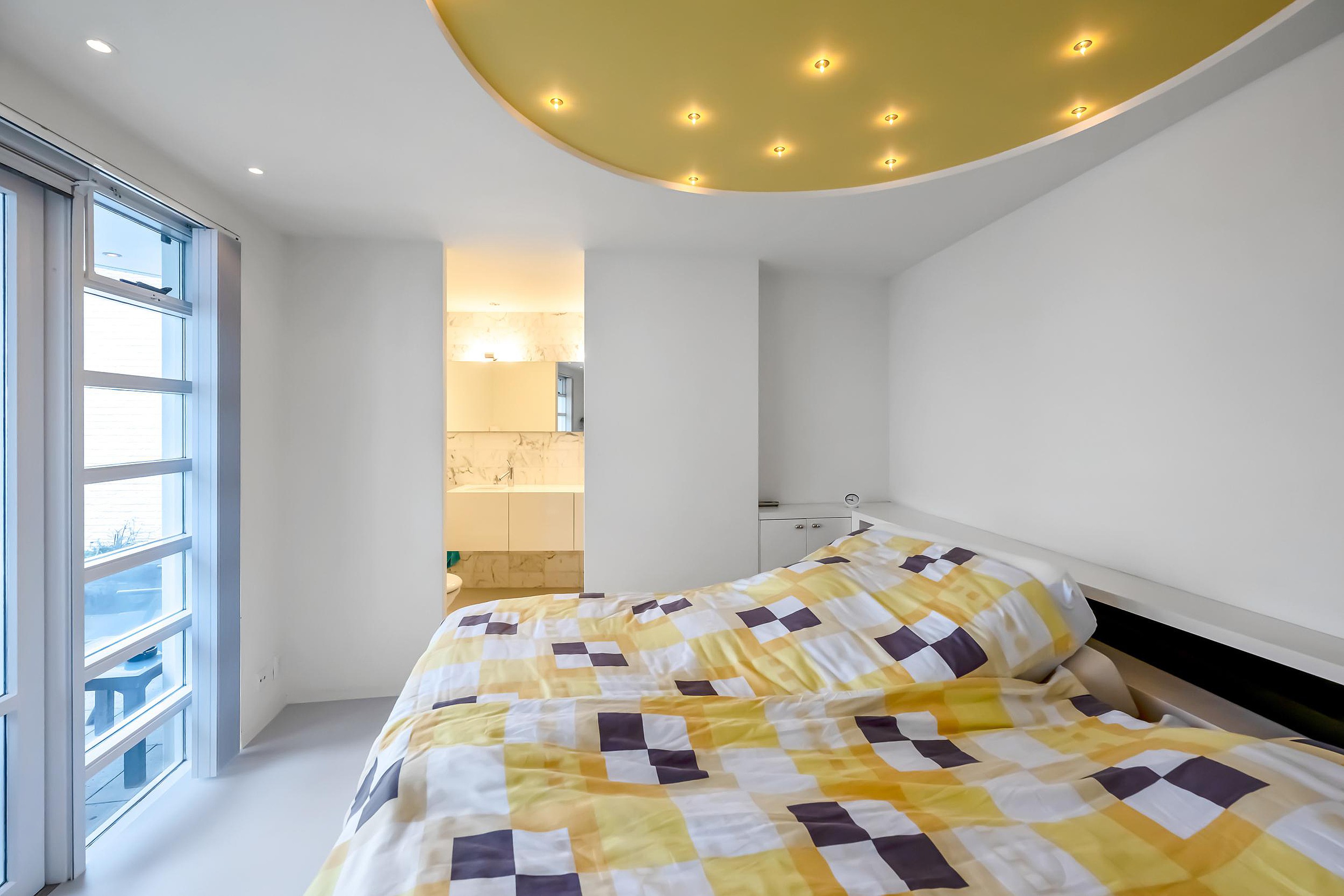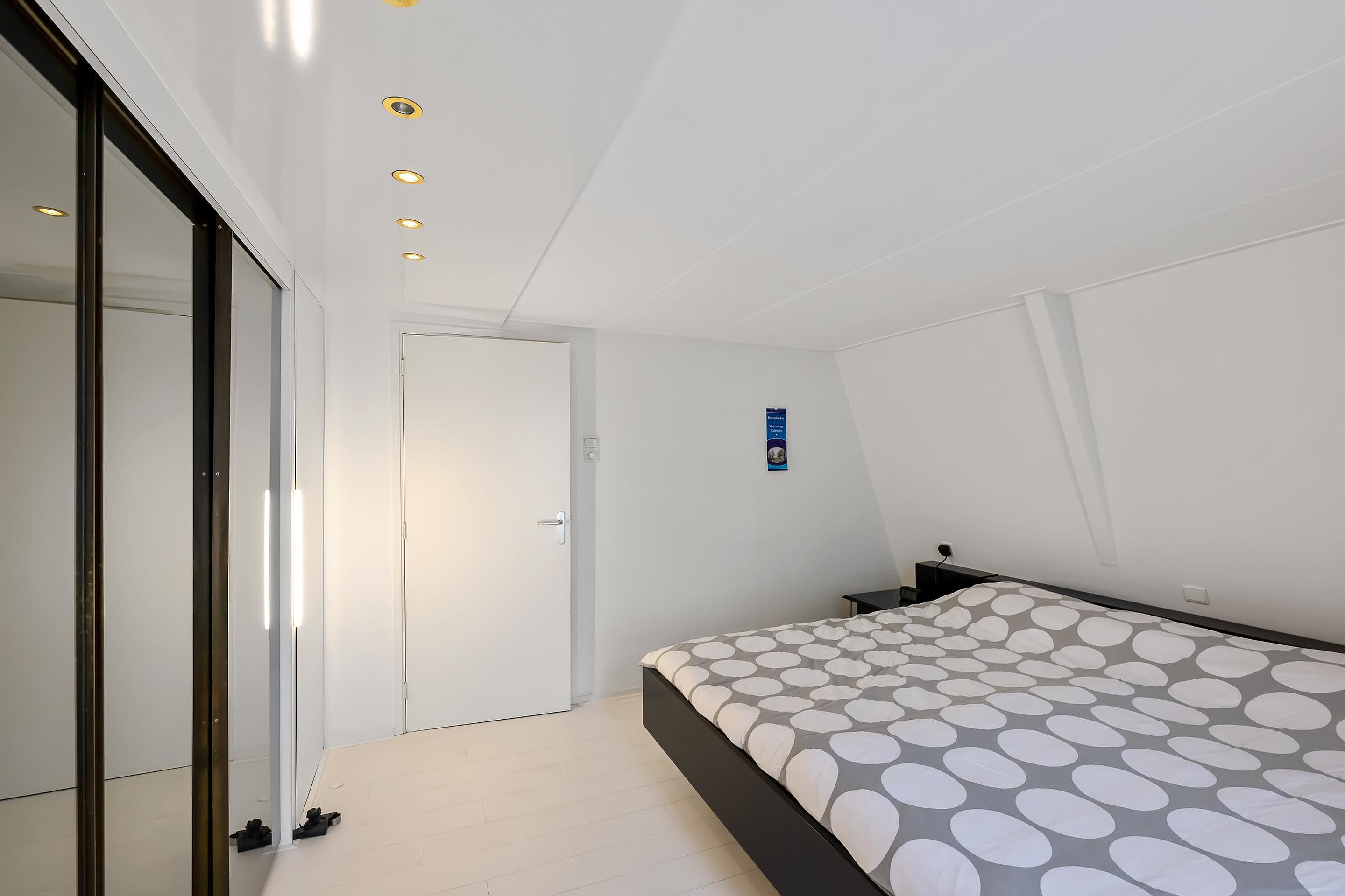 Op de begane grond is een extra slaapkamer en een tweede badkamer gerealiseerd. In de slaapkamer komt een fijne hoeveelheid licht binnen door de raampartijen. De slaapkamer is net als de gehele woning keurig afgewerkt, strak gestuukt en voorzien van inbouwspots. Er zijn openslaande deuren naar de besloten patio tuin. In de kamer vinden we nog een praktische inbouwkast. De moderne badkamer is voorzien van inloopdouche, toilet en dubbele wastafel. De spullen die je niet zo vaak gebruikt kun je stallen op de vliering, bereikbaar met een vlizotrap.