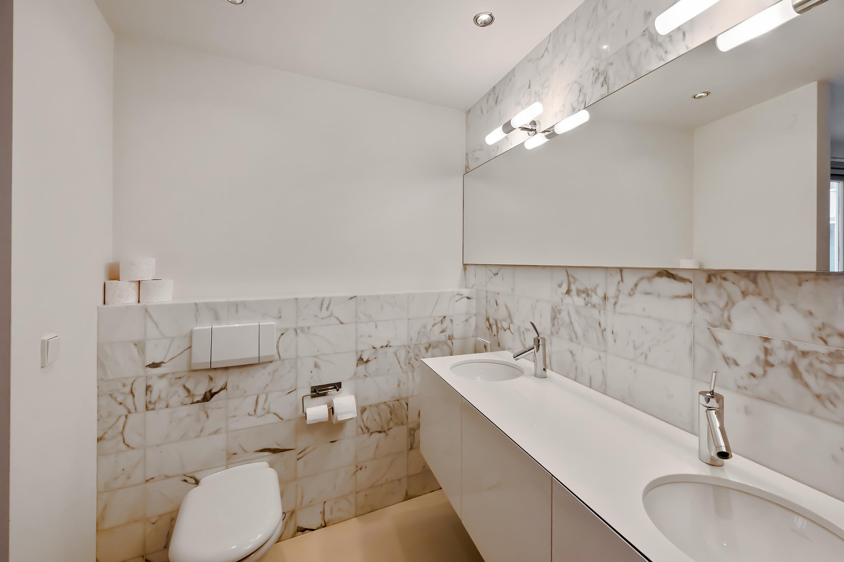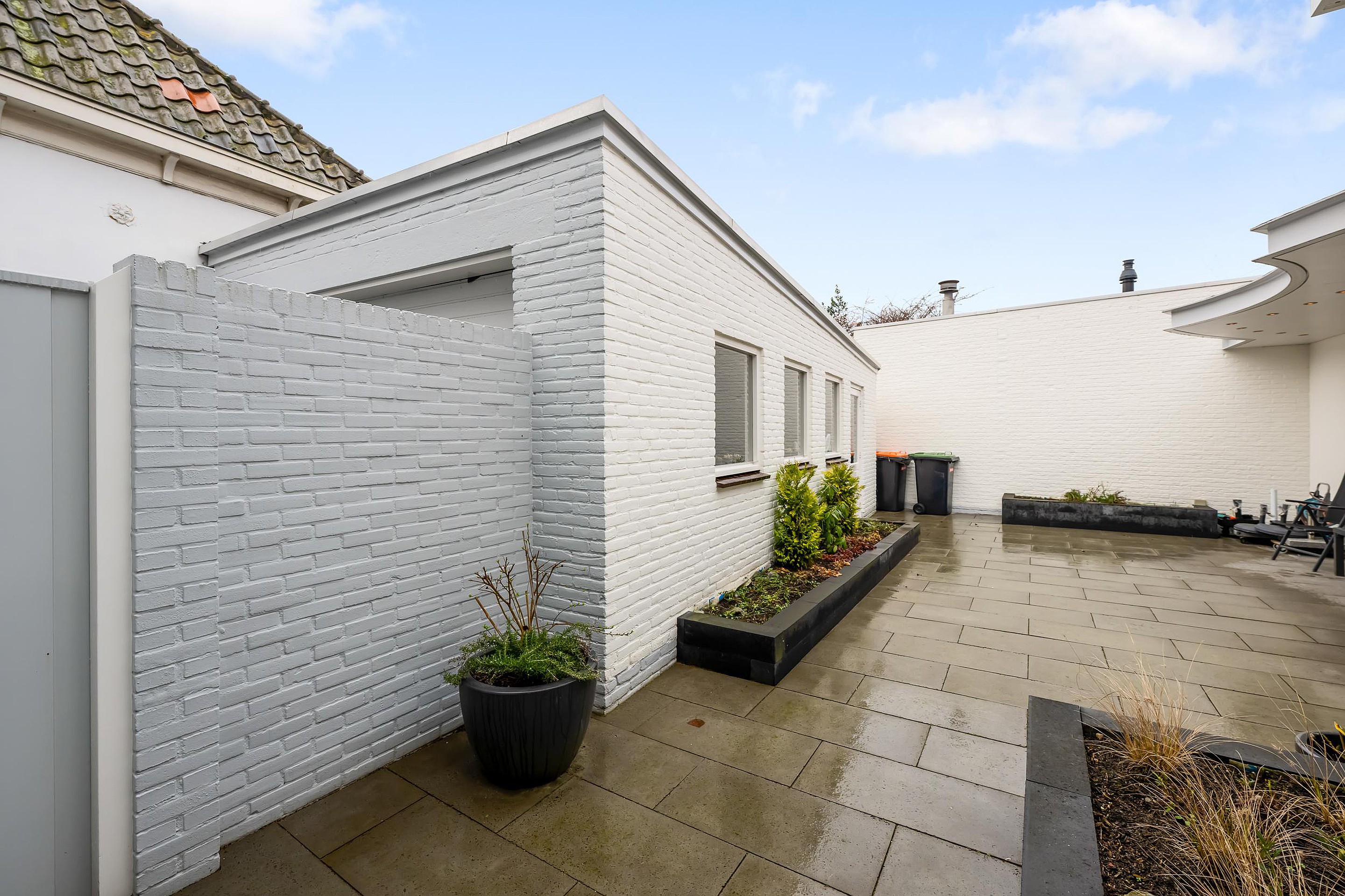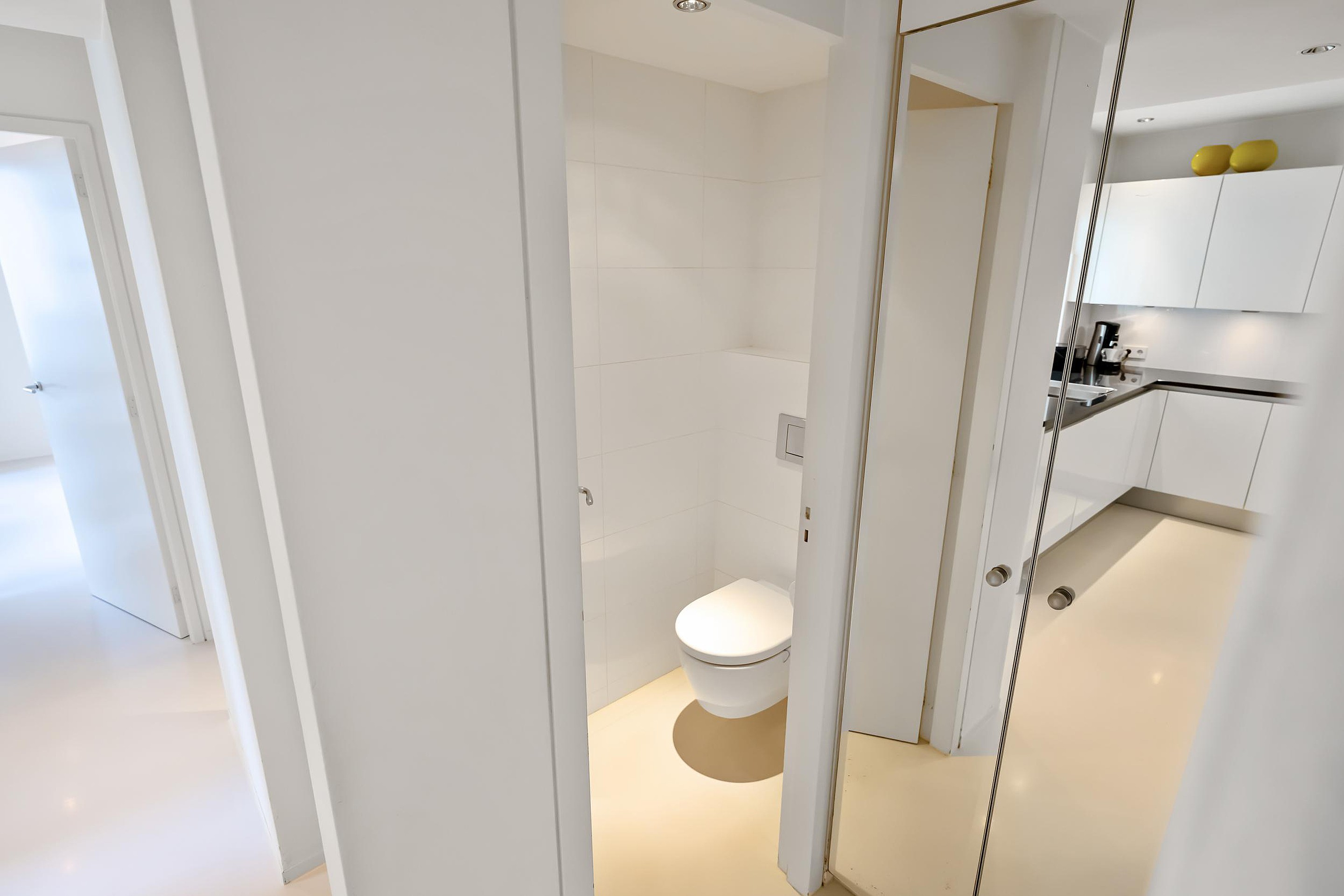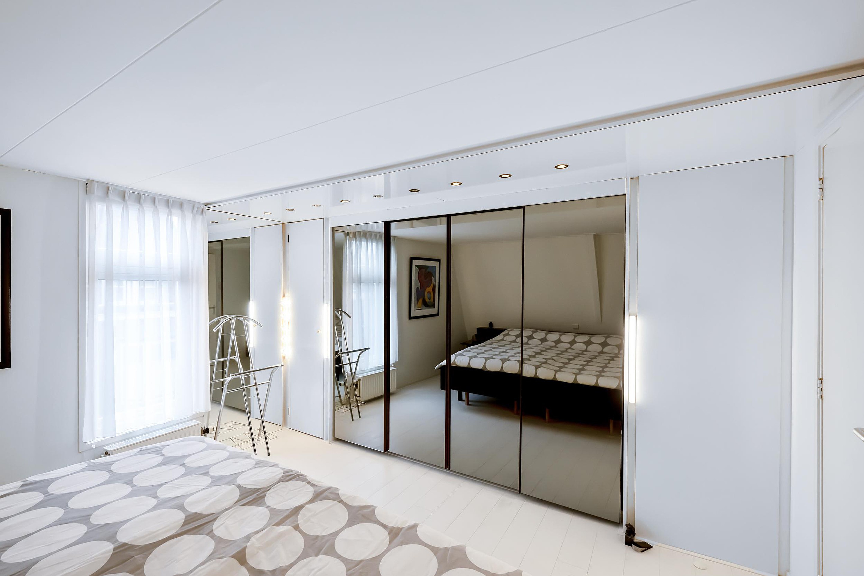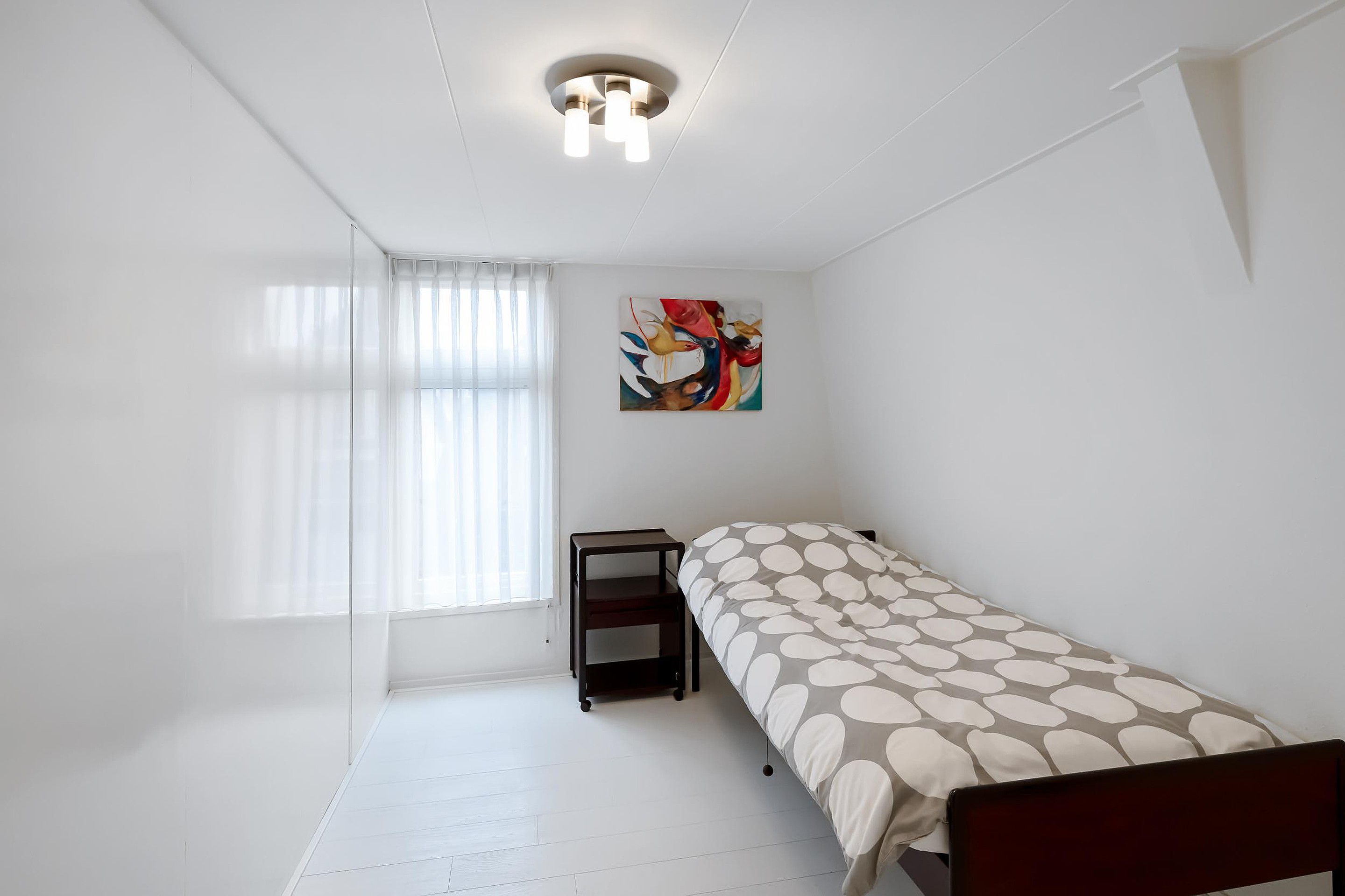Op de begane grond is een extra slaapkamer en een tweede badkamer gerealiseerd. In de slaapkamer komt een fijne hoeveelheid licht binnen door de raampartijen. De slaapkamer is net als de gehele woning keurig afgewerkt, strak gestuukt en voorzien van inbouwspots. Er zijn openslaande deuren naar de besloten patio tuin. In de kamer vinden we nog een praktische inbouwkast. De moderne badkamer is voorzien van inloopdouche, toilet en dubbele wastafel. De spullen die je niet zo vaak gebruikt kun je stallen op de vliering, bereikbaar met een vlizotrap.