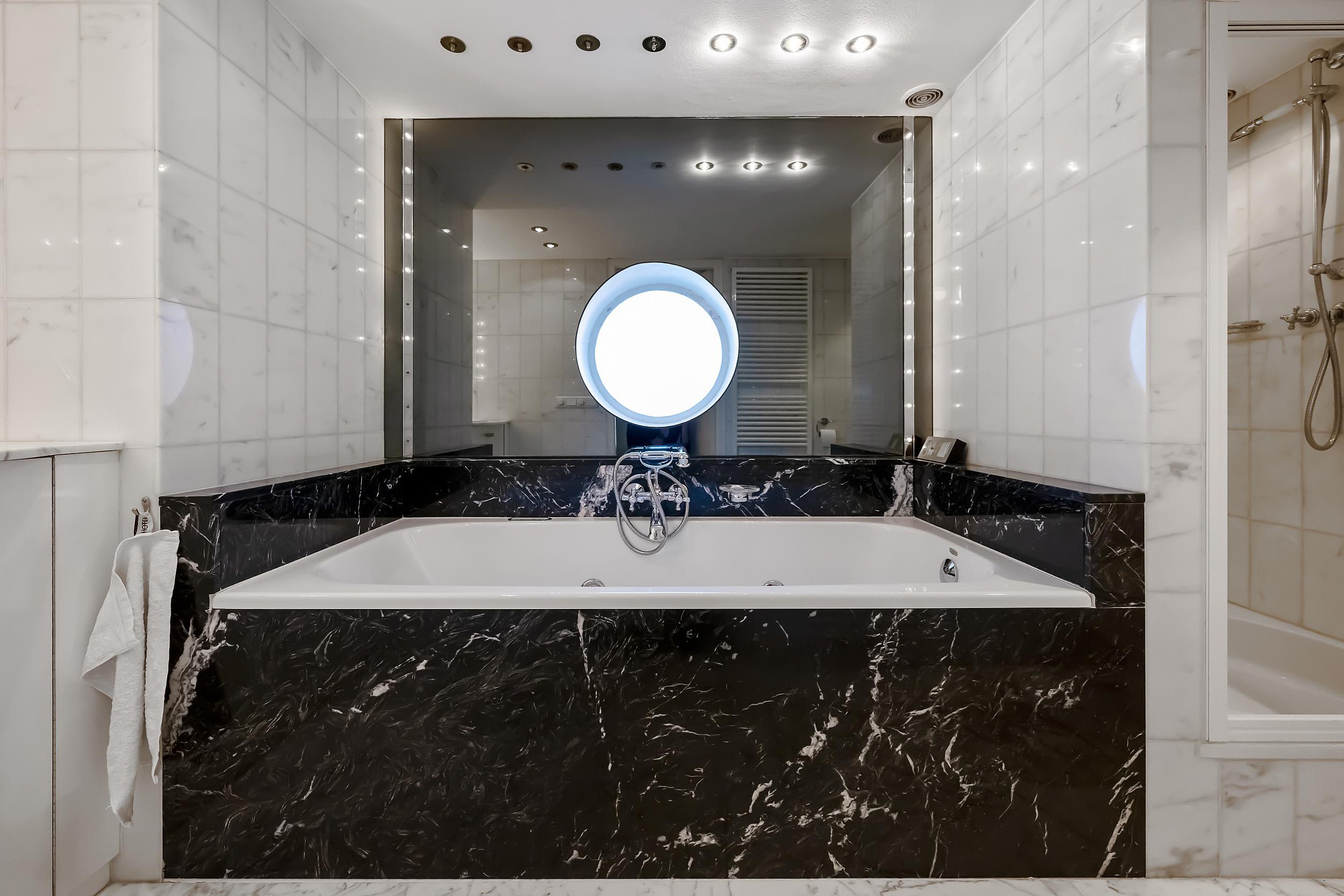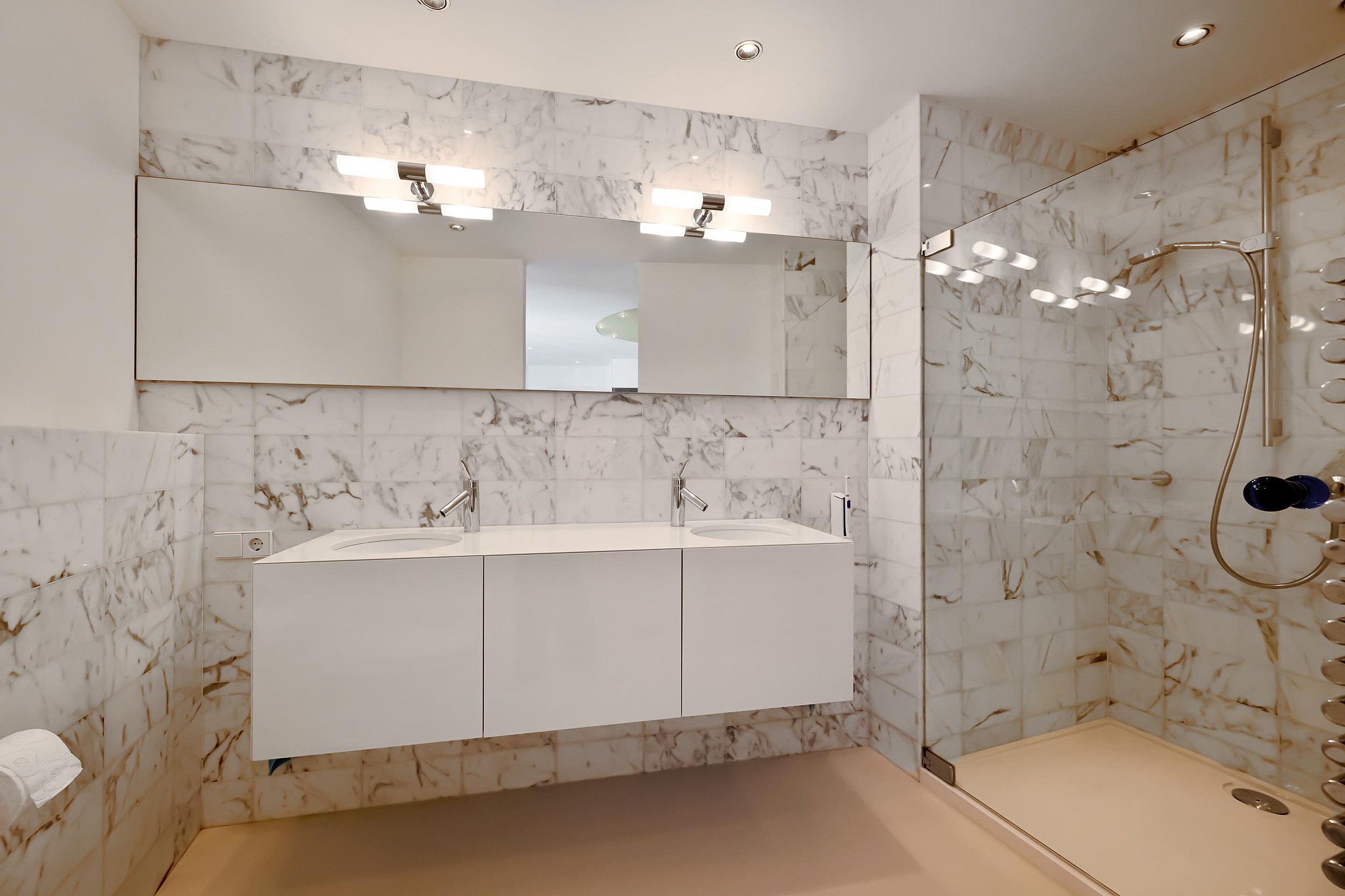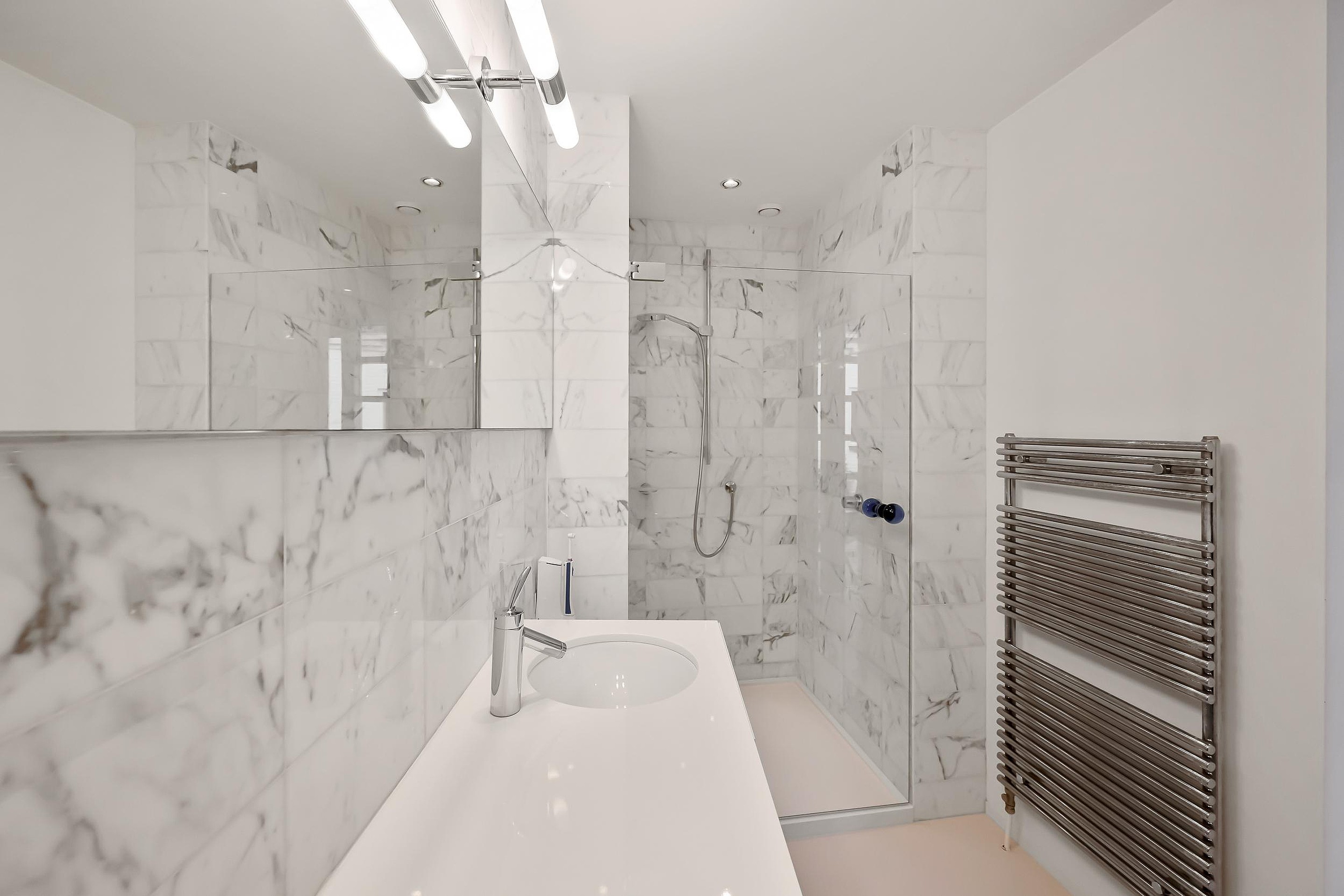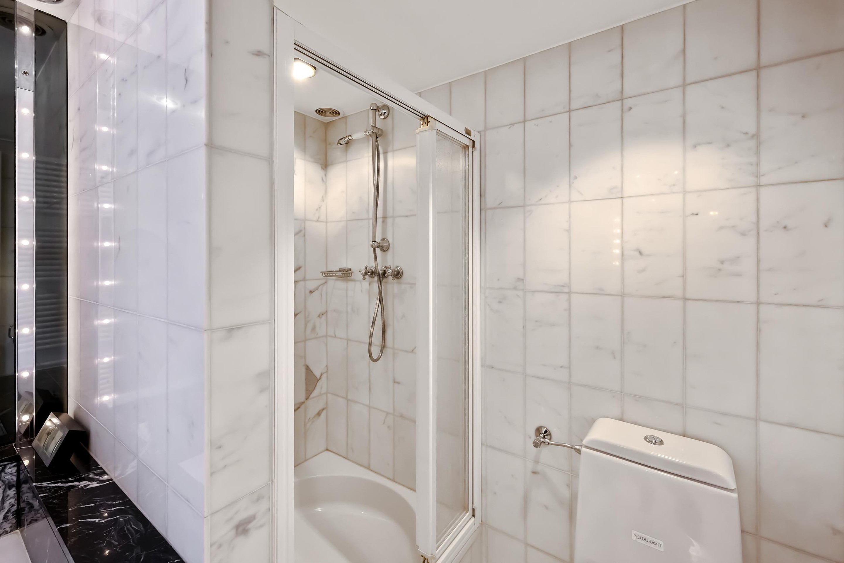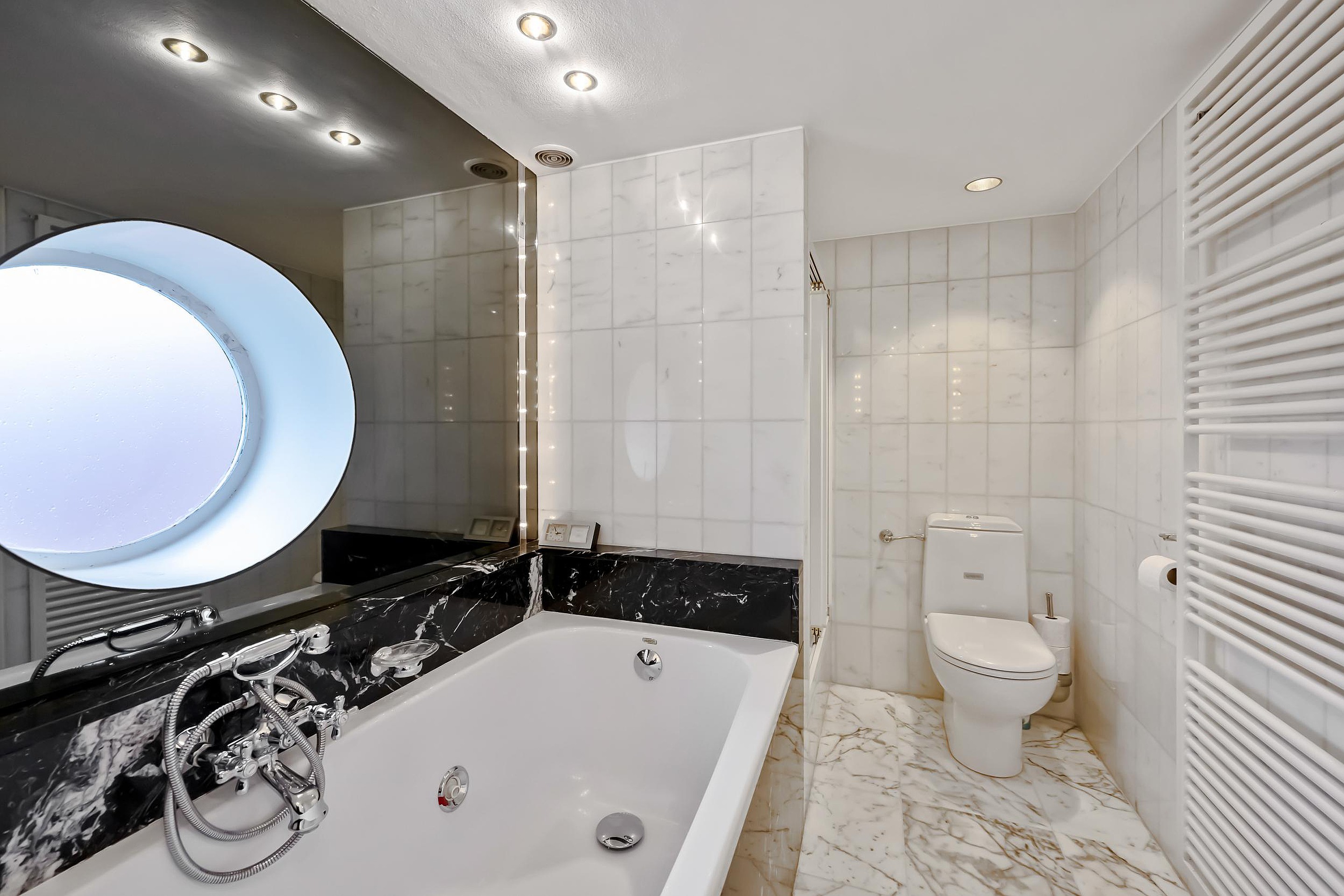 Op de begane grond is een extra slaapkamer en een tweede badkamer gerealiseerd. In de slaapkamer komt een fijne hoeveelheid licht binnen door de raampartijen. De slaapkamer is net als de gehele woning keurig afgewerkt, strak gestuukt en voorzien van inbouwspots. Er zijn openslaande deuren naar de besloten patio tuin. In de kamer vinden we nog een praktische inbouwkast. De moderne badkamer is voorzien van inloopdouche, toilet en dubbele wastafel. De spullen die je niet zo vaak gebruikt kun je stallen op de vliering, bereikbaar met een vlizotrap.