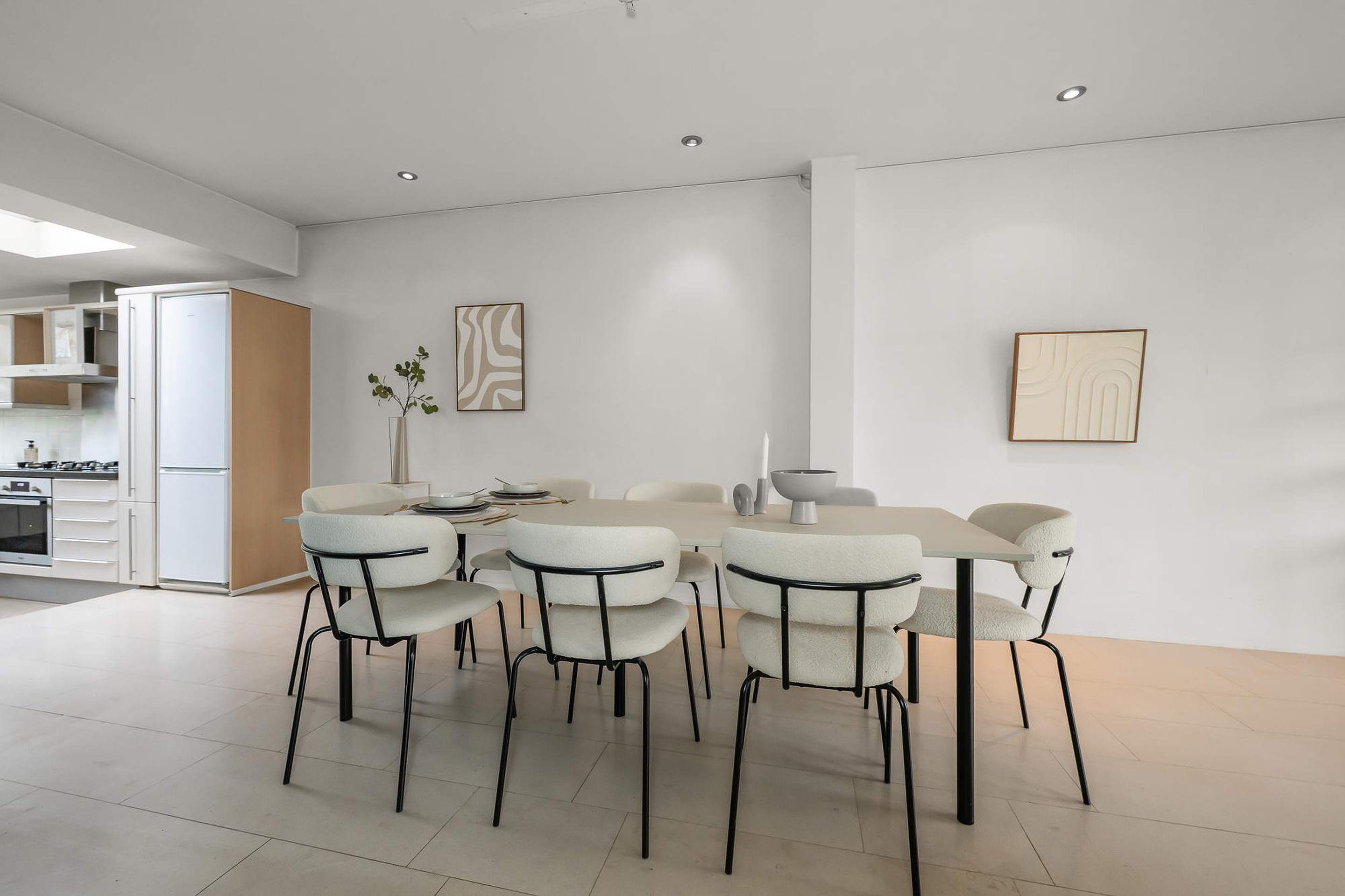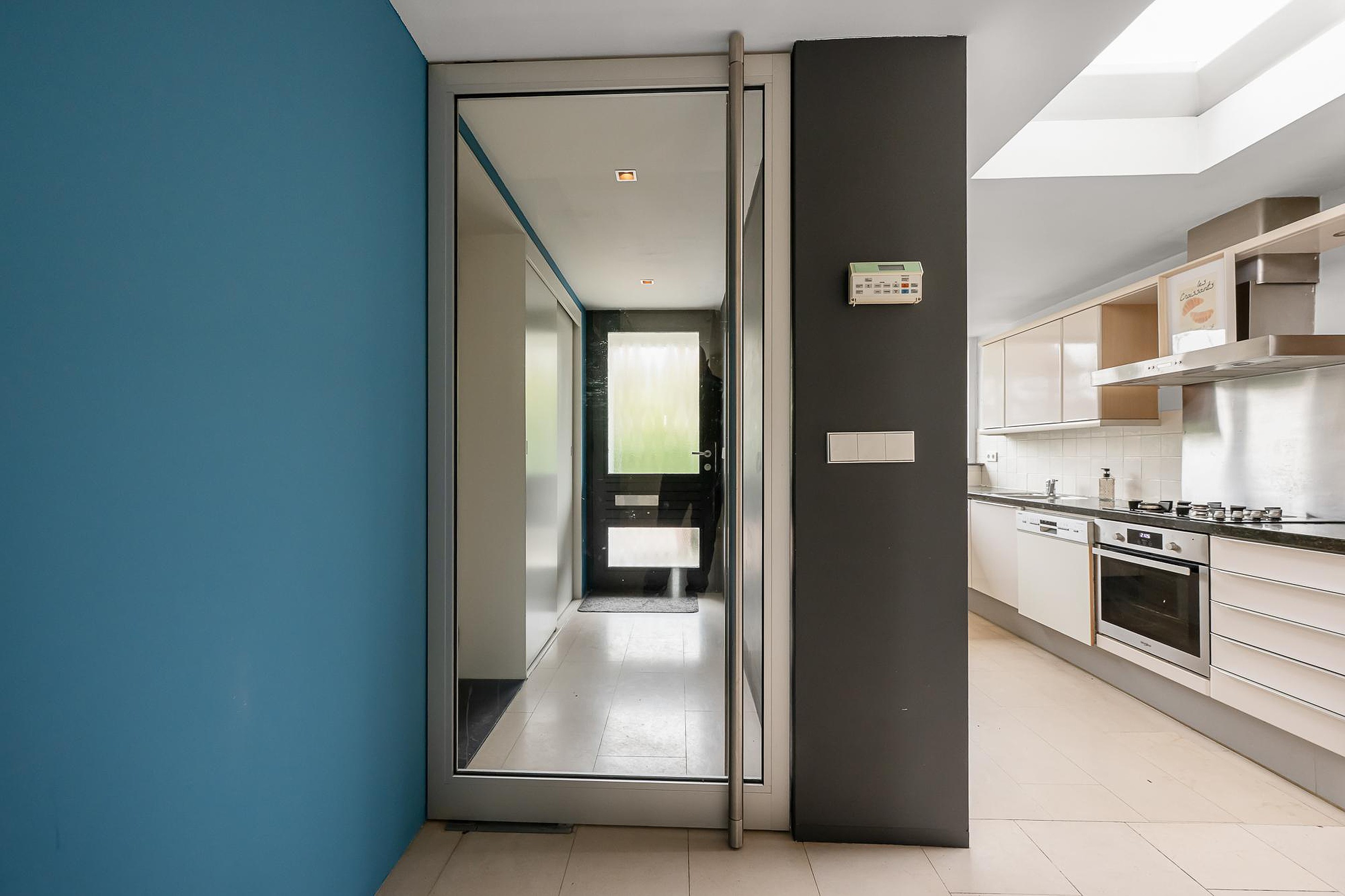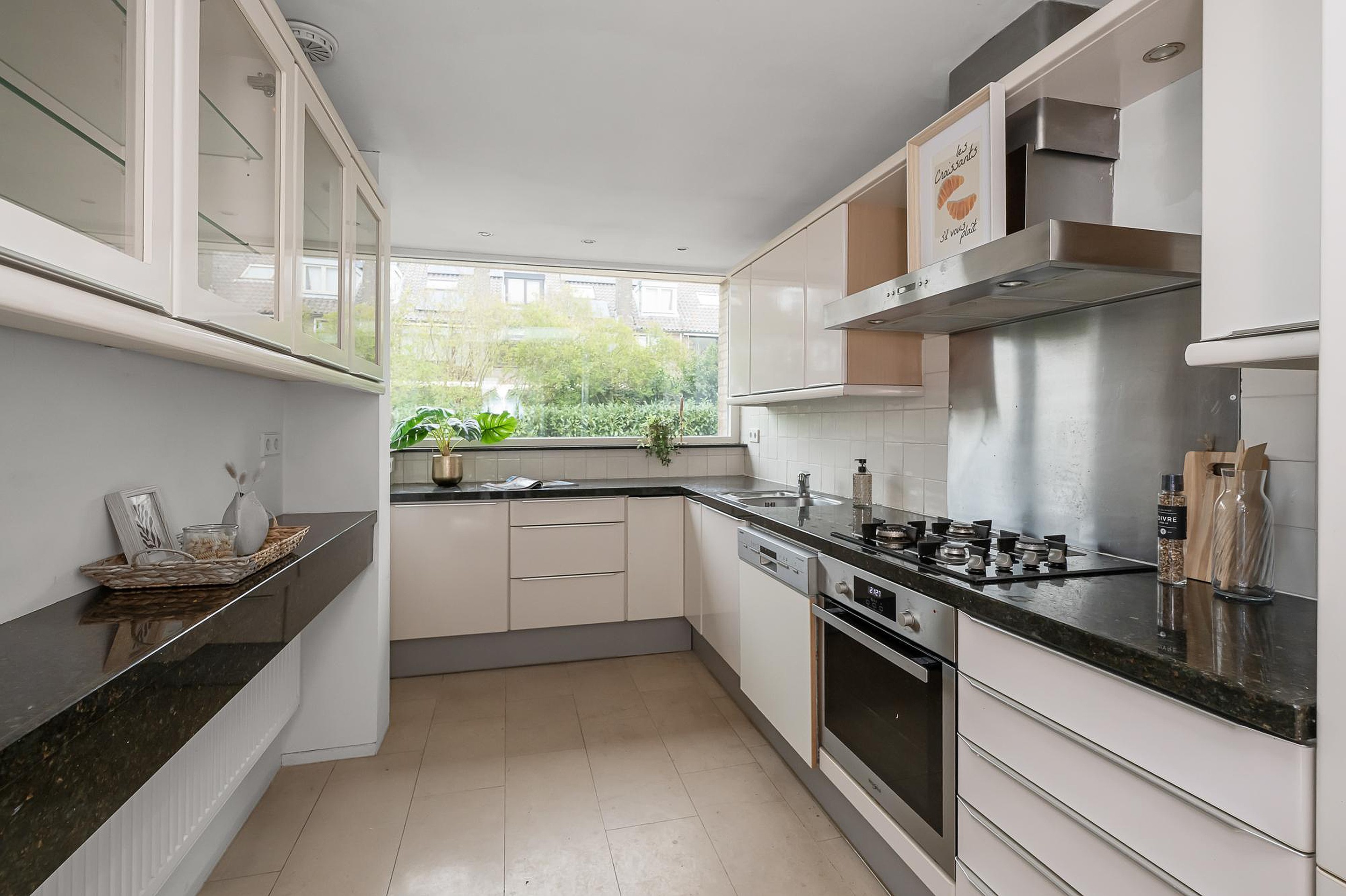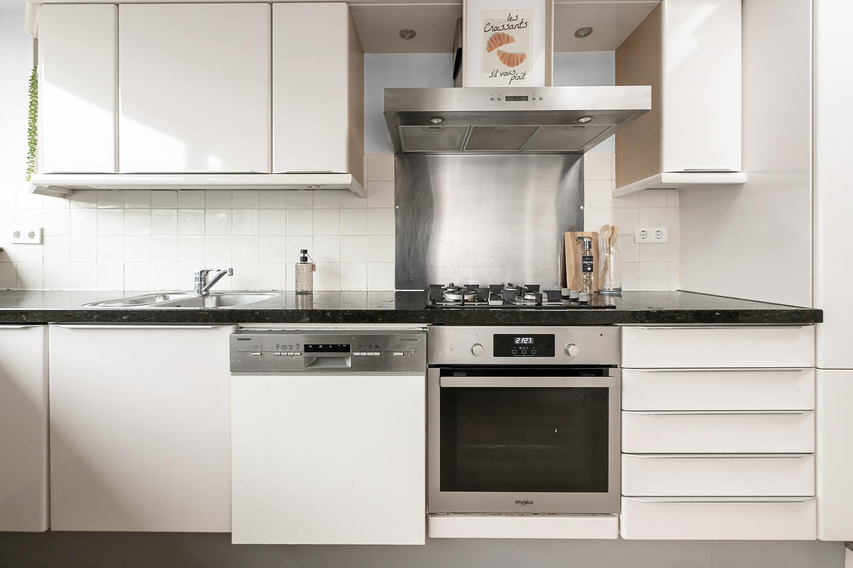 Aan de voorzijde van de woning bevindt zich de keuken in hoekopstelling, compleet met diverse inbouwapparatuur. Dankzij de lichtkoepel valt hier extra daglicht binnen, wat de ruimte een frisse en open uitstraling geeft. Vanuit de keuken heb je prettig zicht op het rustige hofje.