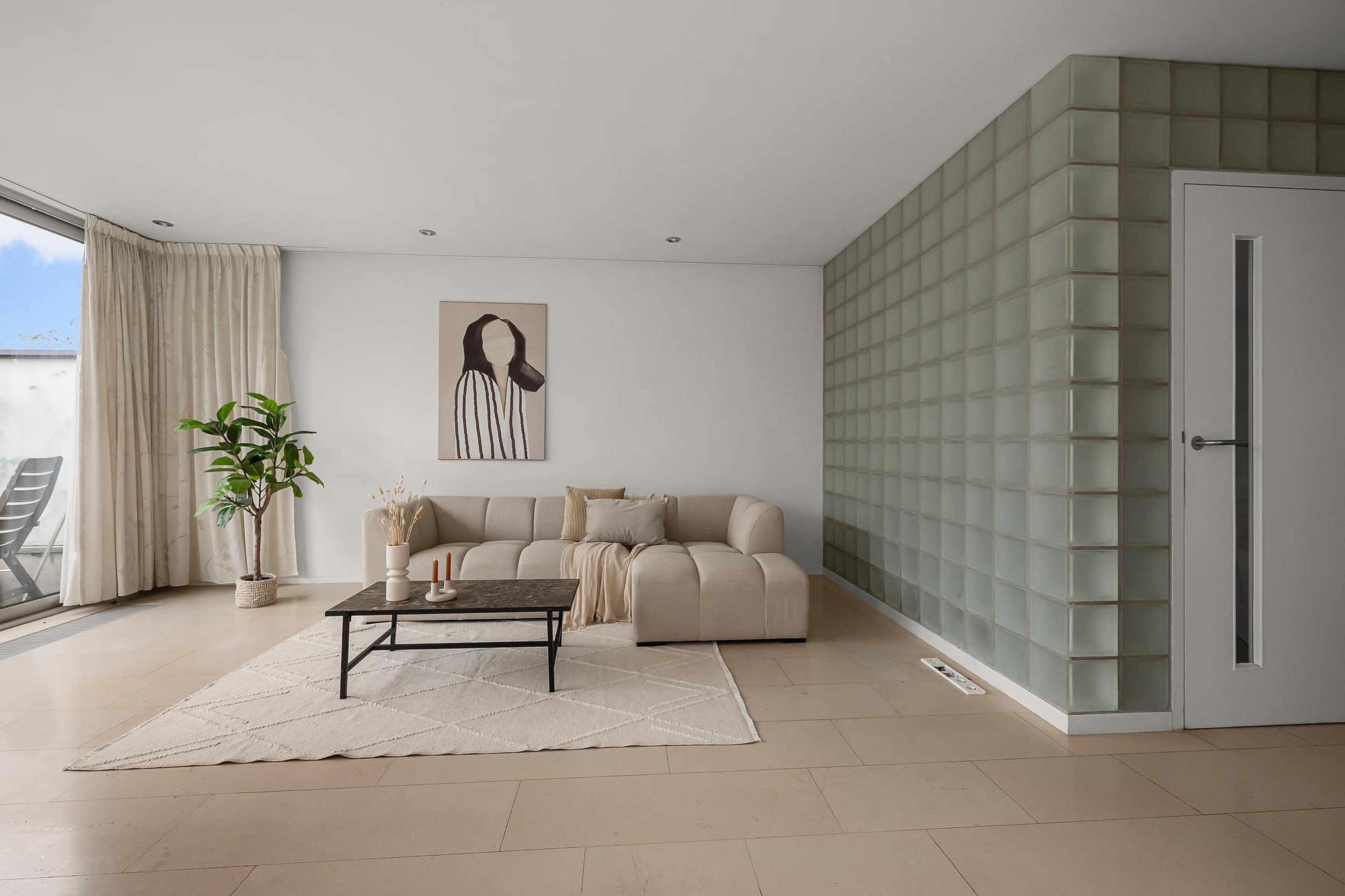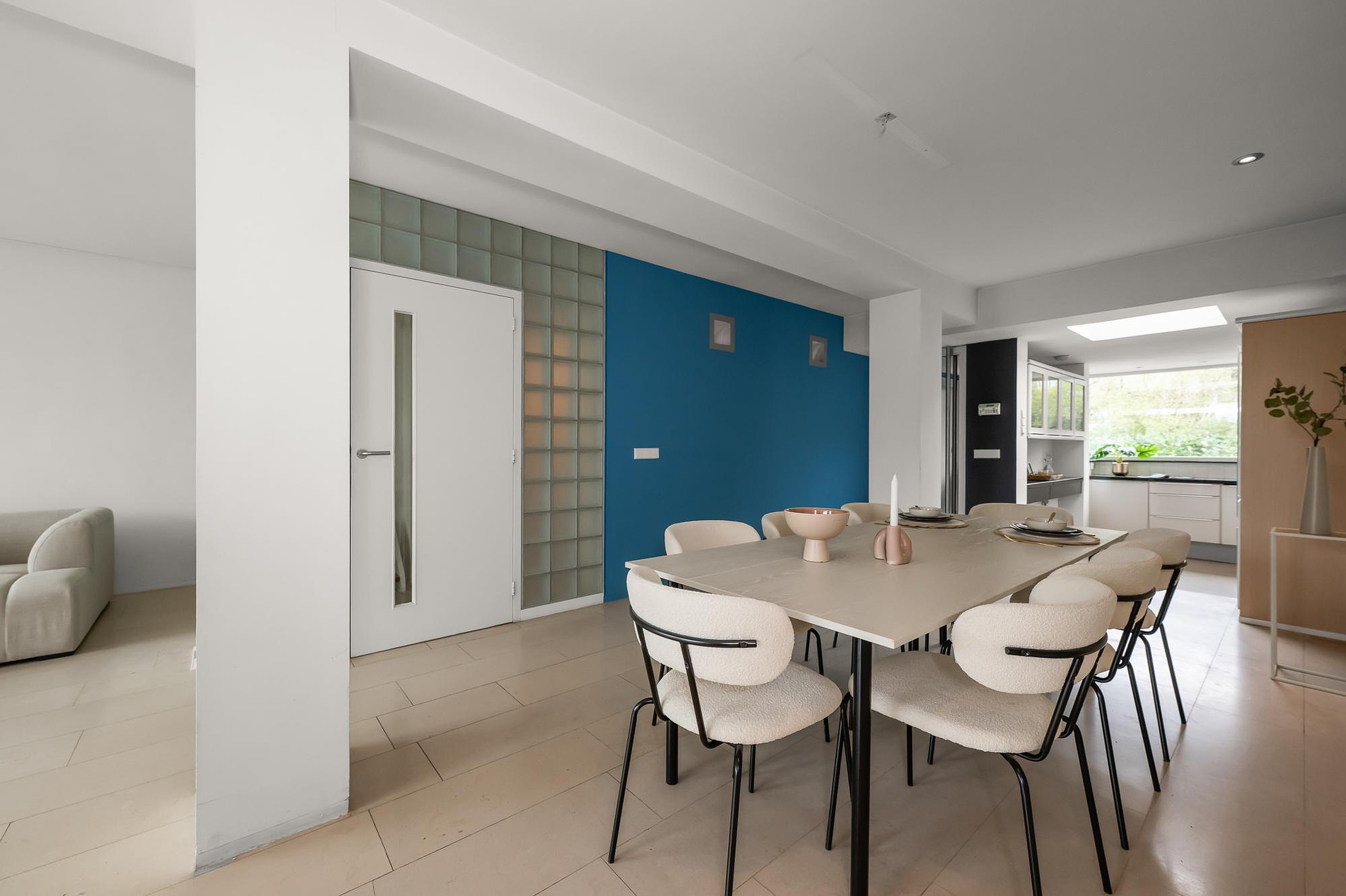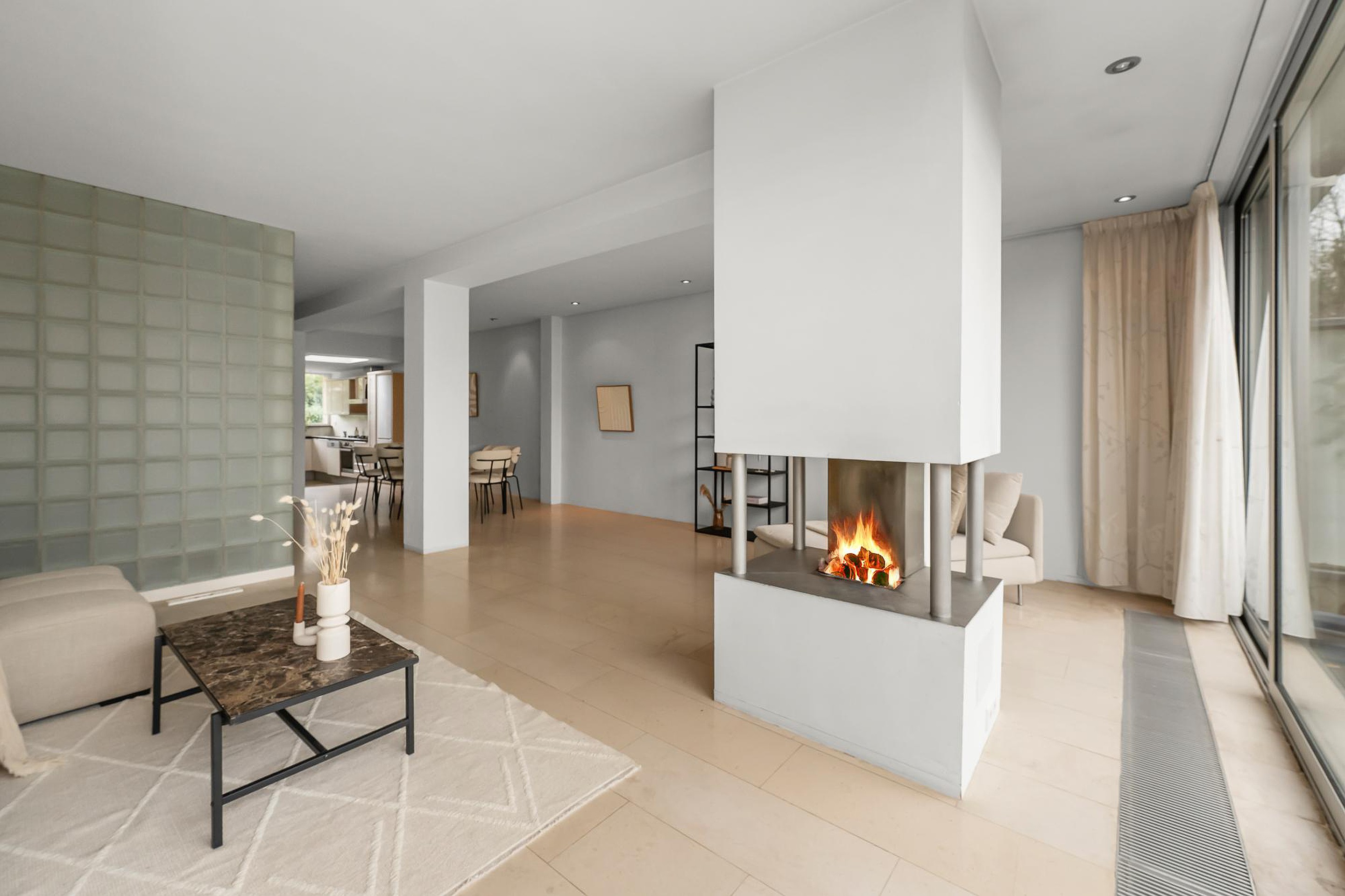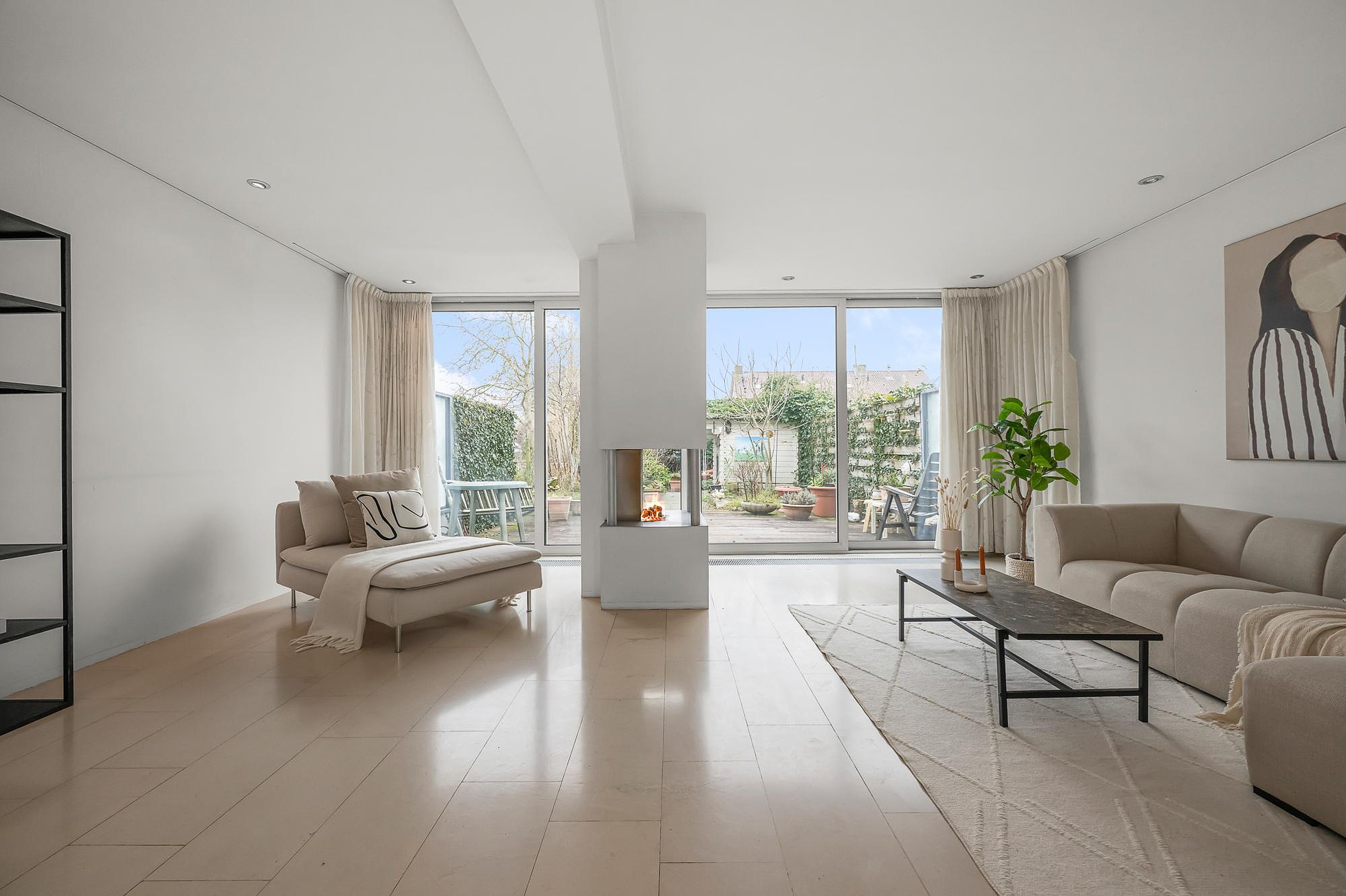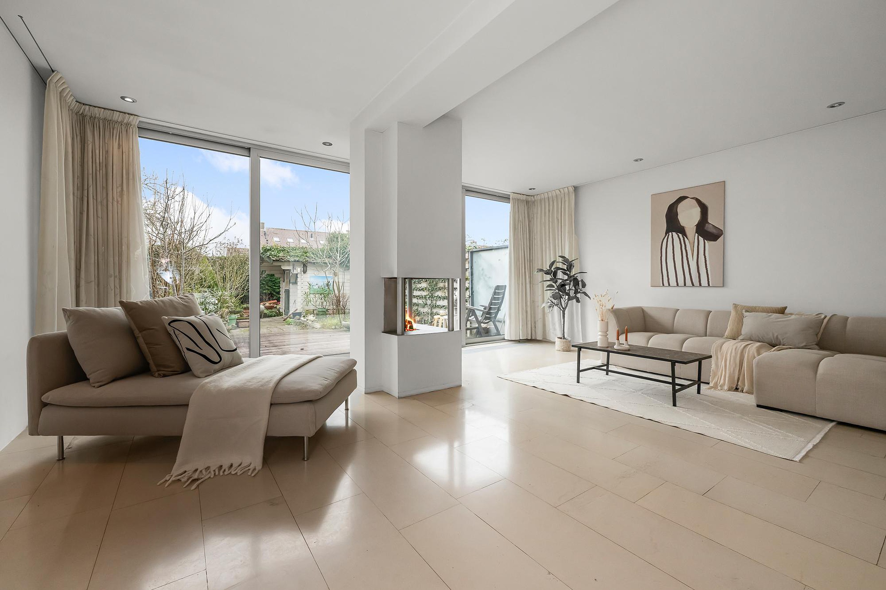 De woonkamer is tuingericht en strekt zich uit over de volledige breedte van de woning. Deze ruimte is voorzien van vloerverwarming en een sfeervolle gashaard. Via de schuifpui is er directe toegang tot de achtertuin, wat zorgt voor veel lichtinval en een goede verbinding tussen binnen en buiten.