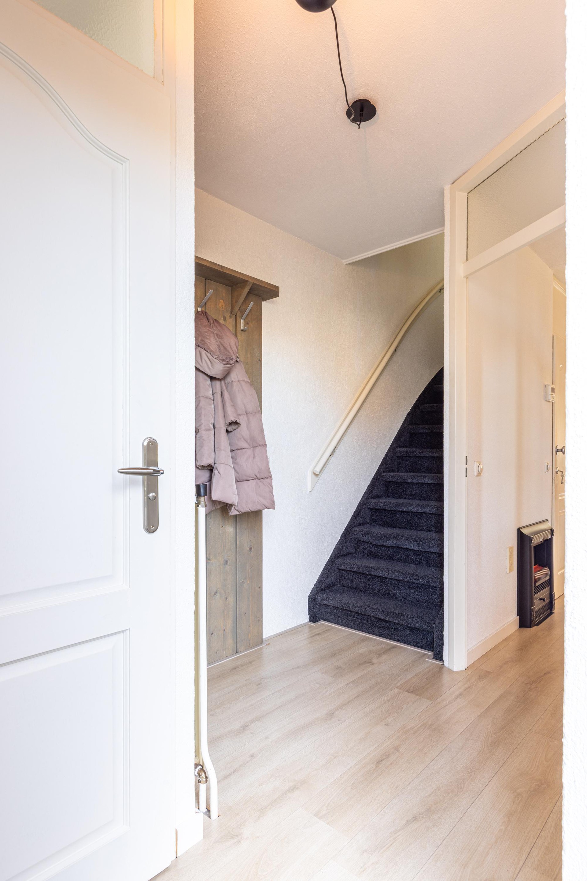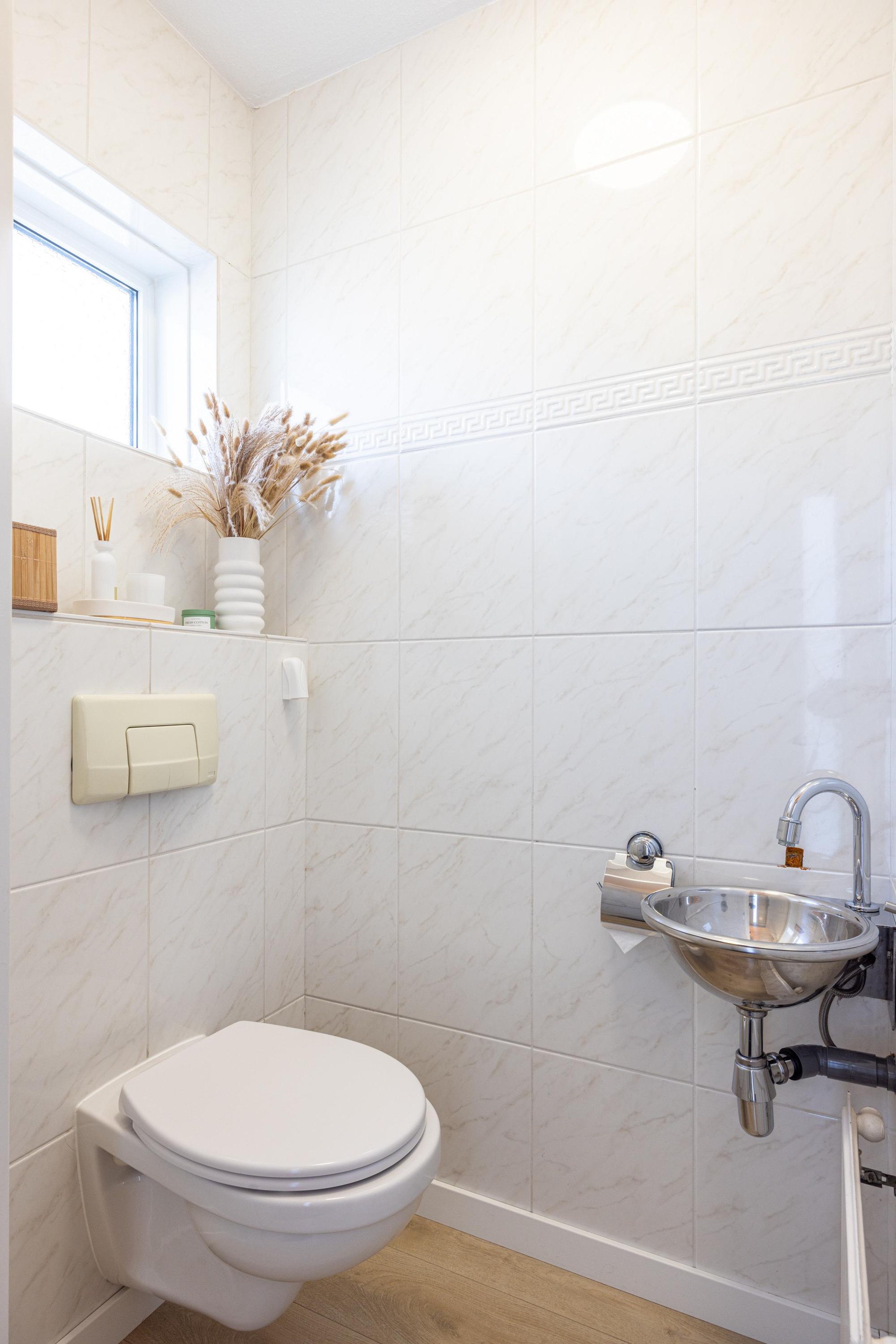 Begane grond Bij aankomst valt direct op hoe verzorgd de woning oogt. De voortuin is netjes en onderhoudsarm aangelegd, waardoor de entree uitnodigend en strak oogt. Via de voordeur stap je binnen in de ontvangsthal, waar een nette laminaatvloer, een praktische garderobe en een modern zwevend toilet met fonteintje je welkom heten.