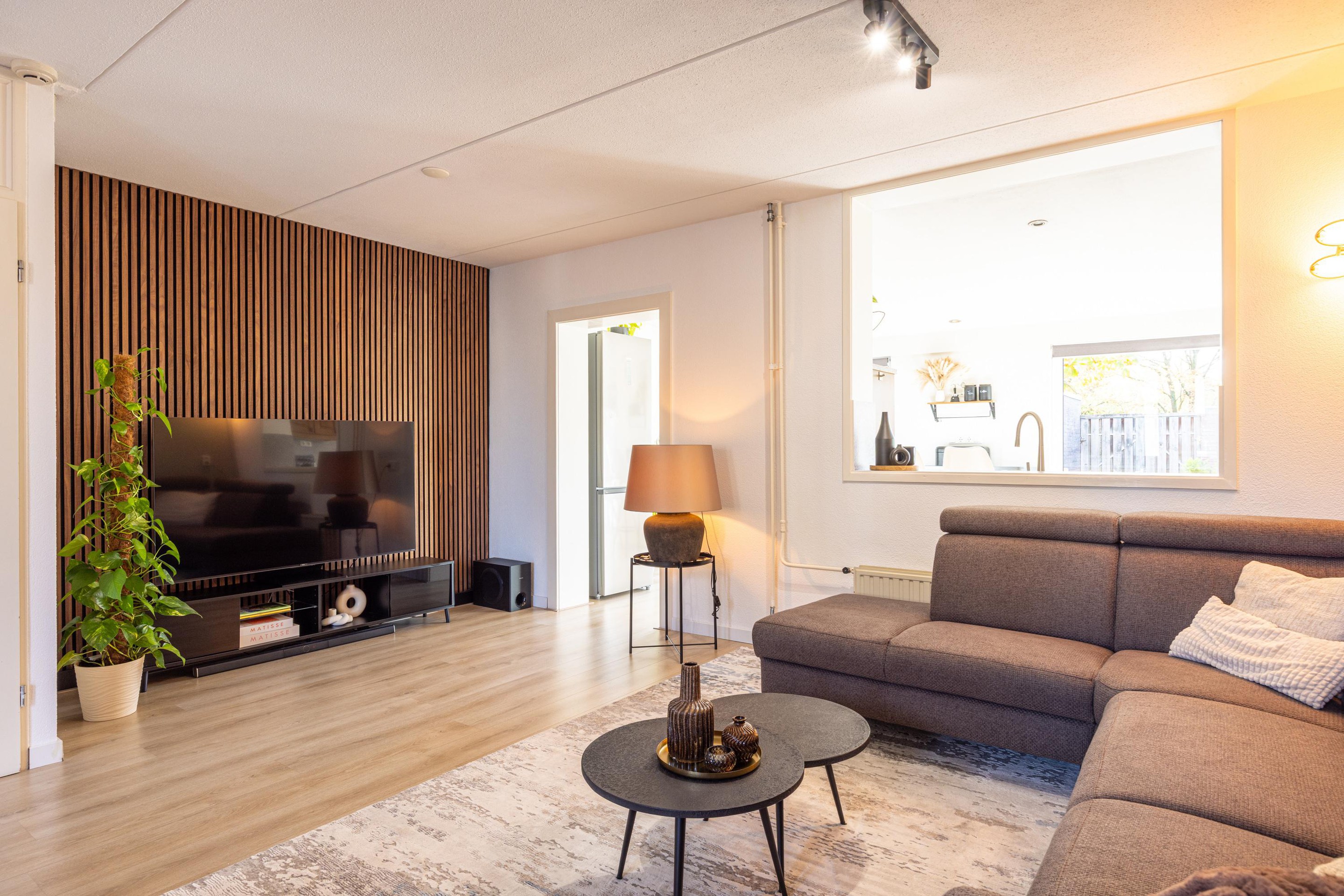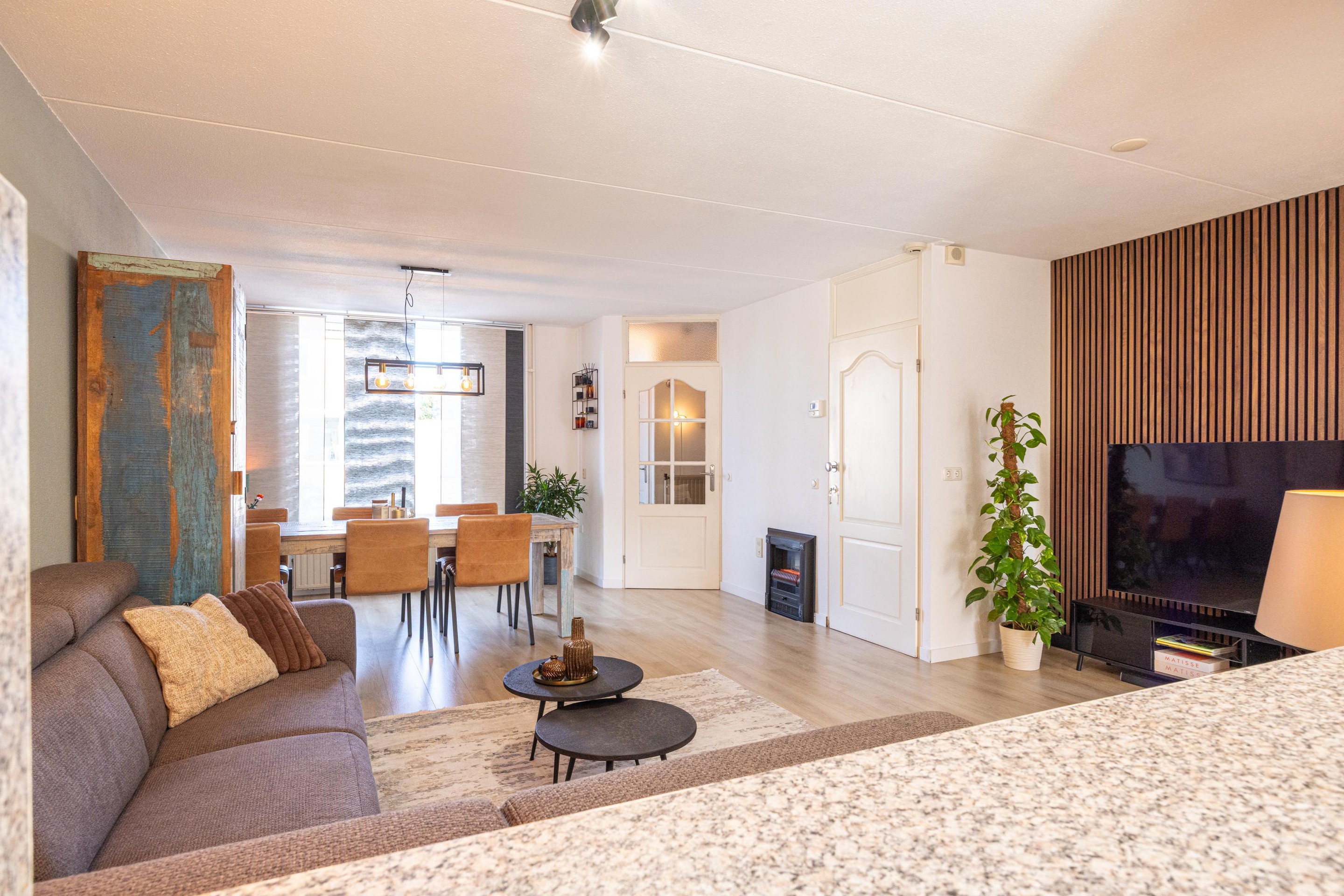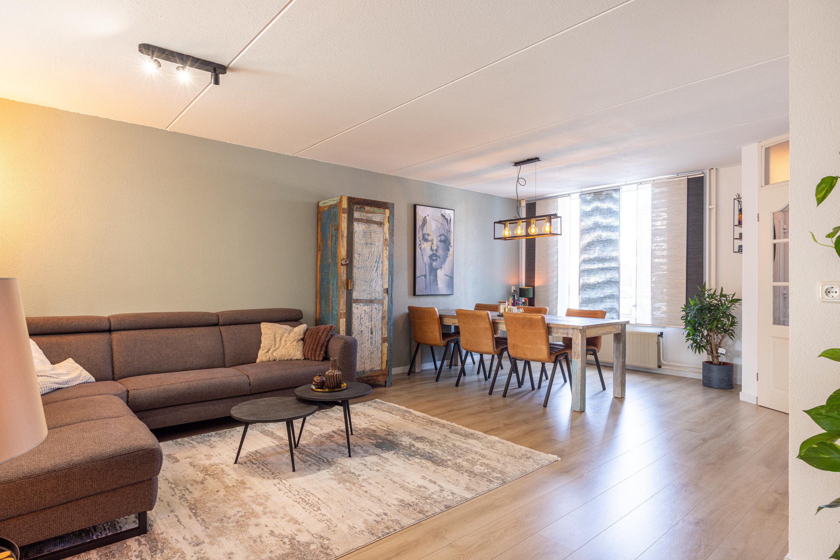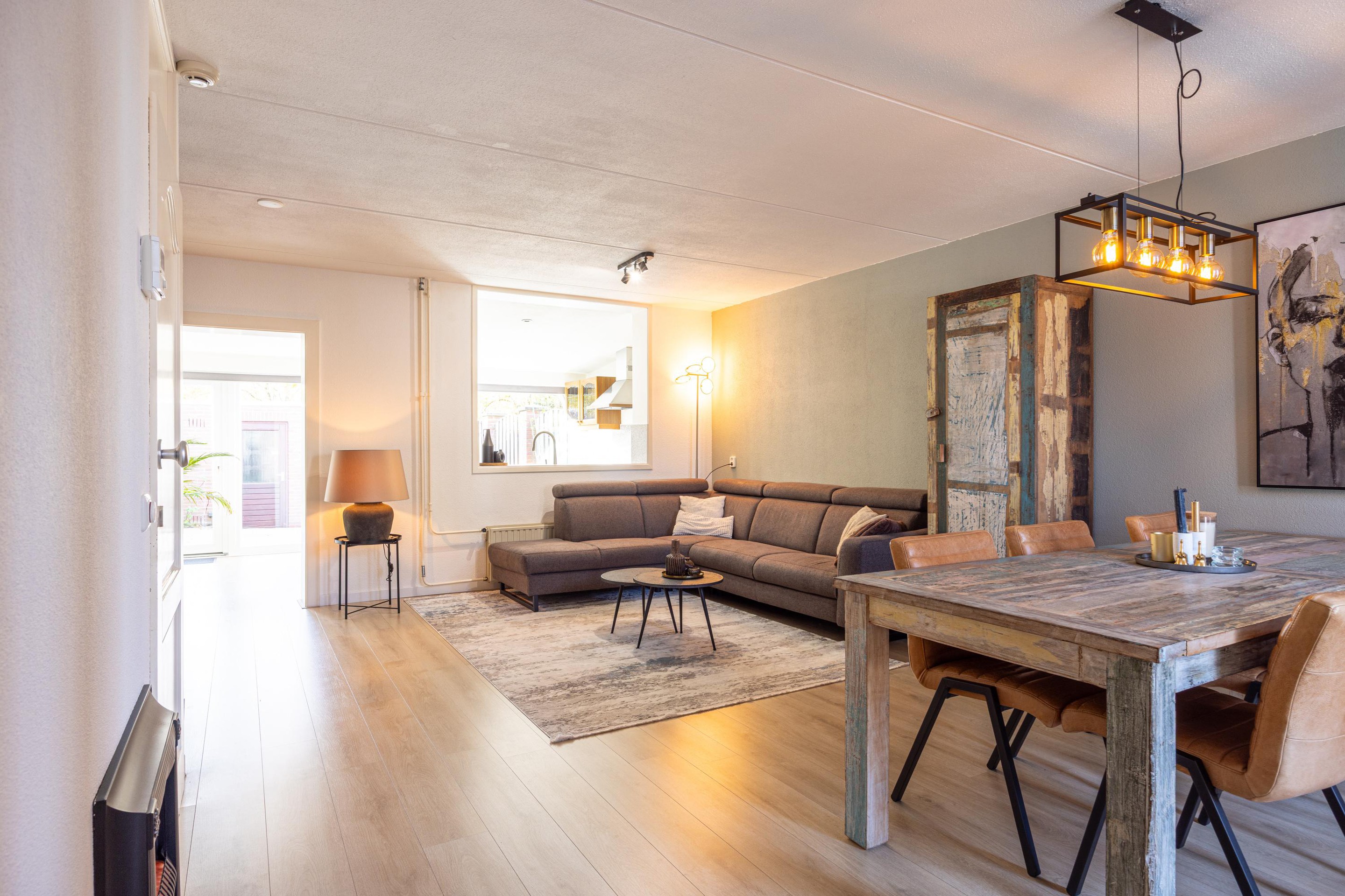 Vanuit de hal loop je door naar de woonkamer, een warme en sfeervolle leefruimte met een doorlopende laminaatvloer die de kamer nog ruimer maakt. Dankzij de kunststof kozijnen komt er volop daglicht binnen, wat zorgt voor een lichte en open sfeer. Er is voldoende plek voor zowel een comfortabele zithoek als een royale eethoek, ideaal voor gezellige avonden met familie of vrienden.