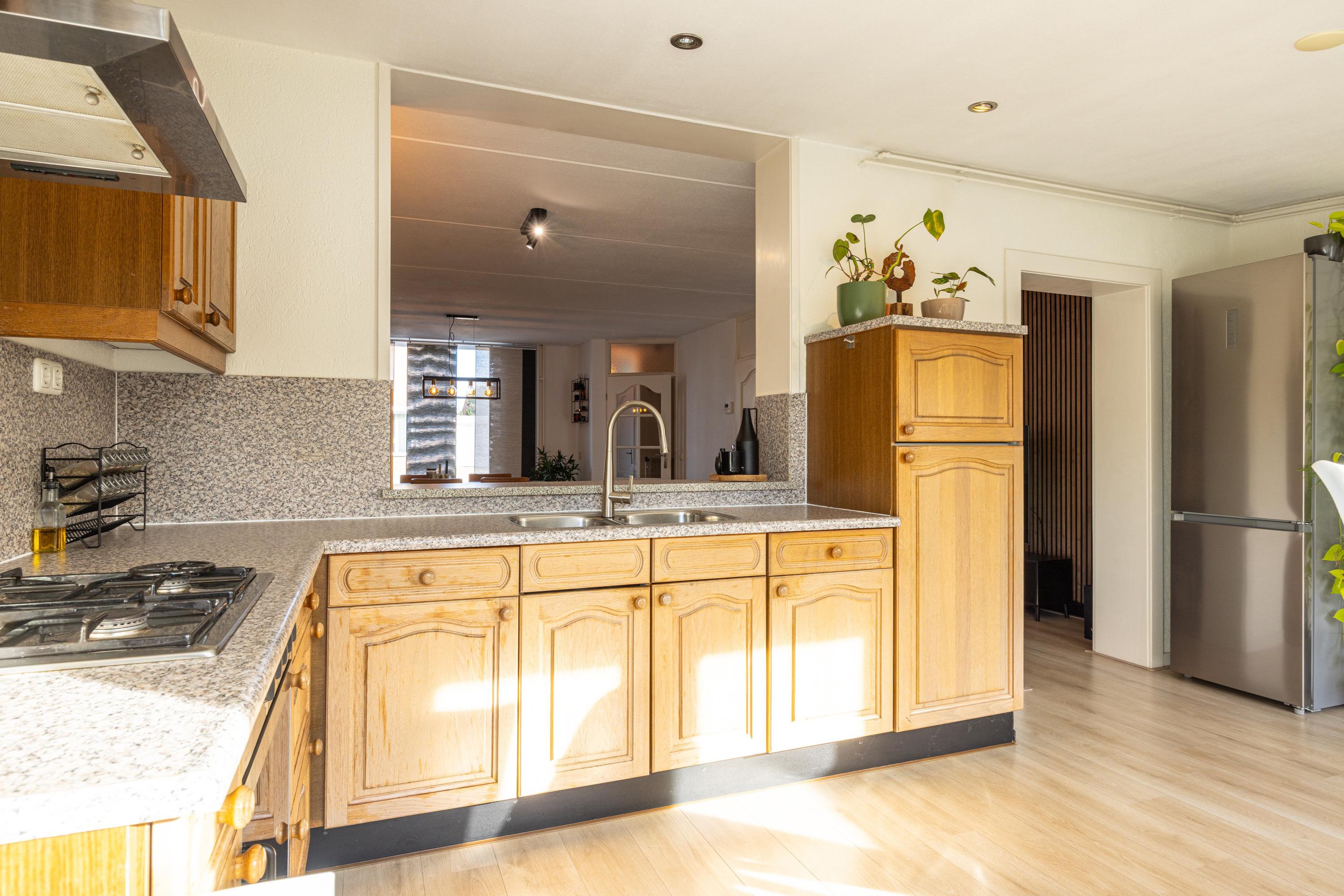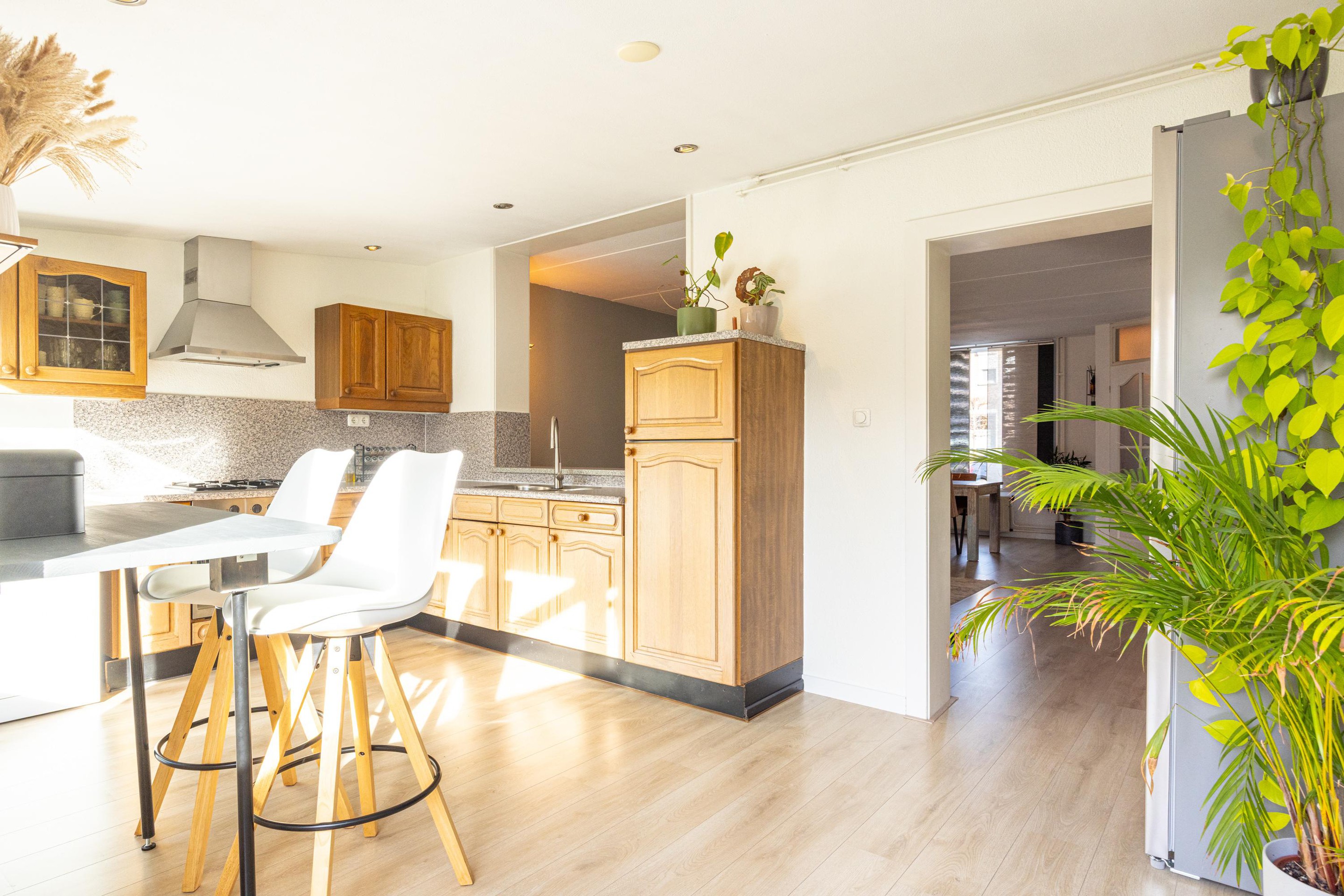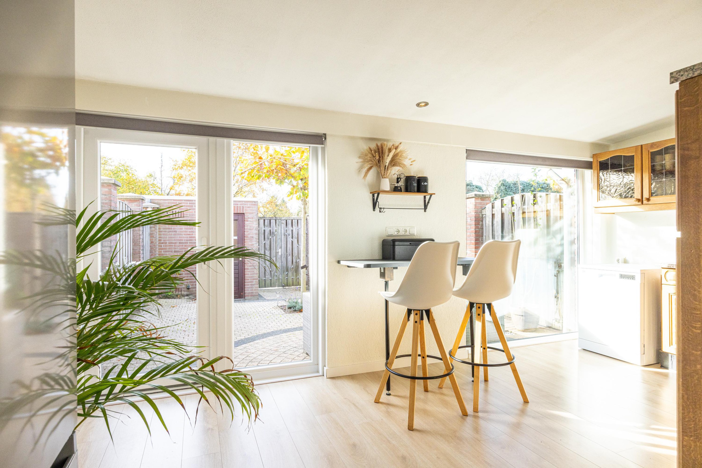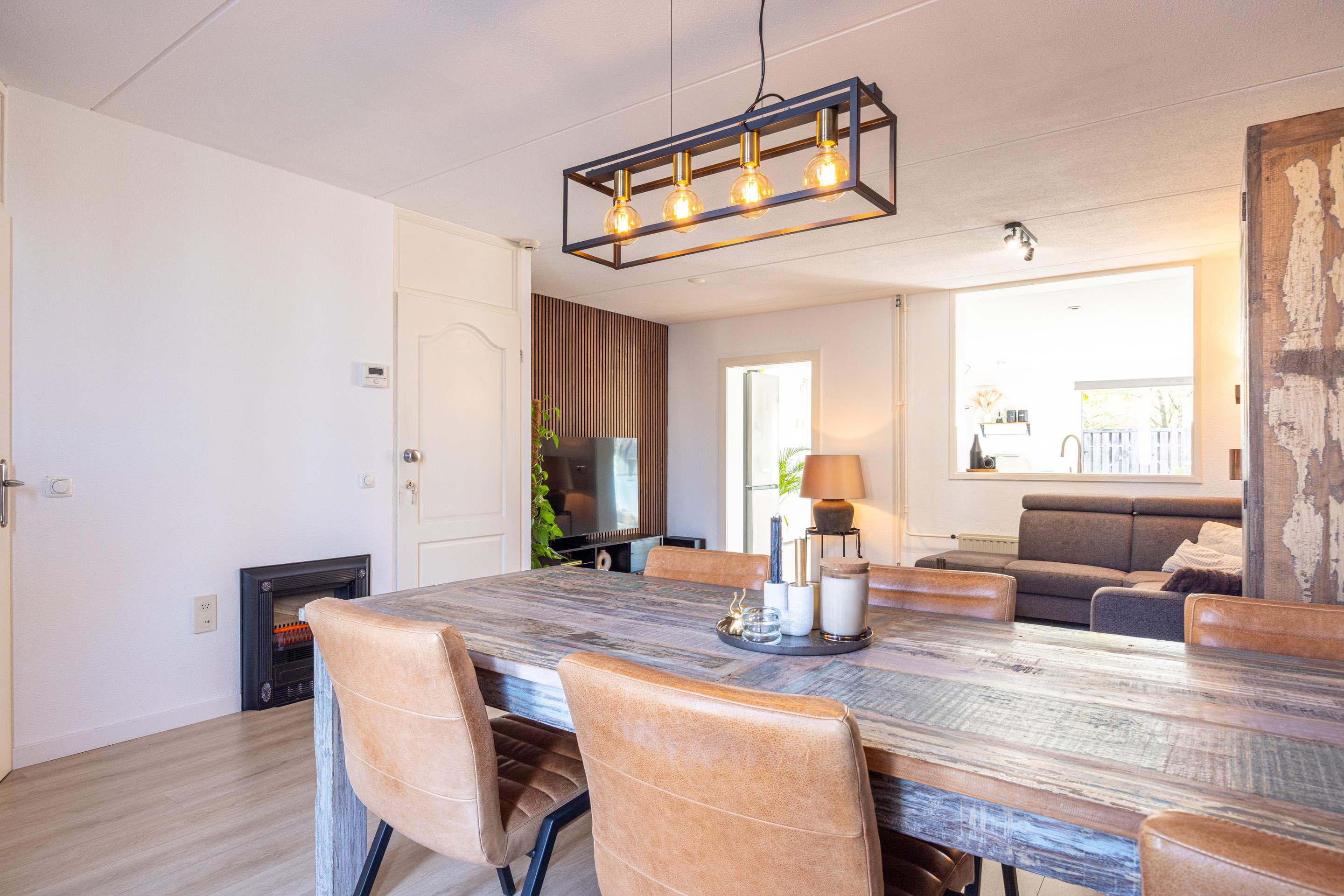 Vanuit de hal loop je door naar de woonkamer, een warme en sfeervolle leefruimte met een doorlopende laminaatvloer die de kamer nog ruimer maakt. Dankzij de kunststof kozijnen komt er volop daglicht binnen, wat zorgt voor een lichte en open sfeer. Er is voldoende plek voor zowel een comfortabele zithoek als een royale eethoek, ideaal voor gezellige avonden met familie of vrienden.