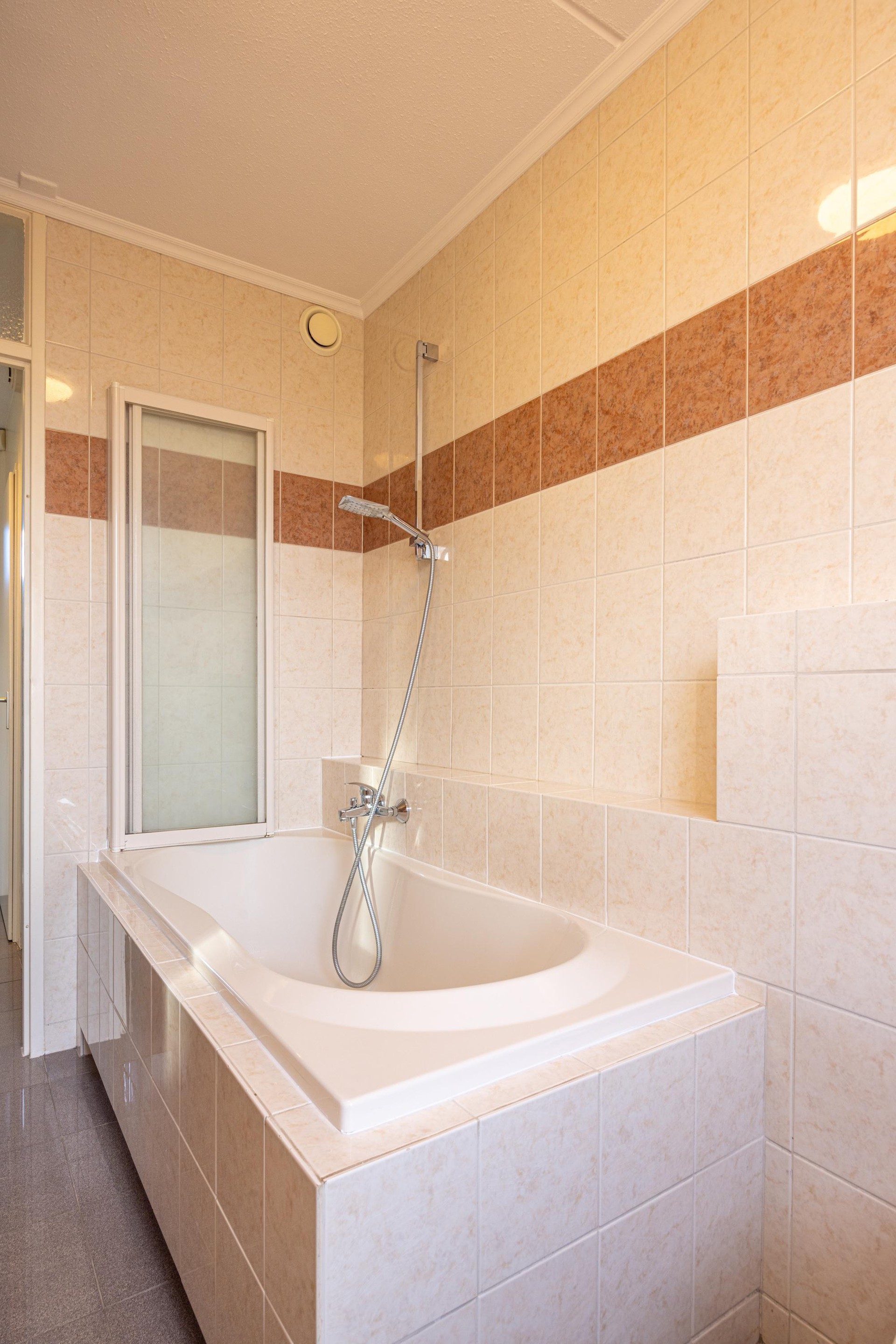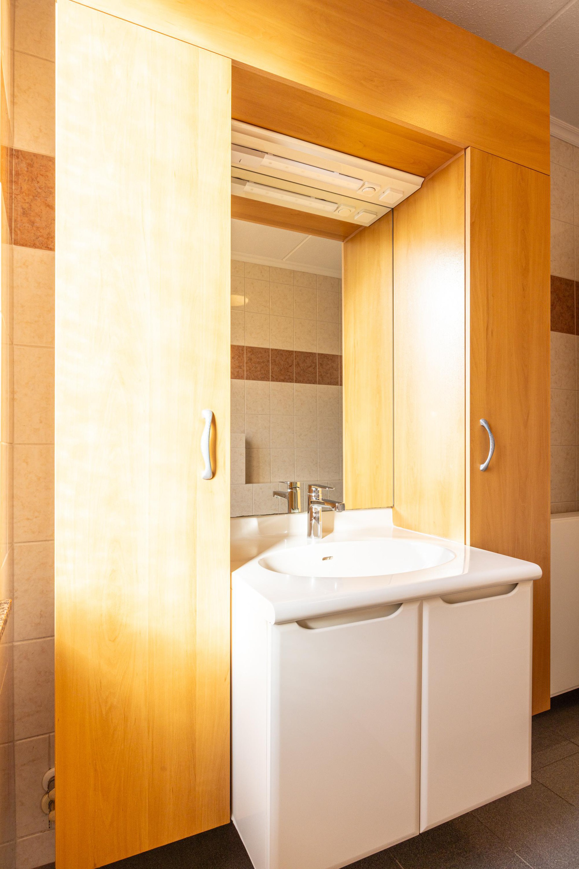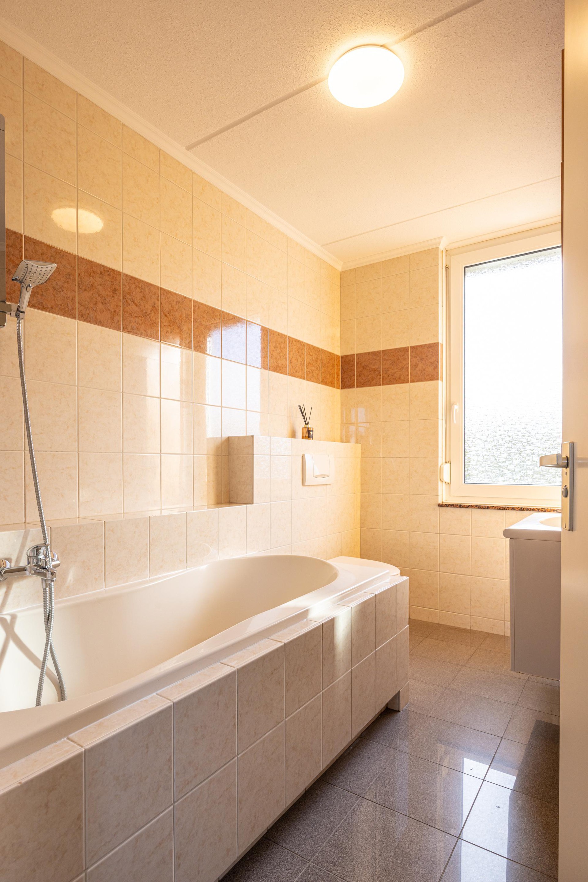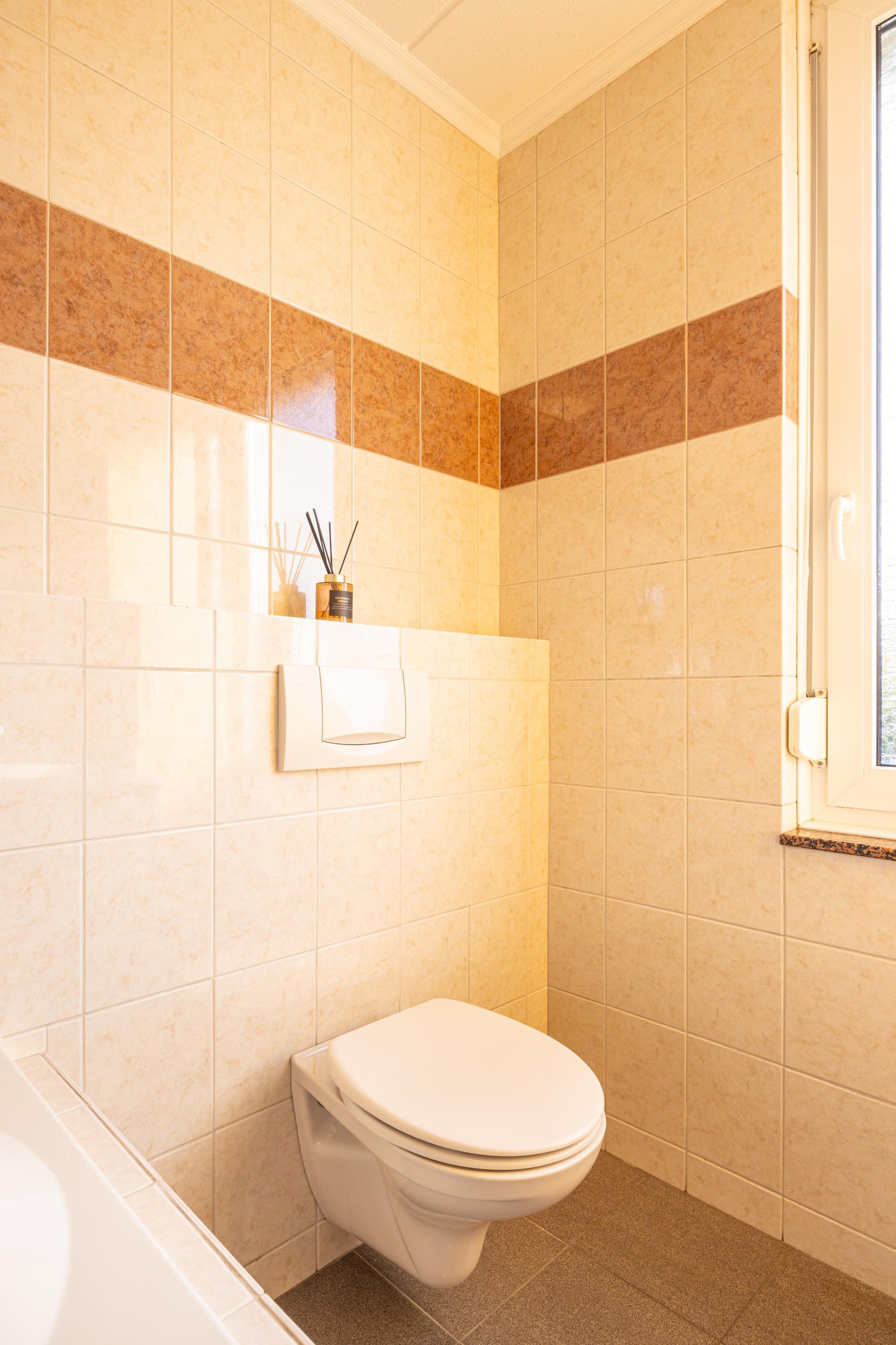 De badkamer bevindt zich eveneens op deze verdieping en is volledig betegeld. Hier vind je alles wat je nodig hebt voor dagelijks comfort: een ligbad, een zwevend badkamermeubel met wastafel en een spiegelkast met verlichting, een tweede toilet en een radiator. Het is een verzorgde en complete ruimte waar je de dag ontspannen kunt beginnen of juist rustig kunt afsluiten.