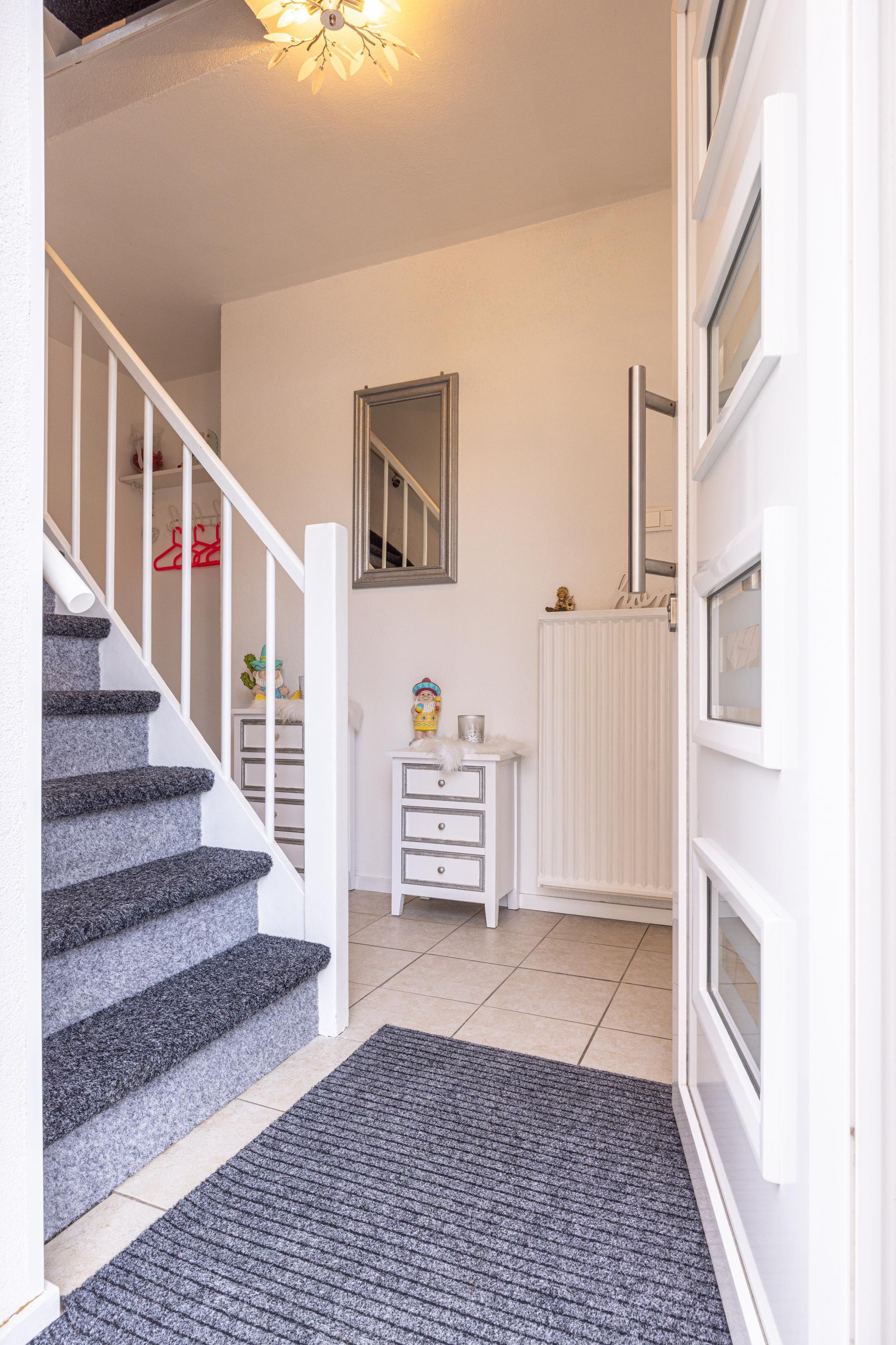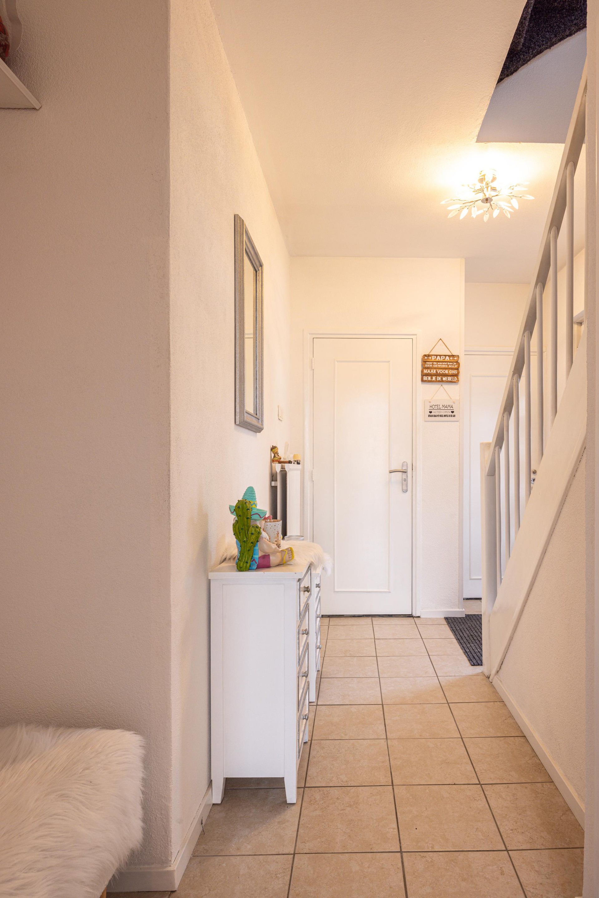 Via de voordeur kom je in de ontvangsthal met een tegelvloer. In de hal bevinden zich de garderobe, de meterkast en een berging onder de trap. Het toilet is voorzien van een zwevend closet. Vanuit de hal is er toegang tot de woonkamer en de trapopgang naar de eerste verdieping.