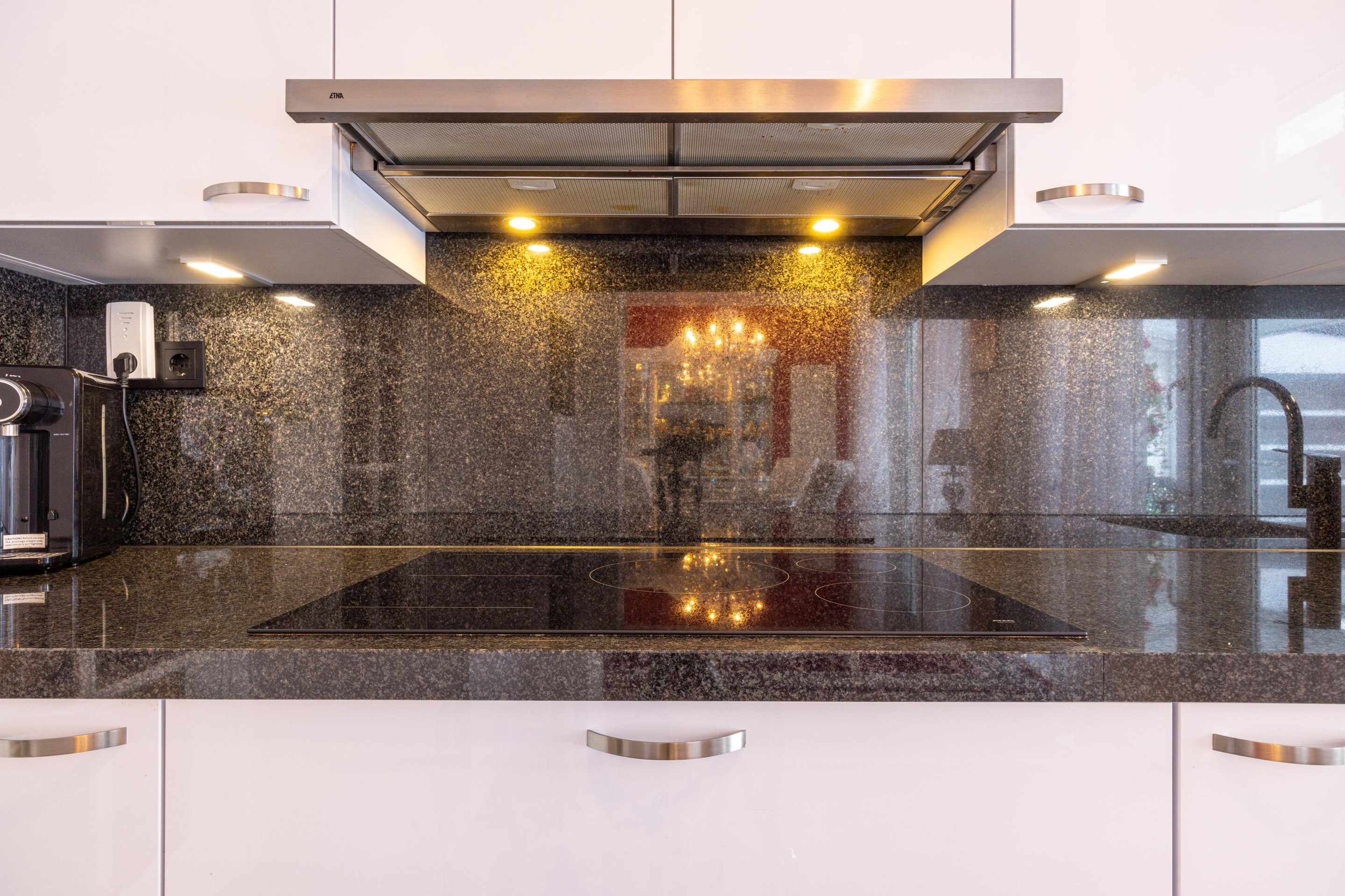 De open keuken staat in directe verbinding met de woonkamer en is in 2024 vernieuwd. Dankzij de opstelling is er een fijn zicht op de tuin en is er voldoende werk- en kastruimte beschikbaar. De keuken is uitgerust met moderne inbouwapparatuur, waaronder een inductiekookplaat met vijf zones, afzuiging, combi-heteluchtoven en een koelkast.