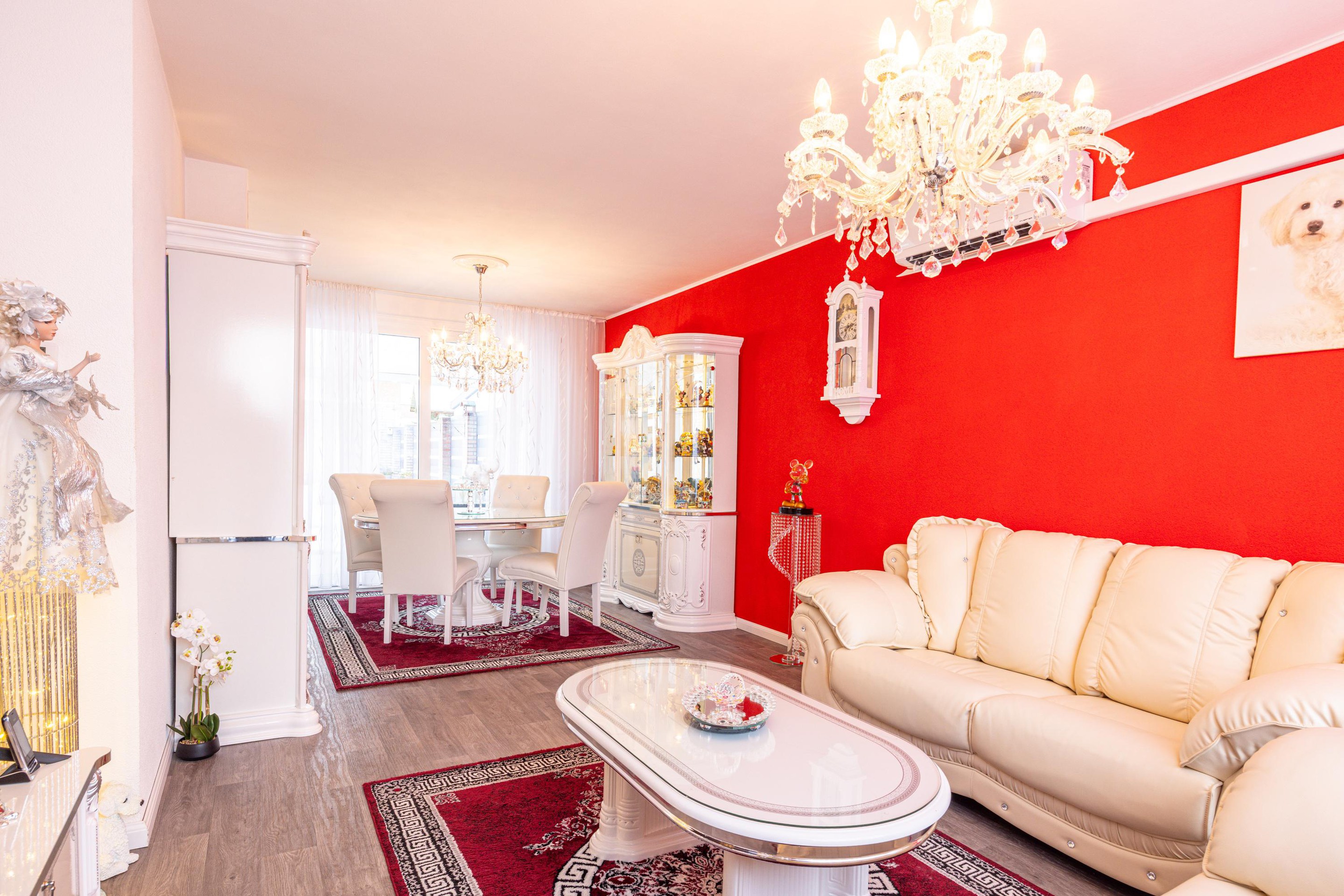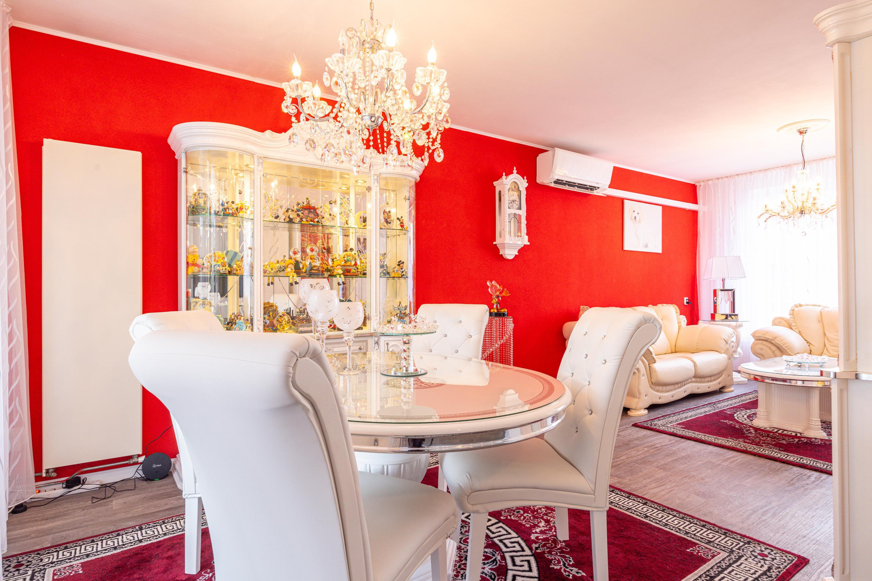De doorzonwoonkamer is afgewerkt met een linoleumvloer en beschikt over grote ramen aan zowel de voor- als achterzijde, waardoor er prettig daglicht binnenkomt. De ruimte is voorzien van een airco die zowel kan koelen als verwarmen. Daarnaast zijn de ramen uitgerust met elektrische rolluiken. Via de schuifpui is er directe toegang tot het overdekte terras in de achtertuin.