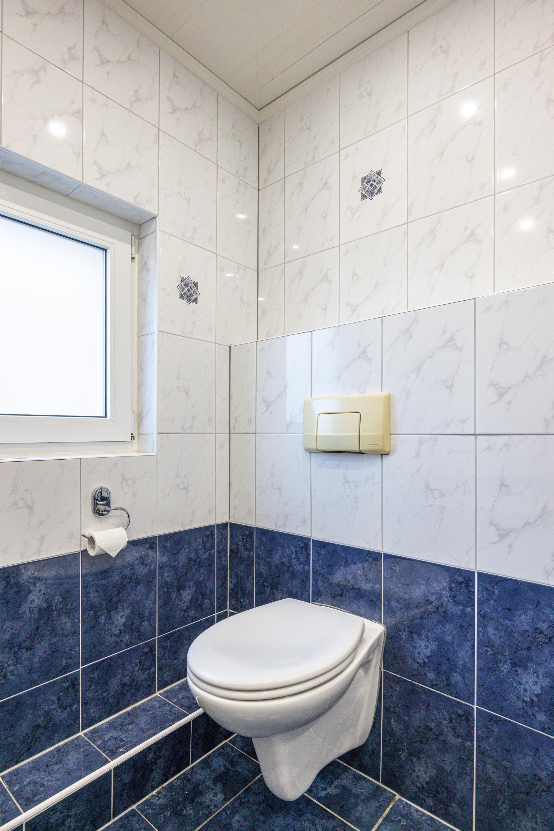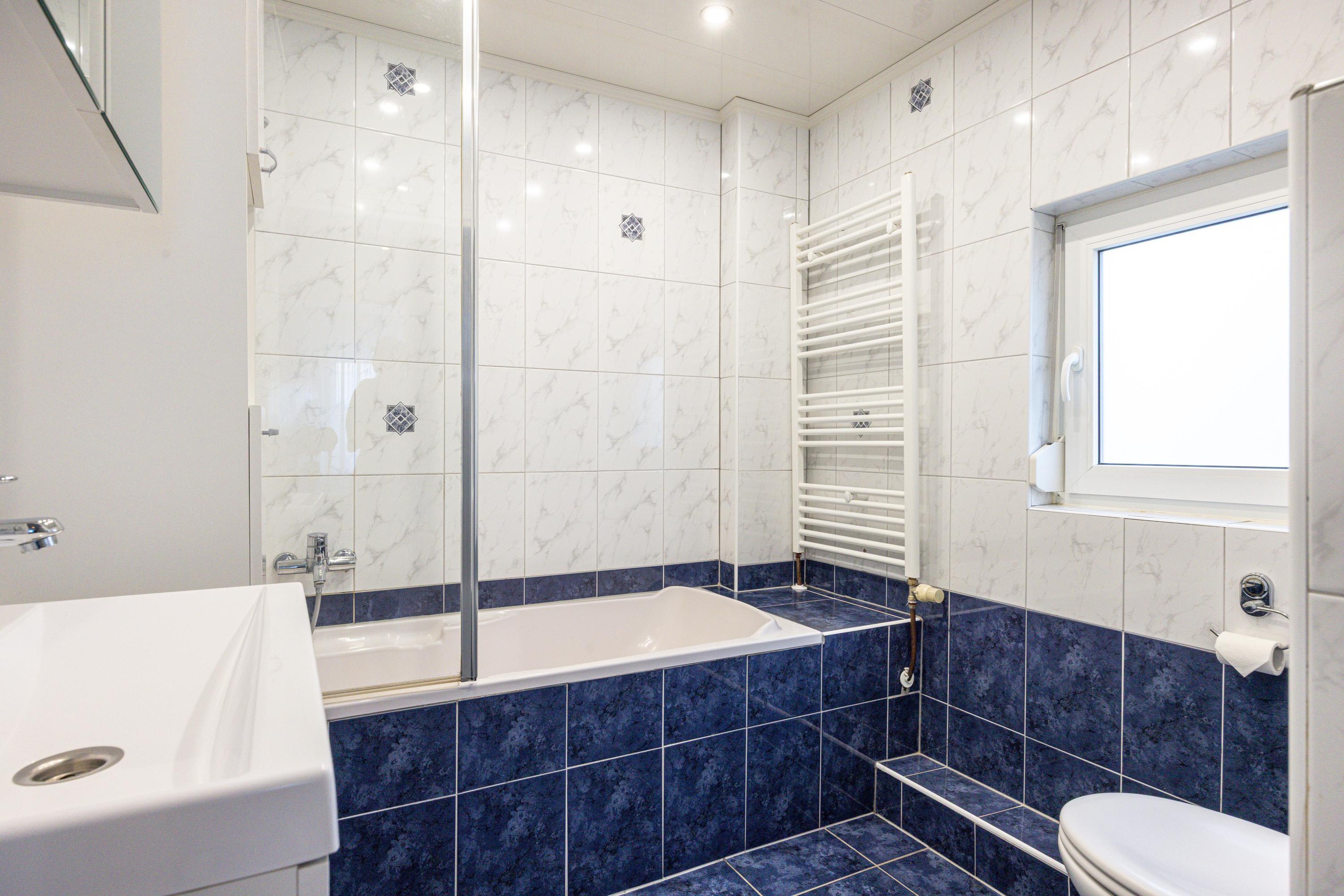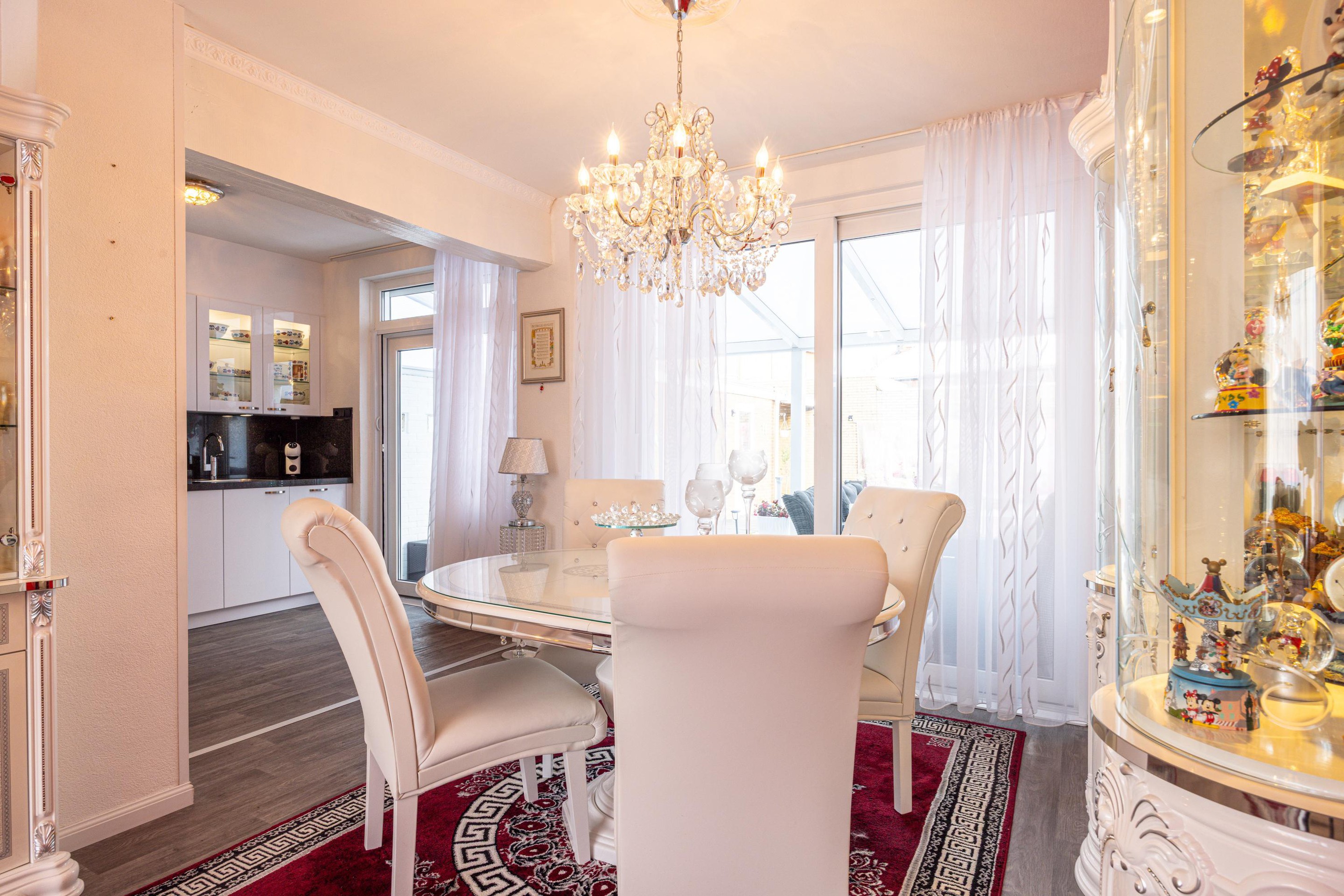 Ook vanuit de keuken is er toegang tot de achtertuin. Het raam is voorzien van een elektrisch rolluik.