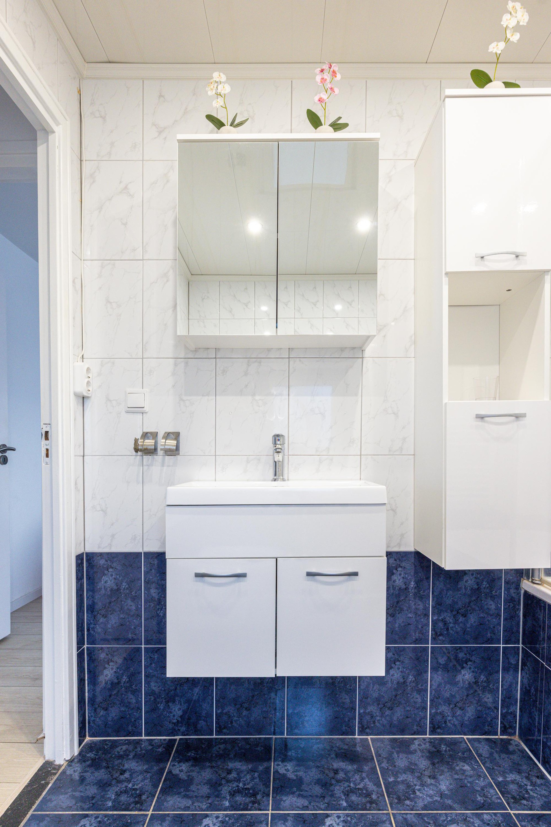 De master bedroom bevindt zich aan de voorzijde van de woning en is voorzien van een laminaatvloer en een airco die kan koelen en verwarmen. Aan de achterzijde bevinden zich twee slaapkamers, beide afgewerkt met een laminaatvloer en rolluiken. Eén van deze slaapkamers is eveneens voorzien van een airco. In beide slaapkamers aan de achterzijde zijn vaste muurkasten aanwezig. De badkamer is ingericht met een ligbad met douche, een toilet en een badkamermeubel met wastafel en spiegel. Ook in de badkamer is een rolluik aanwezig.