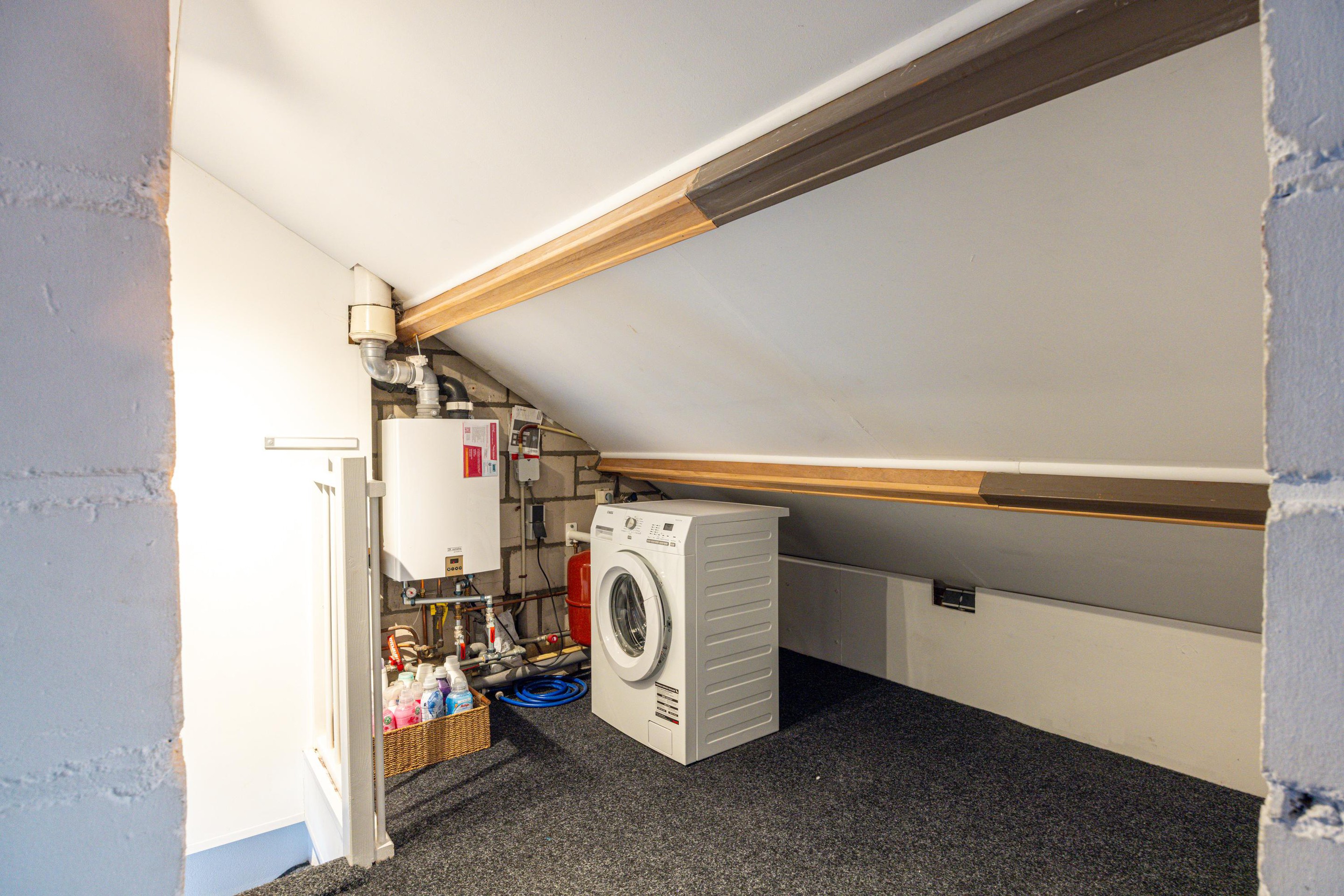 Tweede verdieping Via een vaste trap met tapijt bereik je de tweede verdieping. Deze ruimte is eveneens voorzien van vloerbedekking en biedt verrassend veel mogelijkheden. Onder de dakvlakken is extra bergruimte aanwezig. Daarnaast bevinden zich hier de cv-installatie, de omvormer van de zonnepanelen en de aansluitingen voor wasmachine en droger.