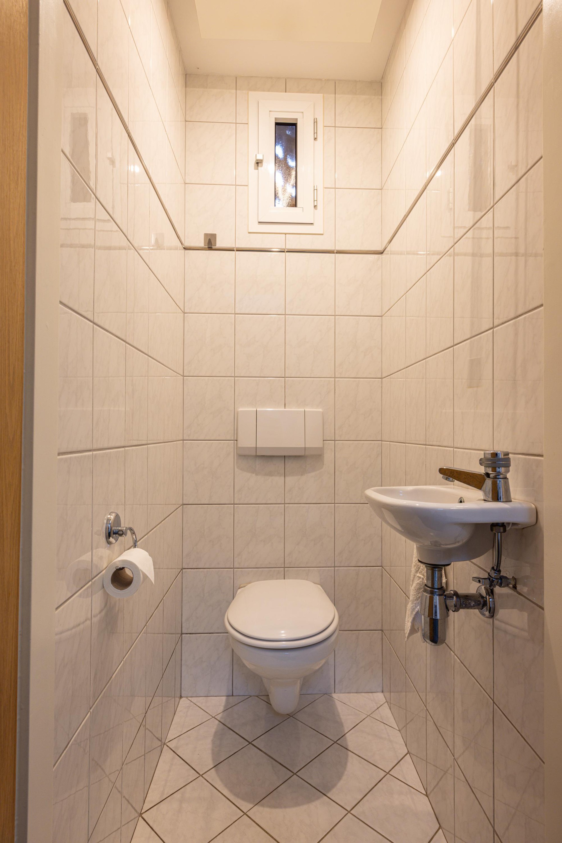 Begane grond Via de voortuin met oprit bereik je de entree van de woning en de inpandige garage met openslaande deuren. Bij binnenkomst kom je in de ontvangsthal, afgewerkt met een grindvloer en met een garderobe. Hier bevinden zich de meterkast en het volledig betegelde, zwevende toilet met fonteintje. Dankzij het raam met kunststof kozijn is er natuurlijke ventilatie en prettig daglicht aanwezig.