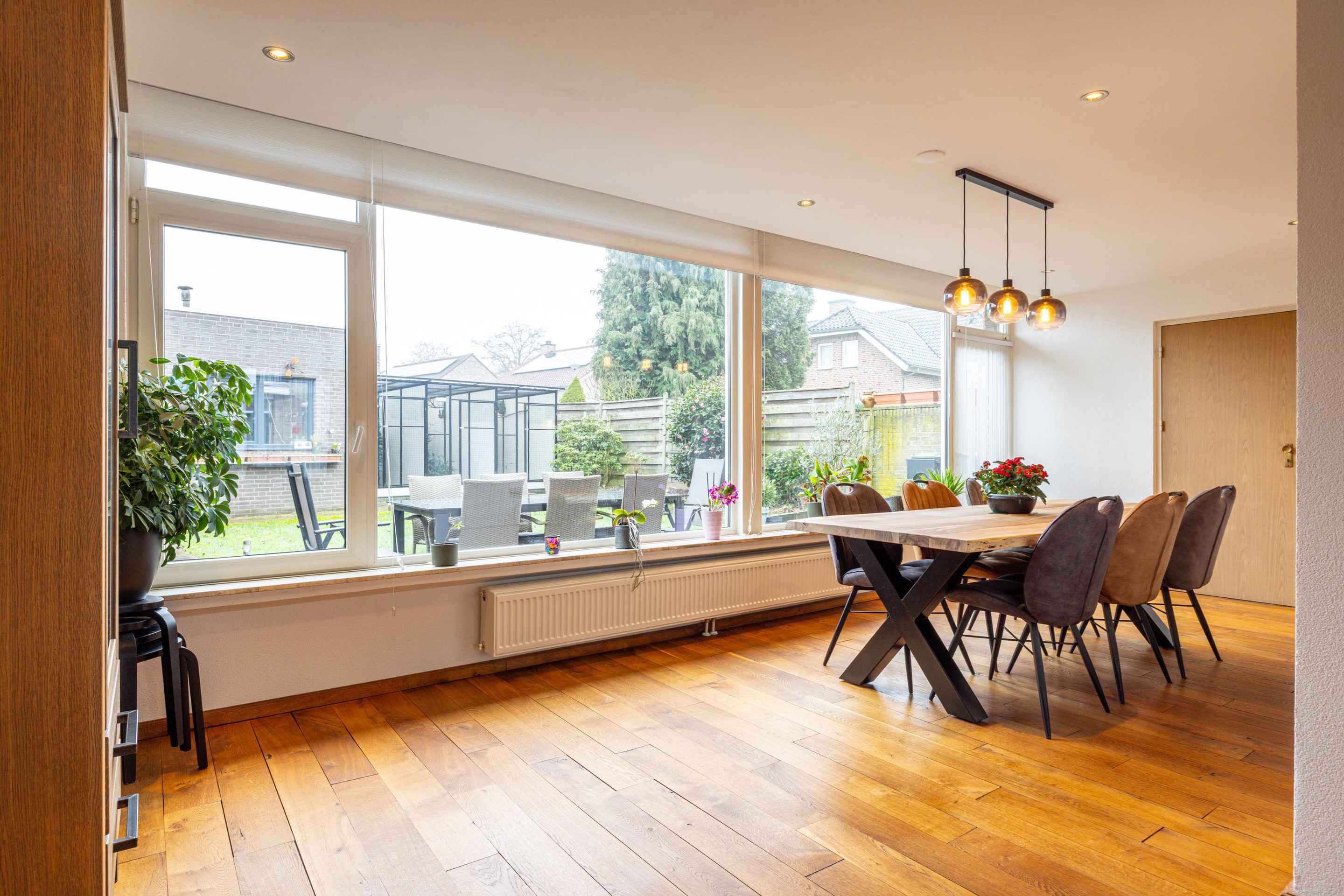 De eetkamer biedt via een grote raampartij en een loopdeur directe toegang tot de achtertuin. Hierdoor staan binnen en buiten in een prettige verbinding met elkaar en is het eenvoudig om op zonnige dagen de tuin bij de leefruimte te betrekken.