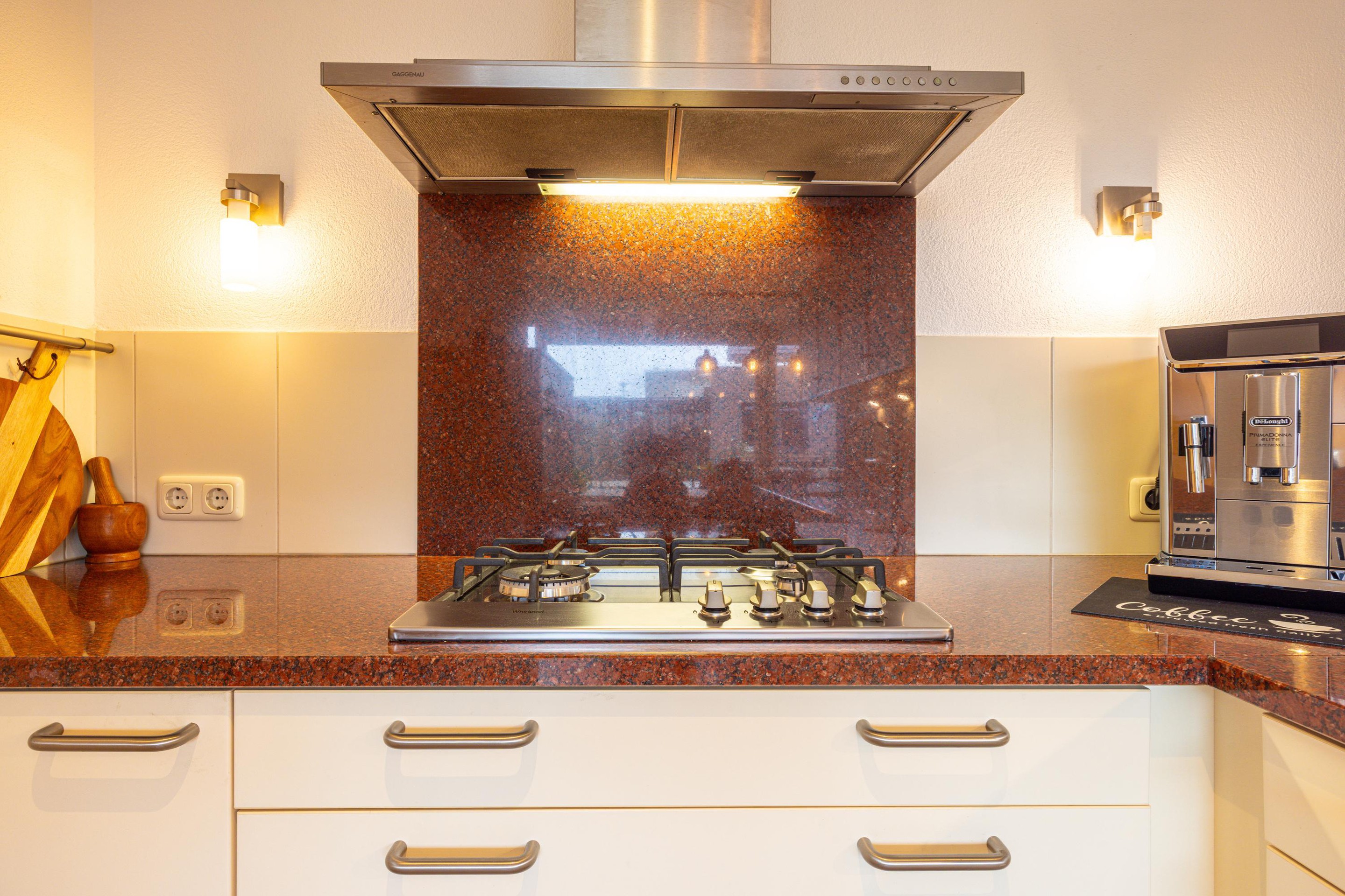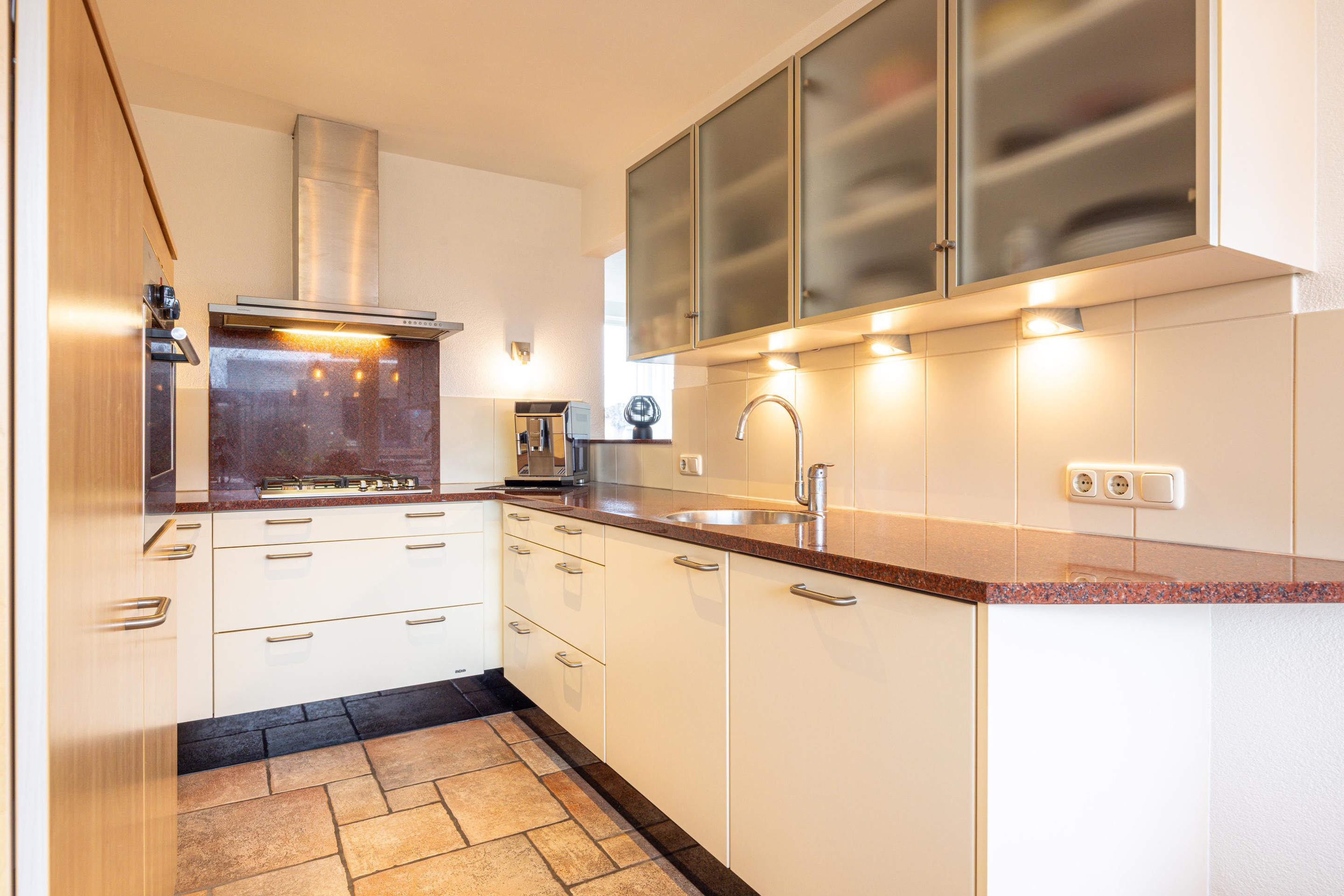 De halfopen keuken sluit praktisch aan op de eetkamer en beschikt over voldoende kast- en werkruimte. De keuken is voorzien van een 4-pits gasfornuis, afzuigkap, heteluchtoven, koelkast en vaatwasser. Een functionele en overzichtelijke ruimte waar koken prettig en efficiënt verloopt.